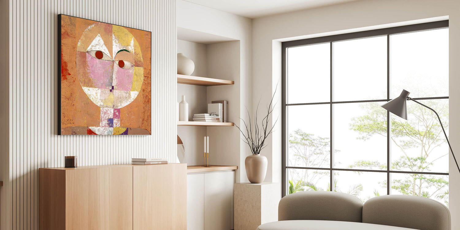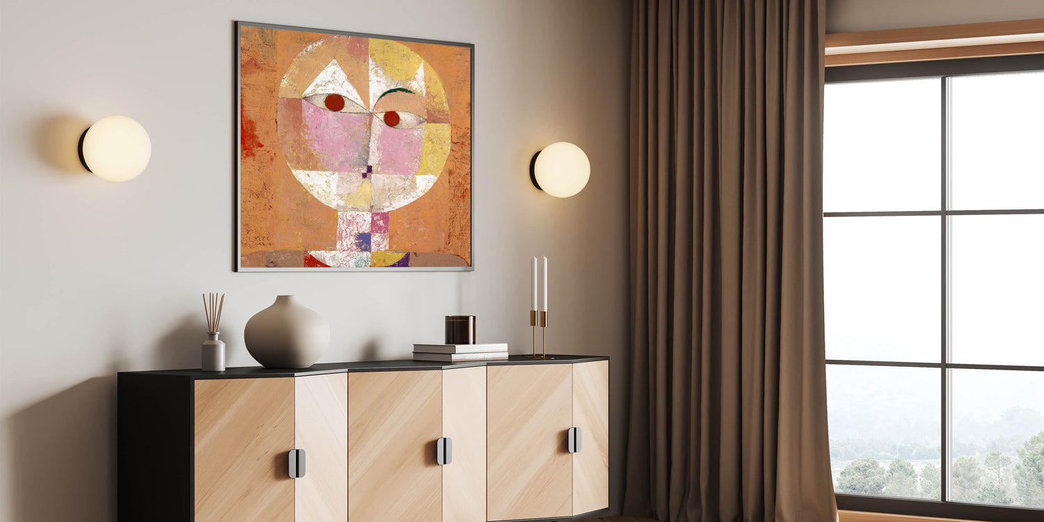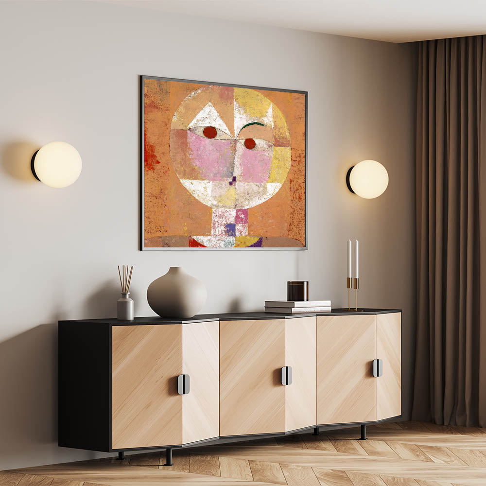 Own one of Paul Klee’s most iconic works, "Senecio," created in 1922. This abstract portrait, with its geometric shapes and vibrant colors, represents Klee’s mastery of modernist and avant-garde techniques. The captivating blend of warm oranges, reds, and soft pinks creates a visually stunning composition that’s both playful and thought-provoking. Whether you’re a seasoned art collector or just looking to add a touch of modernist sophistication to your space, this print is a timeless addition to any room. Our Paul Klee artworks for sale are available in various formats such as stretched canvas, framed prints, and acrylic glass.