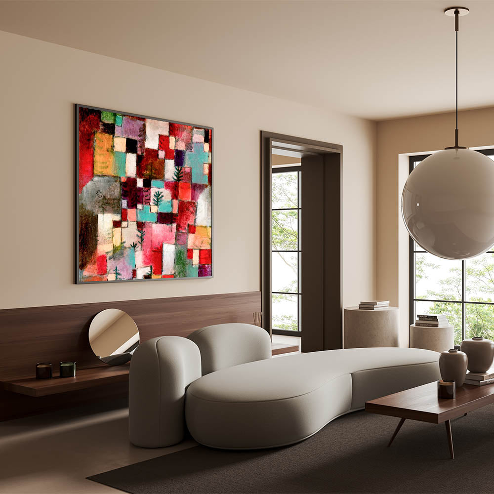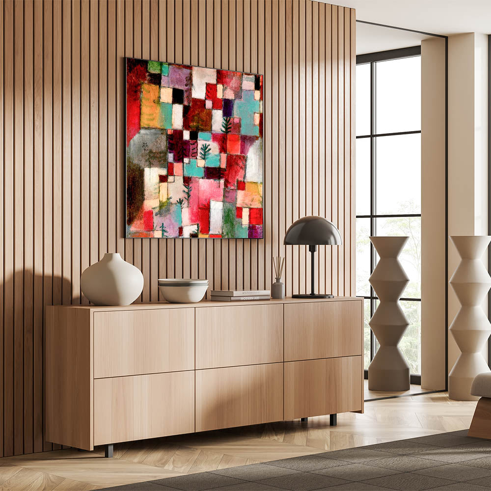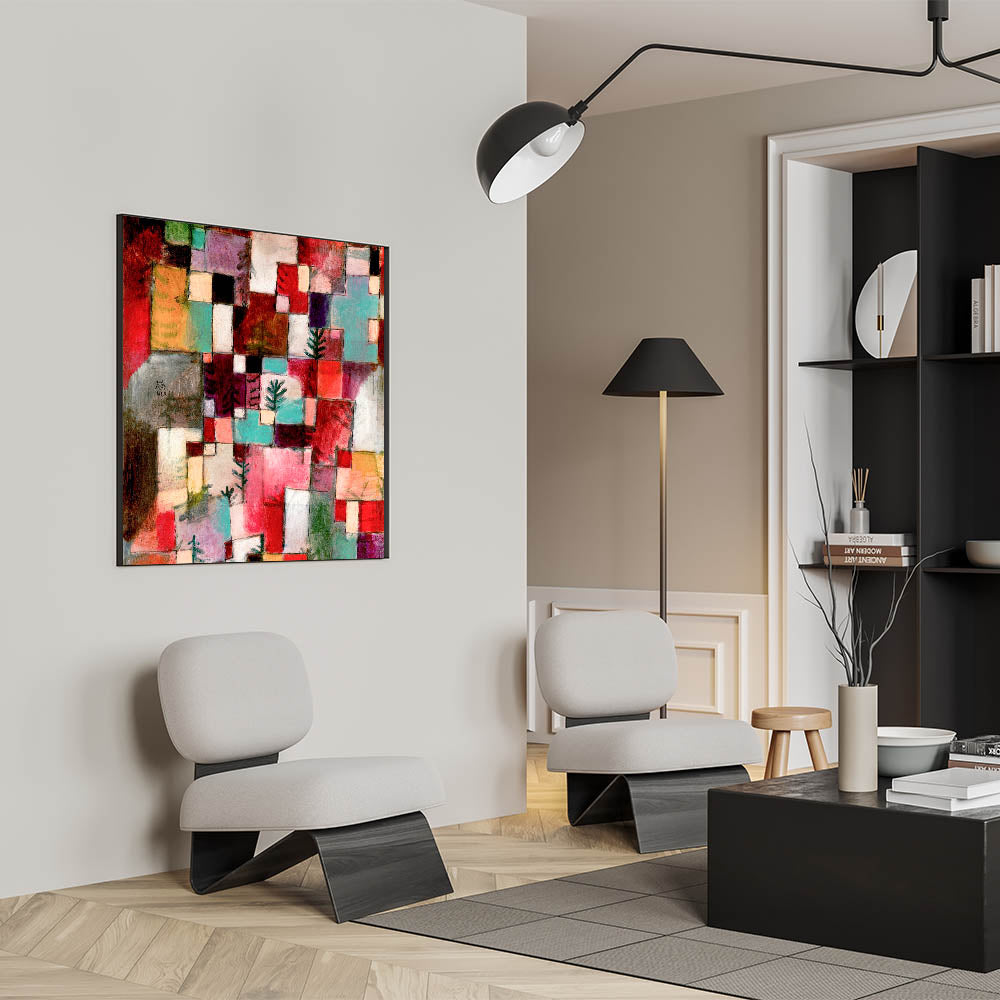Bring life and color to your home with this vibrant geometric artwork by Paul Klee. Painted in 1920, this piece is a striking composition of bold colors and abstract forms. The interplay of rich reds, greens, and purples gives the artwork an energetic yet harmonious feel, making it perfect for art lovers who appreciate modernist and avant-garde design. Whether you choose a stretched canvas, framed canvas, or acrylic glass, this Paul Klee artwork will make a stunning focal point in any room.