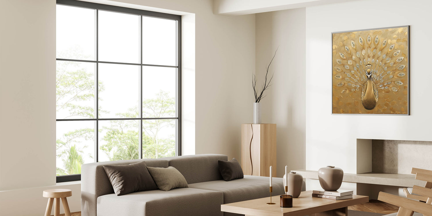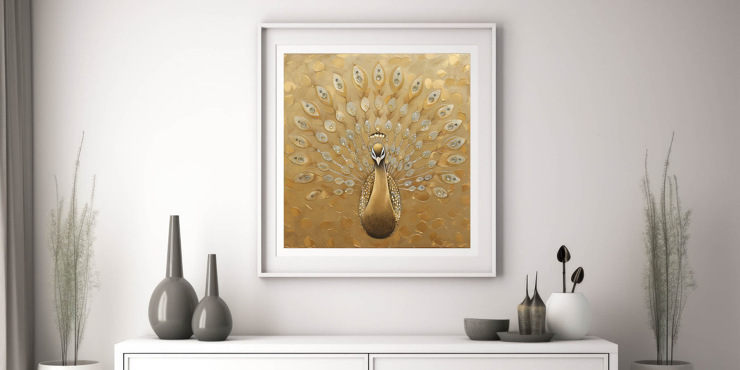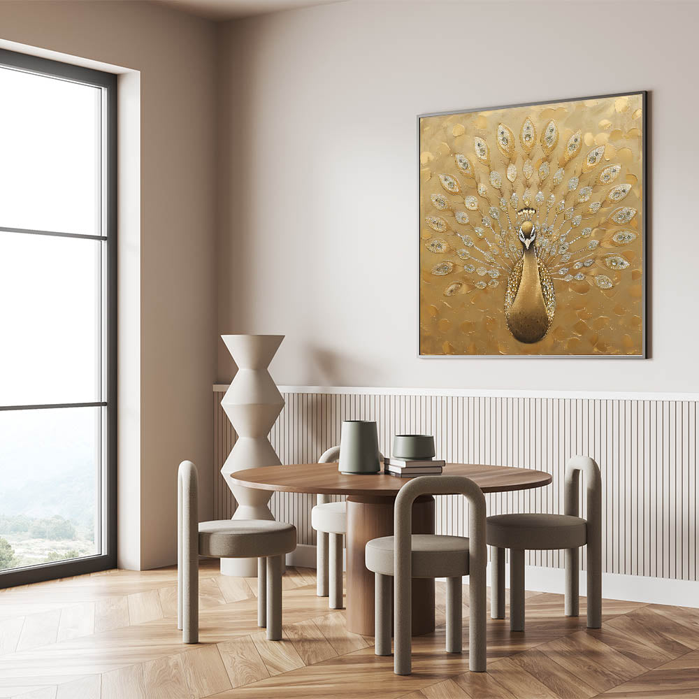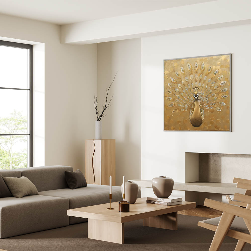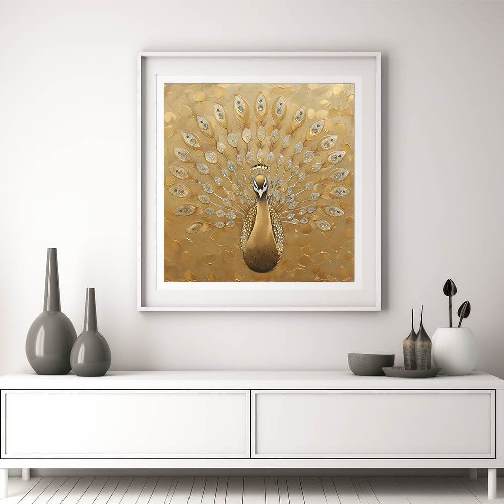 Introduce a touch of opulence to your home with this stunning Golden Peacock Wall Art. This artwork features a majestic peacock adorned in rich gold tones, with intricate detailing that adds a sense of luxury and elegance to any space. The shimmering gold accents and the peacock's proud stance make this piece a true statement of sophistication and style.