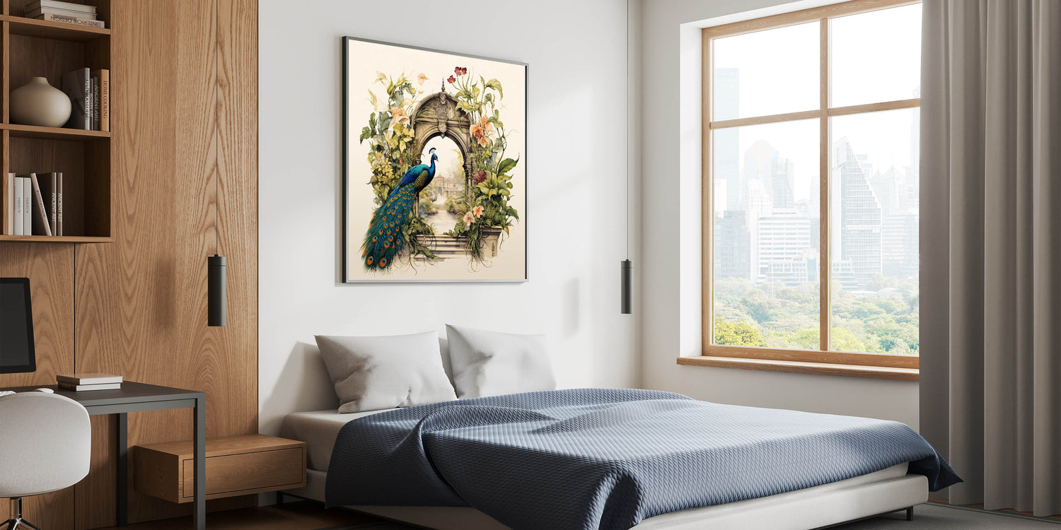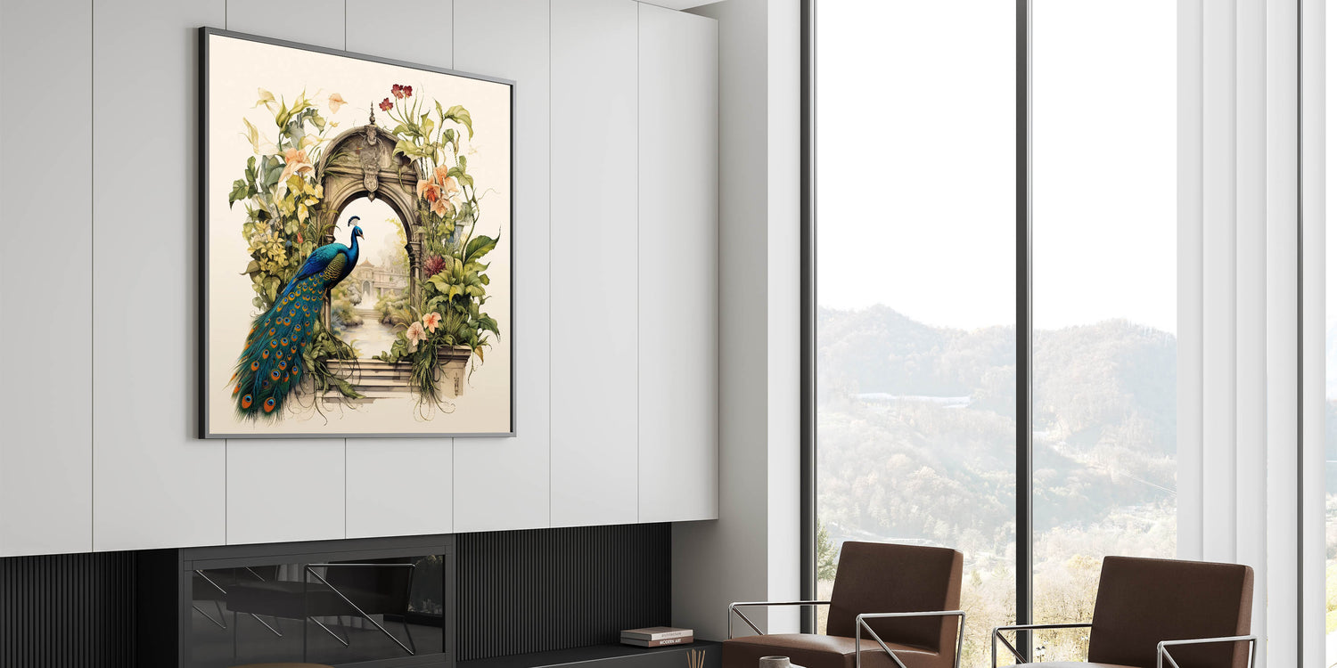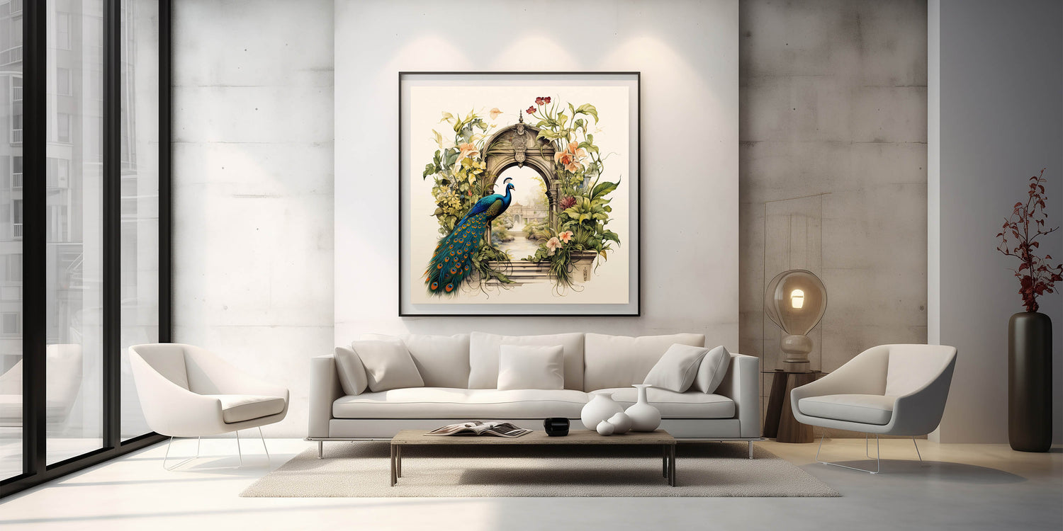 Bring a touch of serenity and elegance to your home with this Serene Peacock Garden Wall Art. This beautiful piece showcases a vibrant peacock perched gracefully by an ornate archway, surrounded by lush greenery and delicate flowers. The detailed design, combined with soft, natural colors, creates a tranquil scene that invites relaxation and adds a sophisticated charm to any space. Available in multiple formats, including stretched canvas, framed canvas, acrylic glass, and rolled prints, this artwork is versatile and can complement both classic and contemporary decor styles.