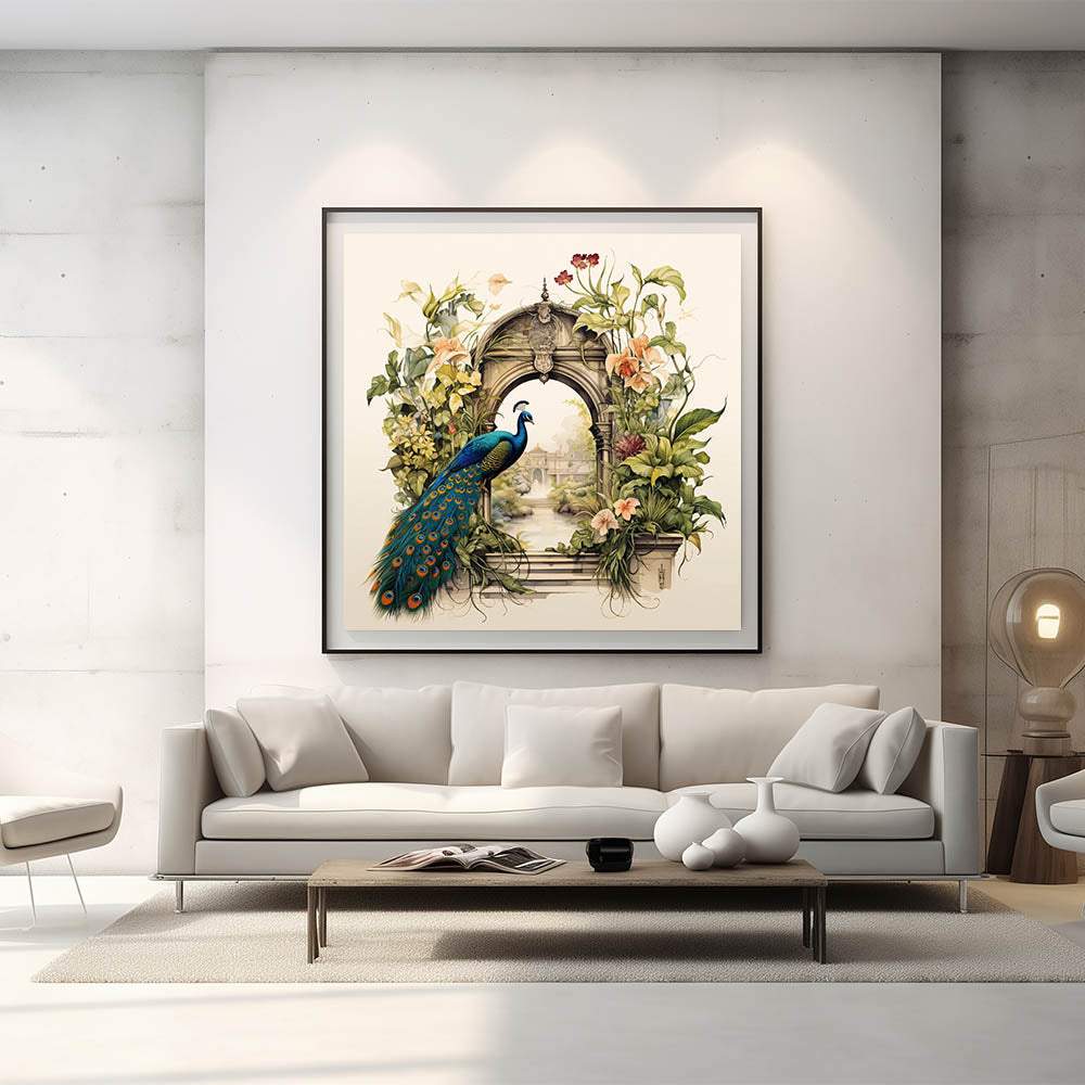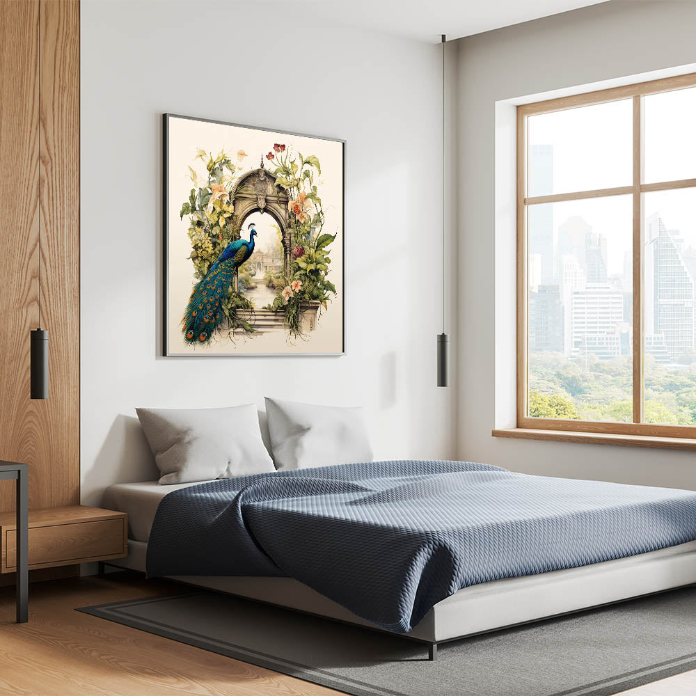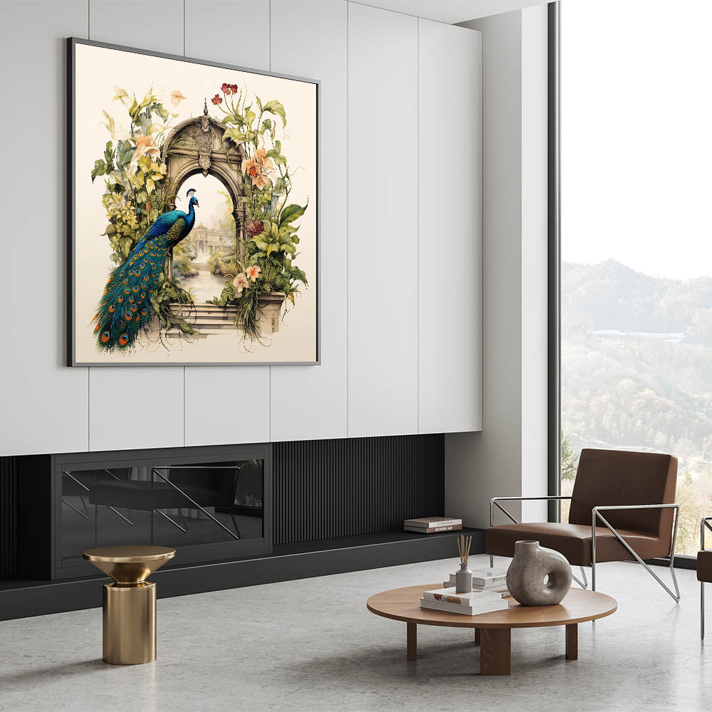 Serene Peacock Garden Wall Art - Elegant Peacock Archway Canvas Print