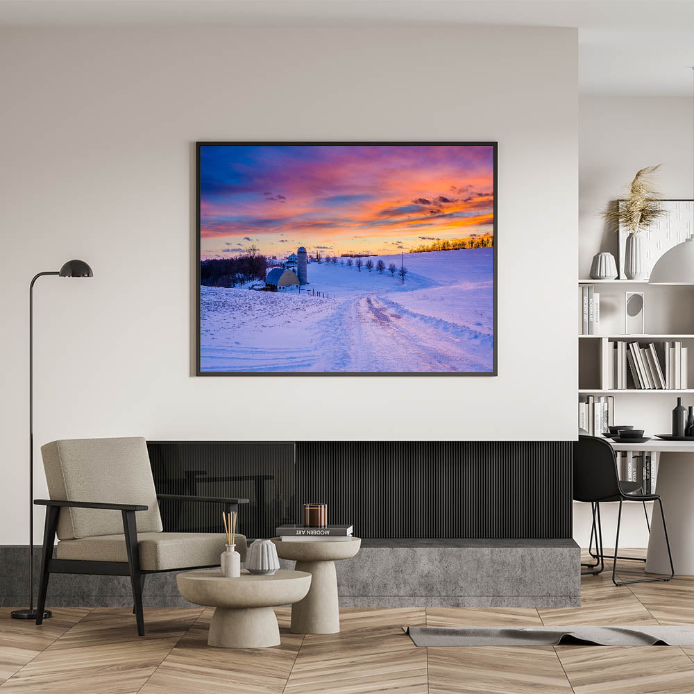 Capture the peaceful beauty of Pennsylvania’s winter countryside with this stunning framed art showcasing a snowy farm landscape at sunset. This high-quality Pennsylvania scenic view features a soft winter sky painted with hues of pink, orange, and purple, contrasting beautifully with the white snow-covered fields. The quiet farm, complete with a barn and silo, creates a serene and nostalgic scene, making this artwork the perfect addition to your home decor.