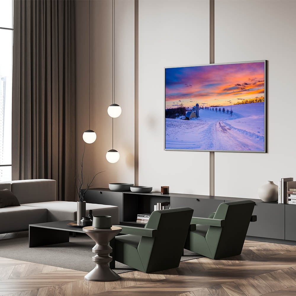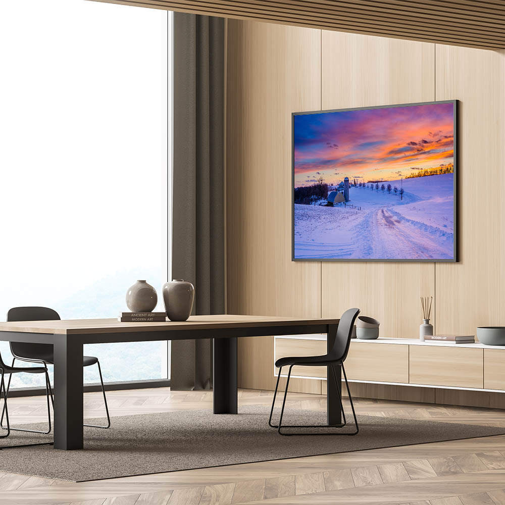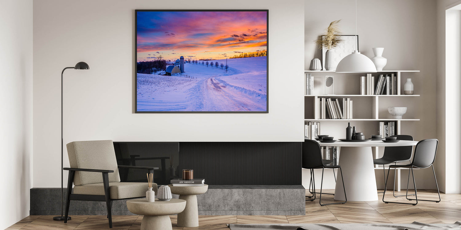 Bring the serene charm of Pennsylvania’s winter sunsets into your living space with this handcrafted Pennsylvania artwork. Whether you prefer canvas or framed prints, this piece will bring warmth and tranquility to any room, offering a unique glimpse of the state’s scenic farmlands during the colder months.