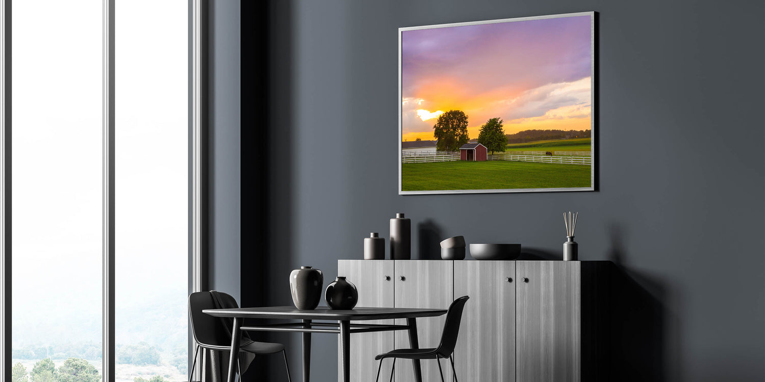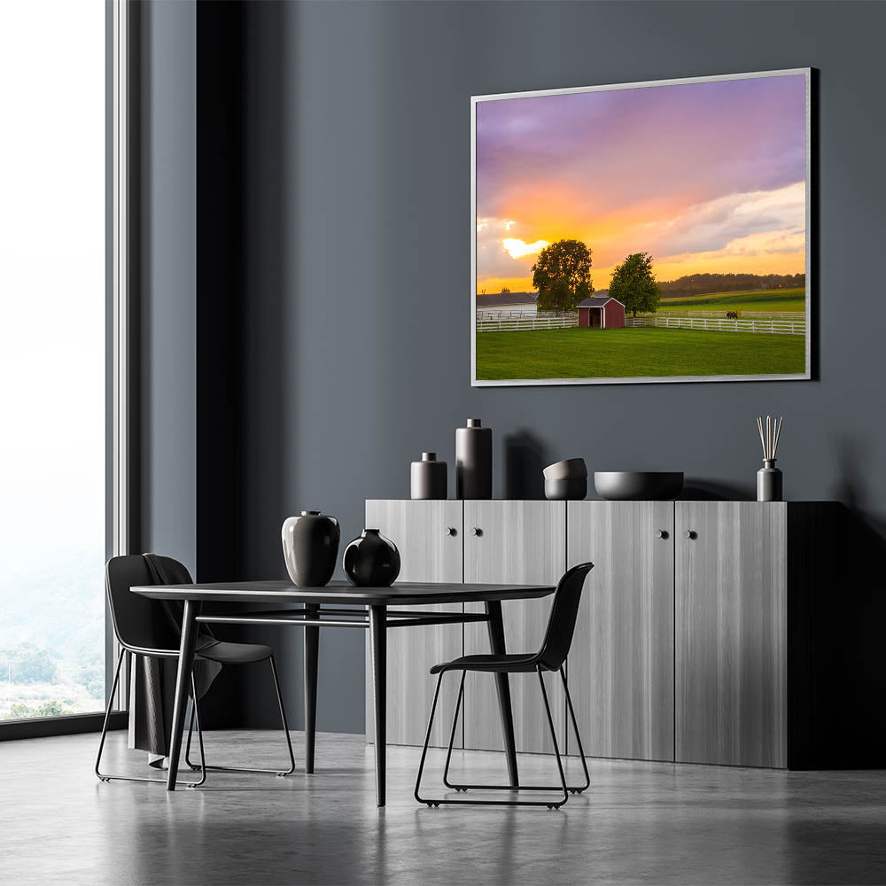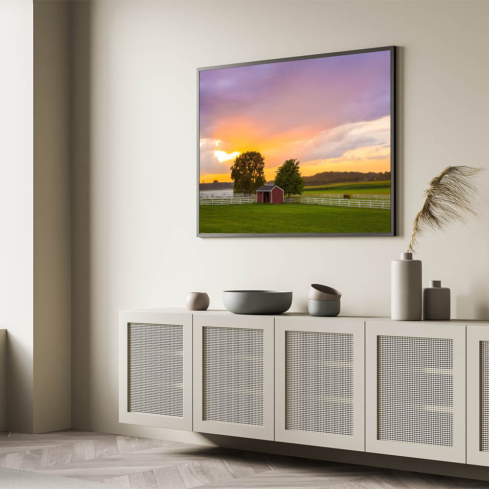 Transform your space with the serene beauty of Pennsylvania's farmlands captured in this stunning landscape art. Featuring a peaceful farm at sunset, this high-quality Pennsylvania landscape art captures the warm, golden hues of the setting sun, casting a soft glow over the green fields and rustic barn. The tranquil scene is perfect for adding a touch of countryside charm to any home or office.