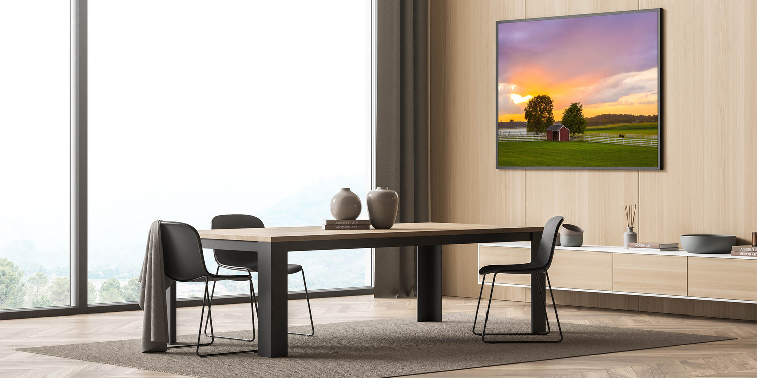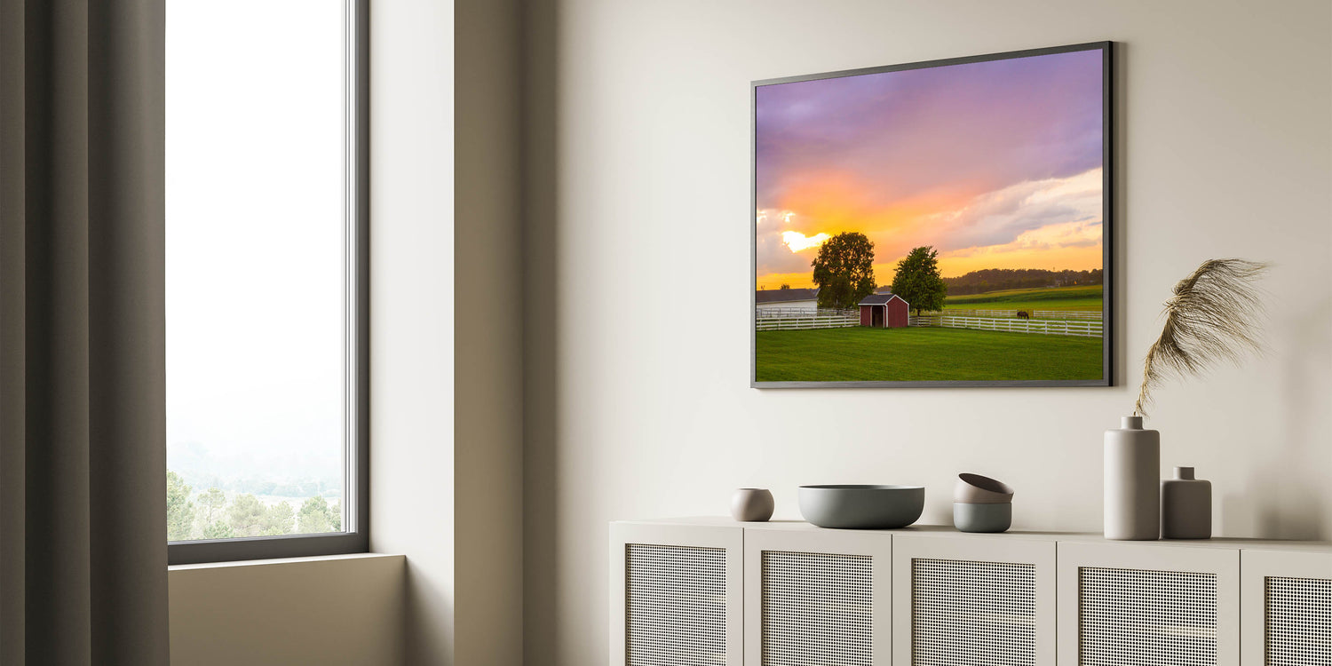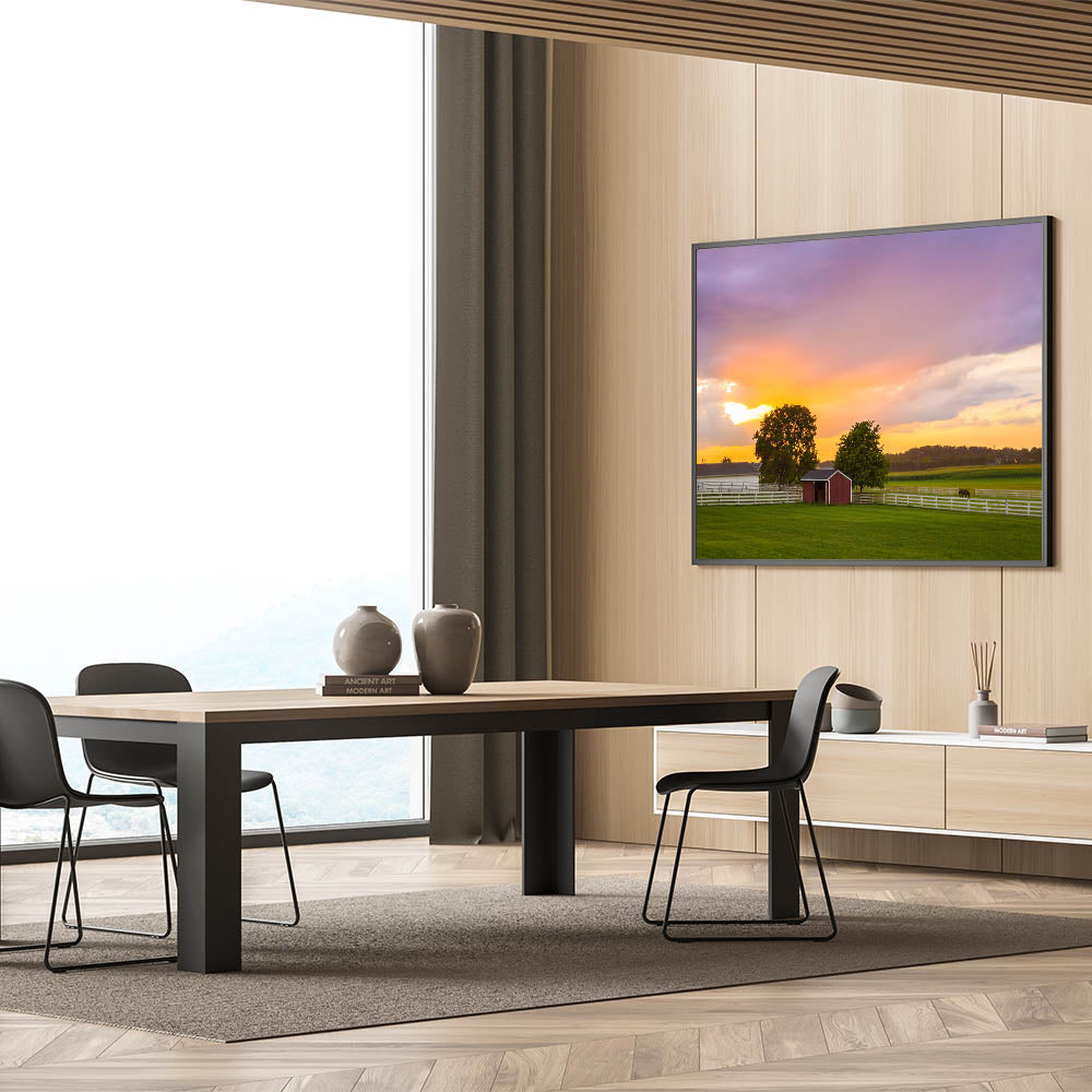 Transform your space with the serene beauty of Pennsylvania's farmlands captured in this stunning landscape art. Featuring a peaceful farm at sunset, this high-quality Pennsylvania landscape art captures the warm, golden hues of the setting sun, casting a soft glow over the green fields and rustic barn. The tranquil scene is perfect for adding a touch of countryside charm to any home or office.