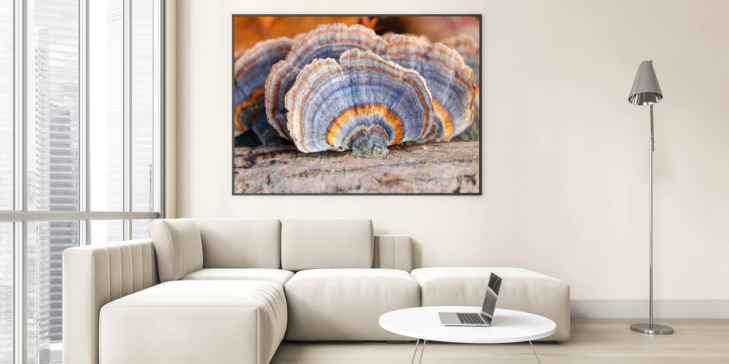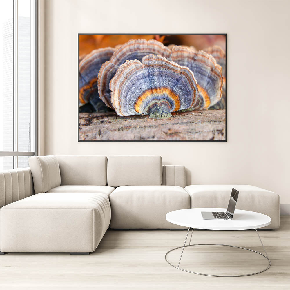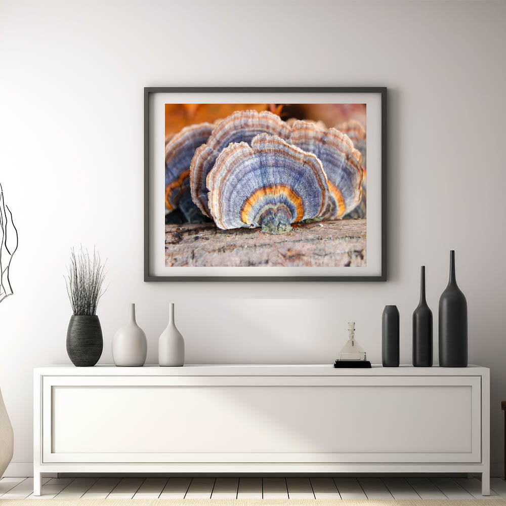 Add a touch of nature's intricate beauty to your space with this stunning close-up of vibrant mushroom patterns. This high-quality Pennsylvania nature art captures the detailed layers and colors of the mushroom’s natural form, featuring shades of blue, orange, and earthy tones that create an eye-catching and unique piece of wall decor. Perfect for those who appreciate the fine details of nature, this artwork will bring a fresh and organic feel to any room.
