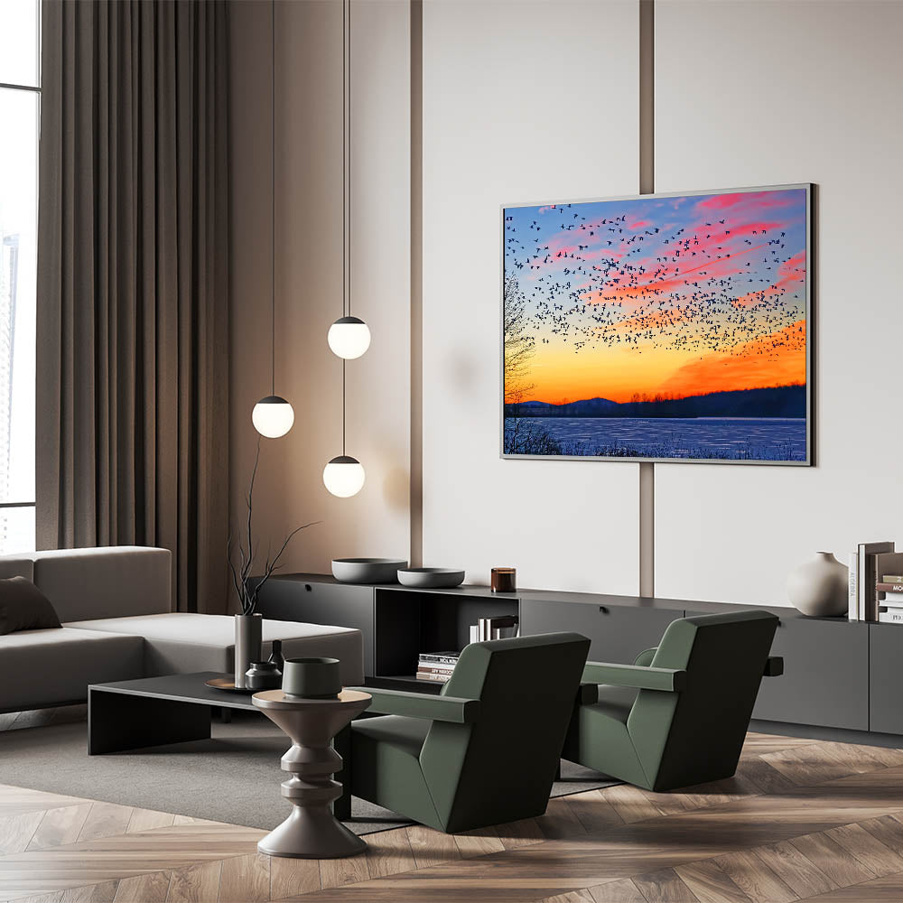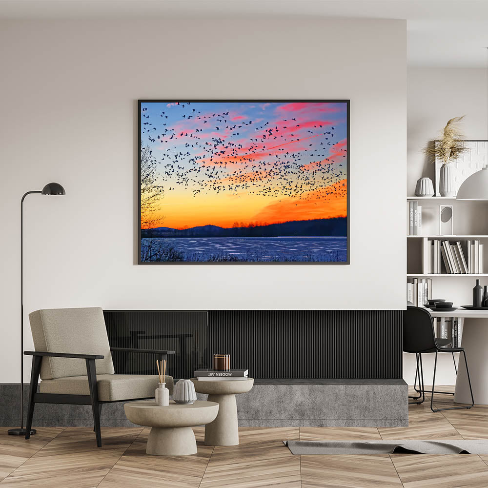 Bring the beauty of Pennsylvania’s skies into your home with this stunning nature art featuring a flock of birds against a vibrant sunset sky. This high-quality Pennsylvania nature art captures the movement of birds in flight as the colorful hues of orange, pink, and blue paint the sky. Perfect for adding a dramatic yet peaceful touch to any room, this artwork embodies the serene beauty of Pennsylvania’s natural landscapes.