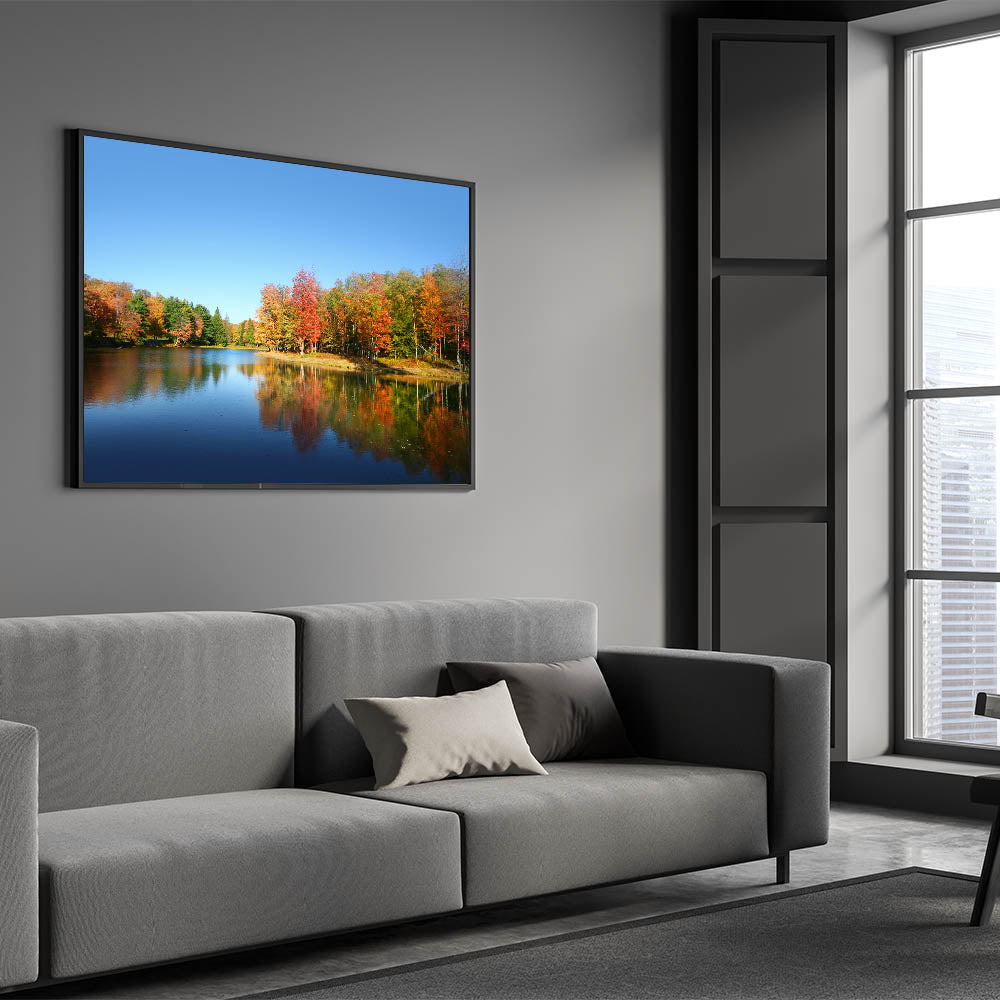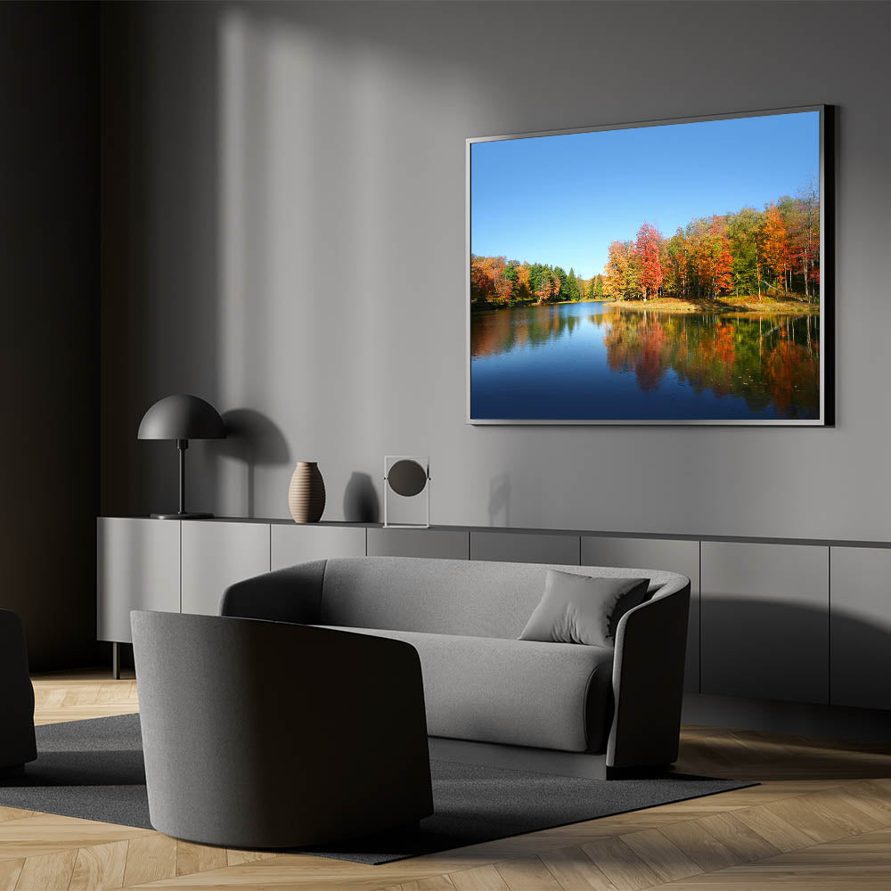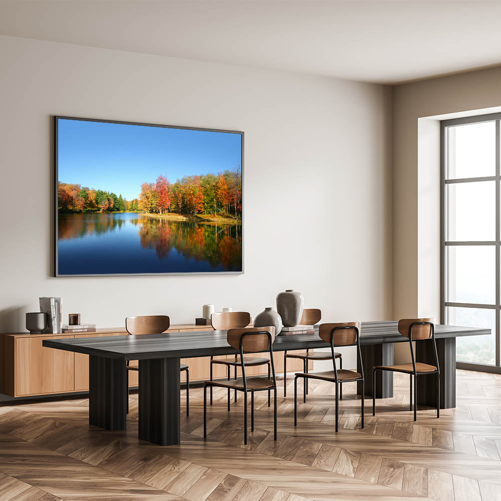 Celebrate the beauty of Pennsylvania's autumn season with this stunning piece of wall art. Featuring a peaceful lake surrounded by vibrant fall foliage, this high-quality Pennsylvania photography captures the essence of nature's seasonal transformation. The reflection of colorful trees on the calm water adds a sense of serenity, making this artwork a perfect addition to any home or office.