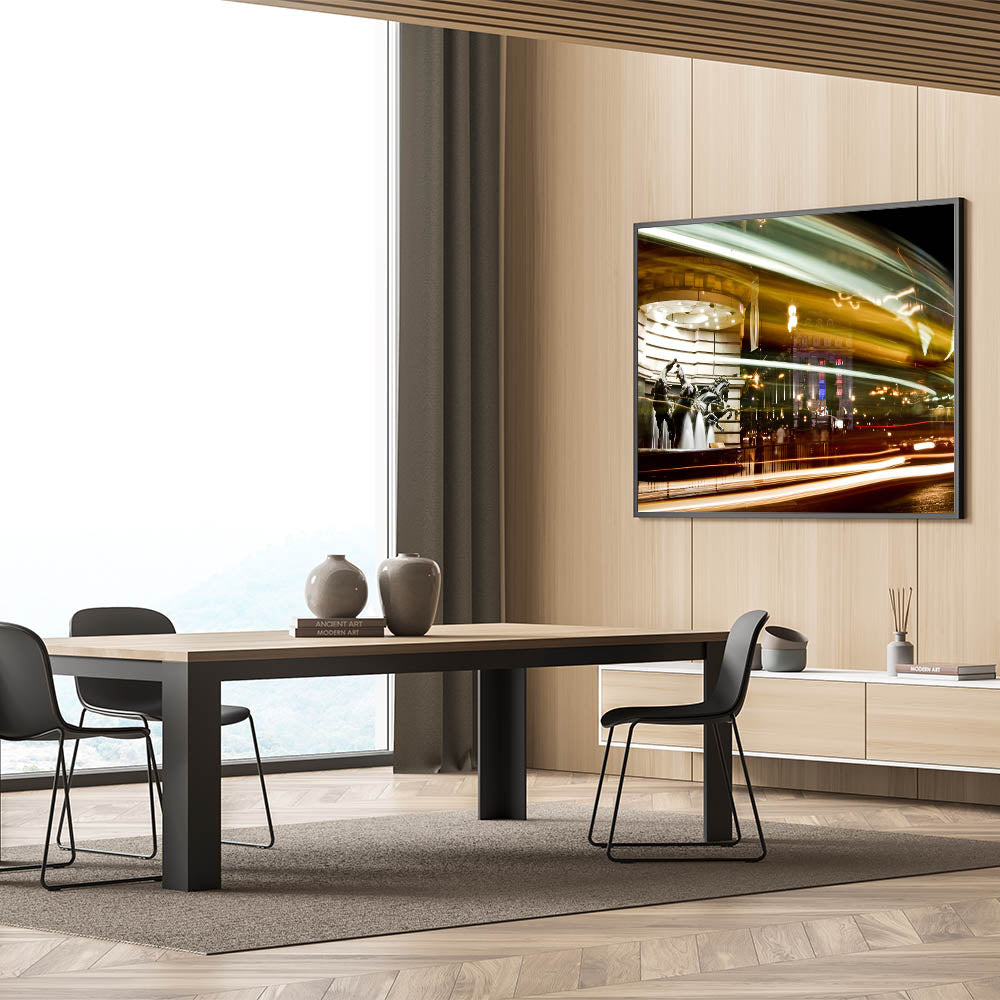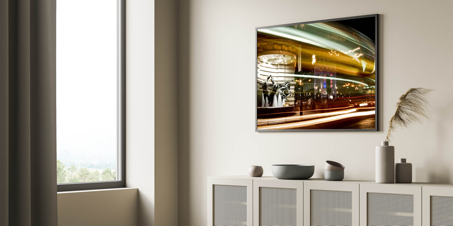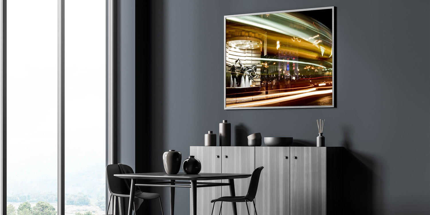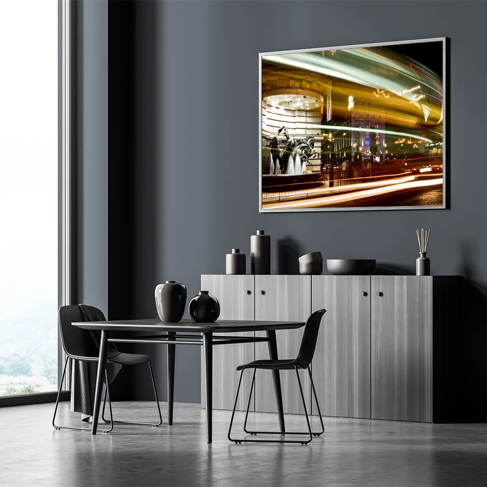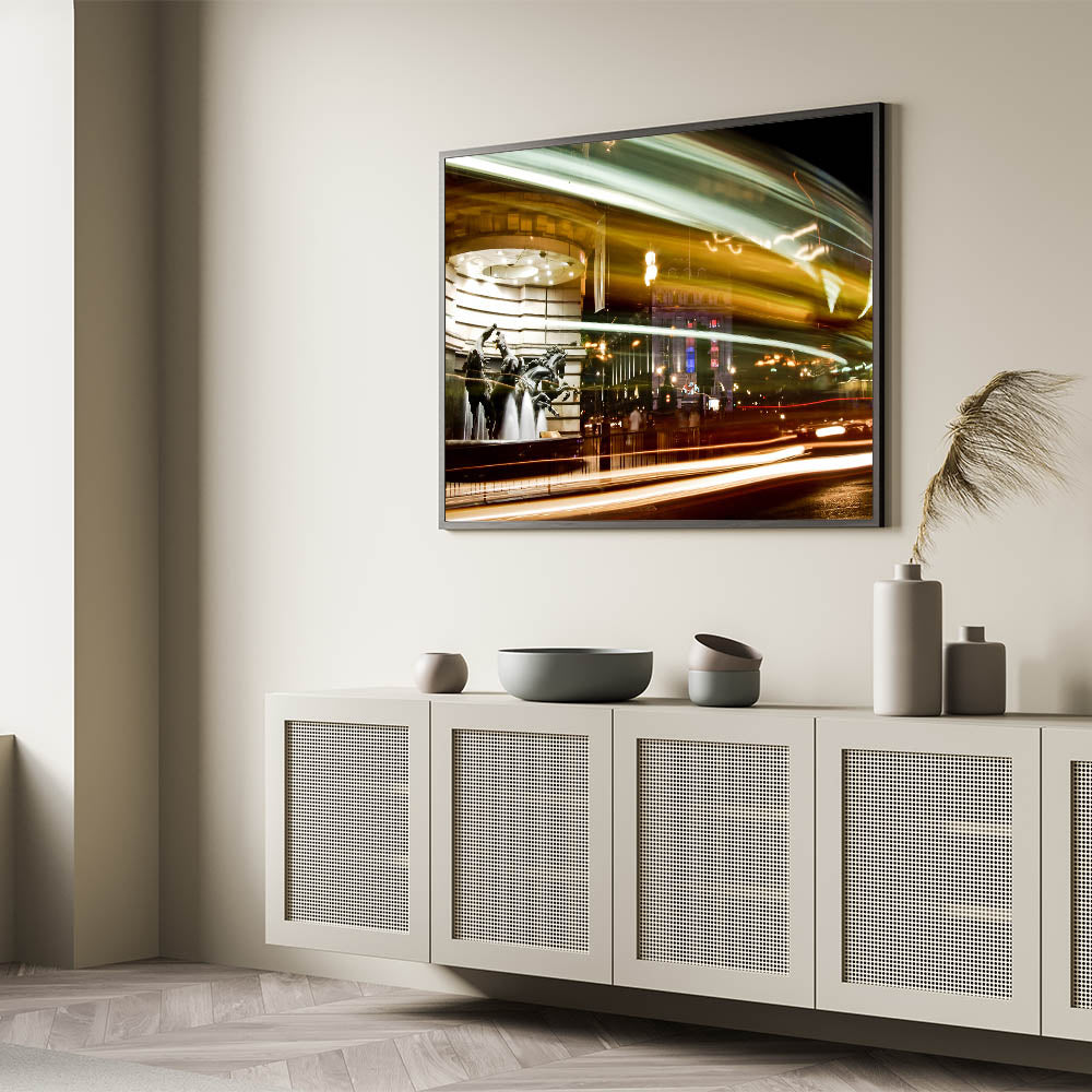 Experience the dynamic energy of London with this captivating Piccadilly wall art. This piece highlights the vibrant nighttime movements of Piccadilly Circus, showcasing the famous horses statue surrounded by the flowing lights of the bustling city. The blend of light trails and the iconic fountain creates an eye-catching and energetic composition, perfect for lovers of London cityscapes.