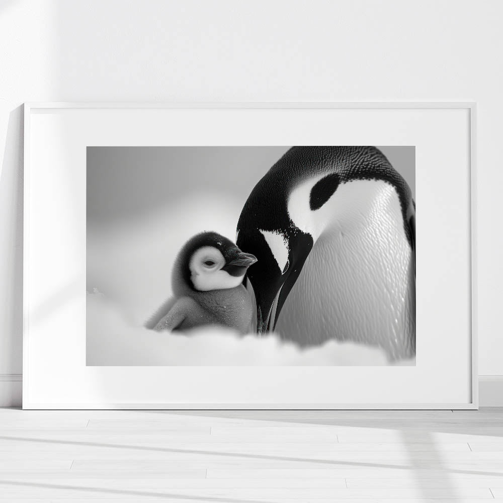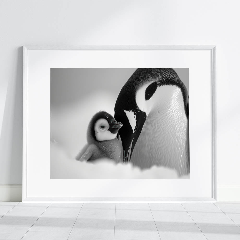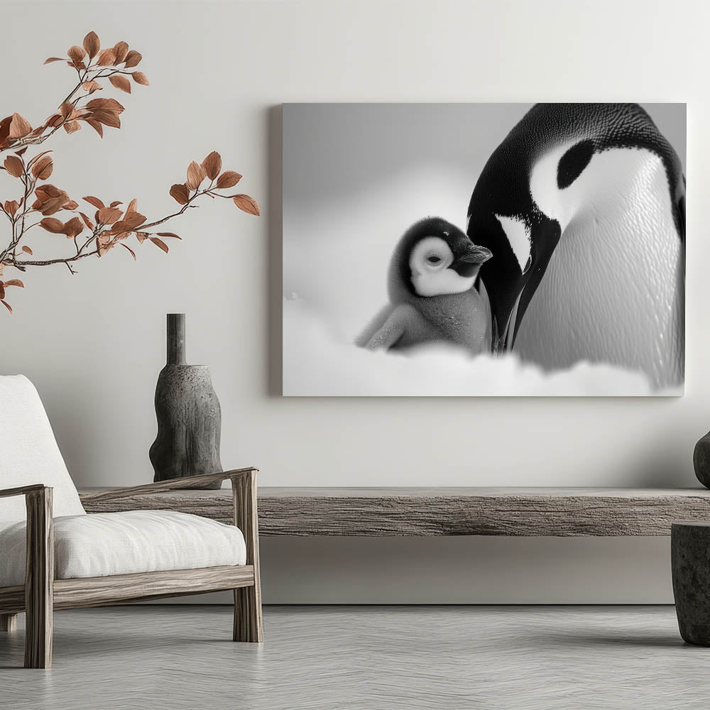Embrace the serene elegance of the Arctic with this stunning black and white penguin wall art. This captivating piece showcases a tender moment between an adult penguin and its chick, beautifully captured in a monochromatic palette. The subtle shades of black, white, and gray make this artwork a perfect addition to any modern or minimalist decor.
