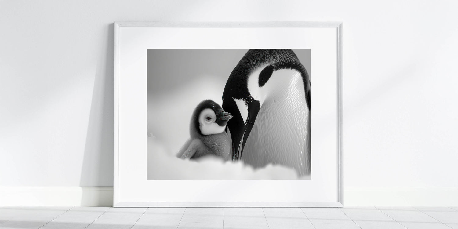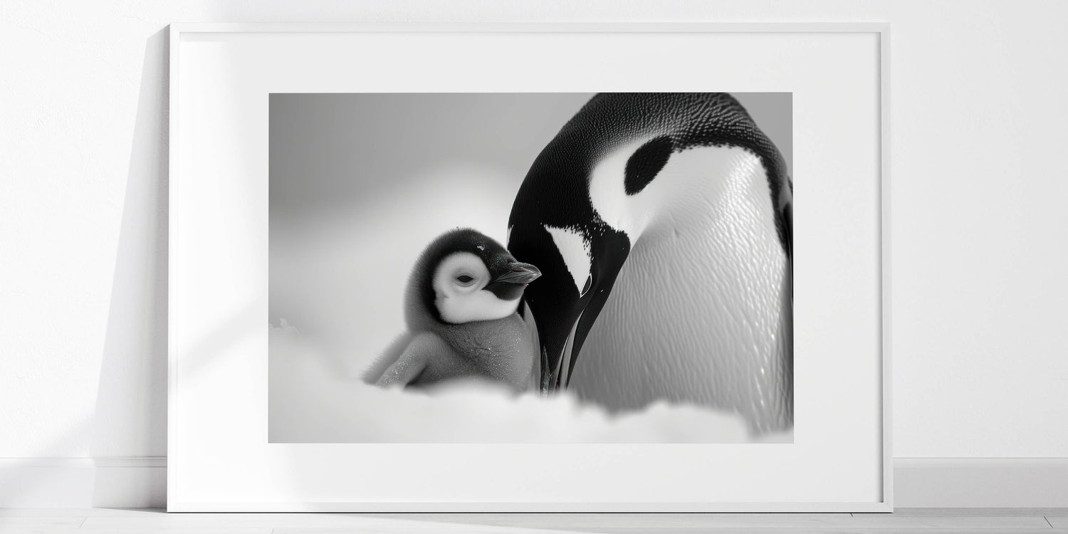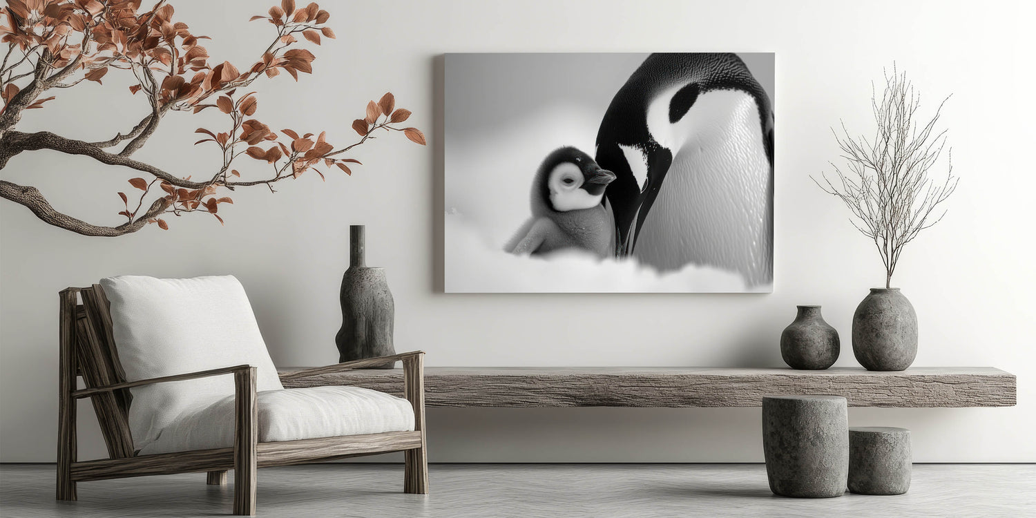 Embrace the serene elegance of the Arctic with this stunning black and white penguin wall art. This captivating piece showcases a tender moment between an adult penguin and its chick, beautifully captured in a monochromatic palette. The subtle shades of black, white, and gray make this artwork a perfect addition to any modern or minimalist decor.