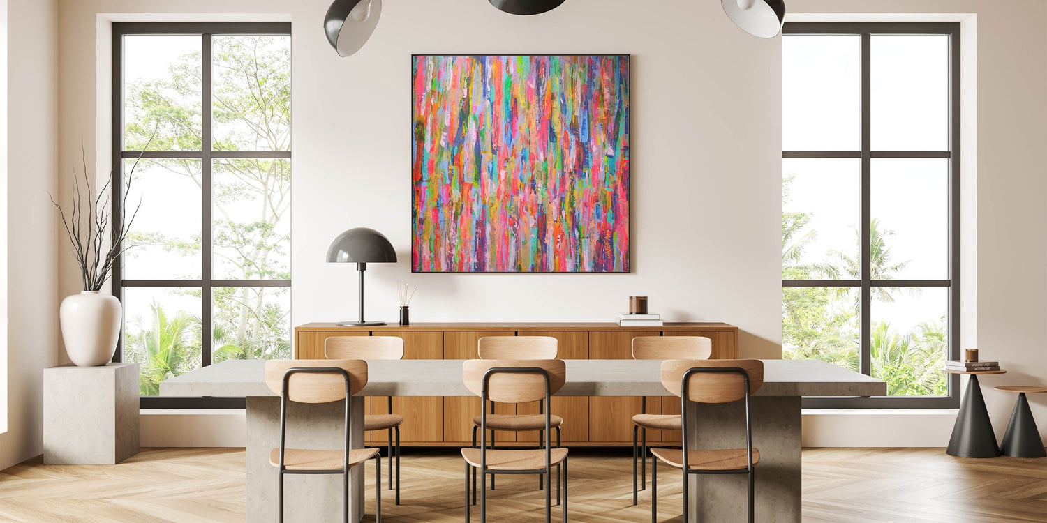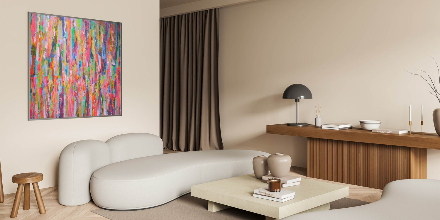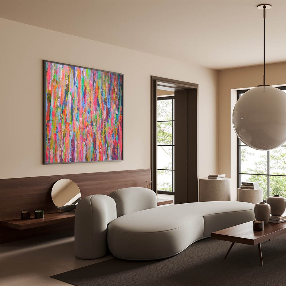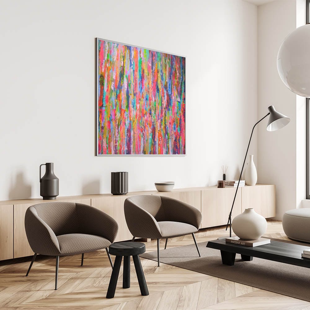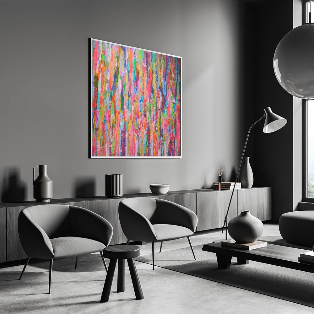 Transform your space with this large abstract wall art, designed to spark creativity and inspiration. Whether placed in a living room, office, or studio, this modern art print radiates energy and artistic expression. The vibrant palette enhances any contemporary setting, making it a striking addition to any home.