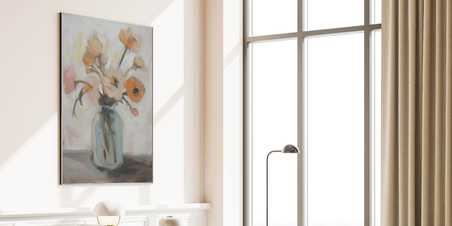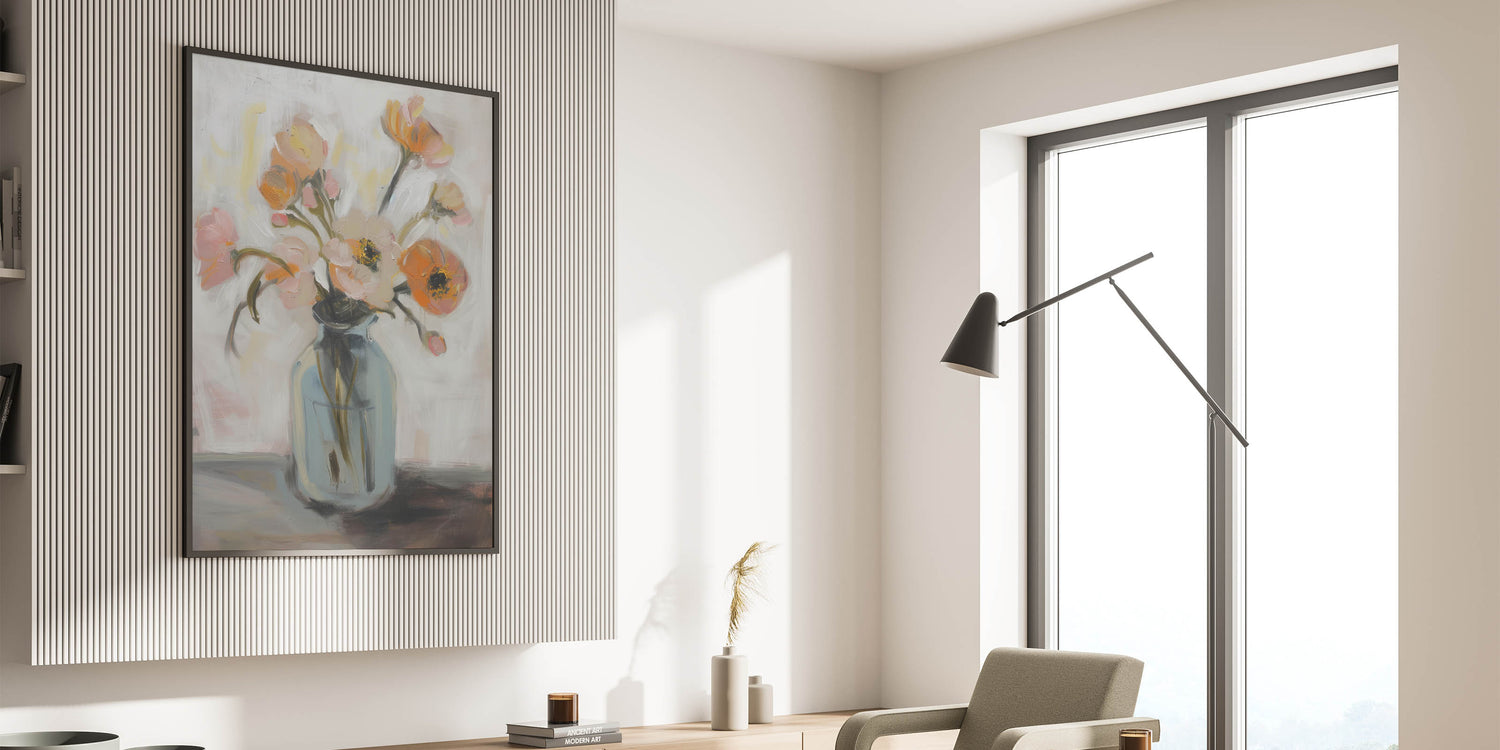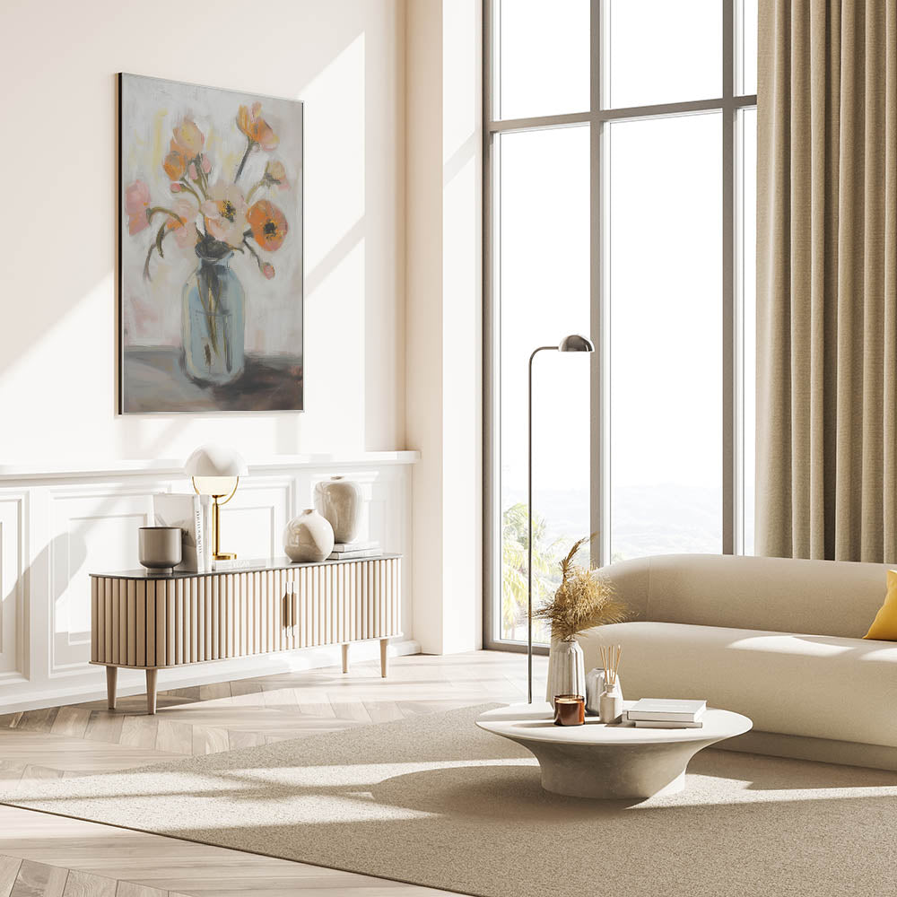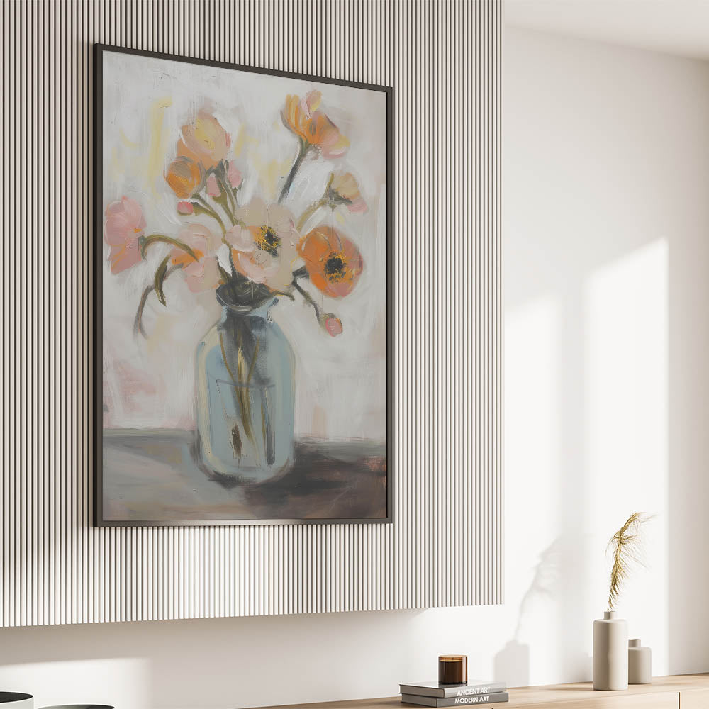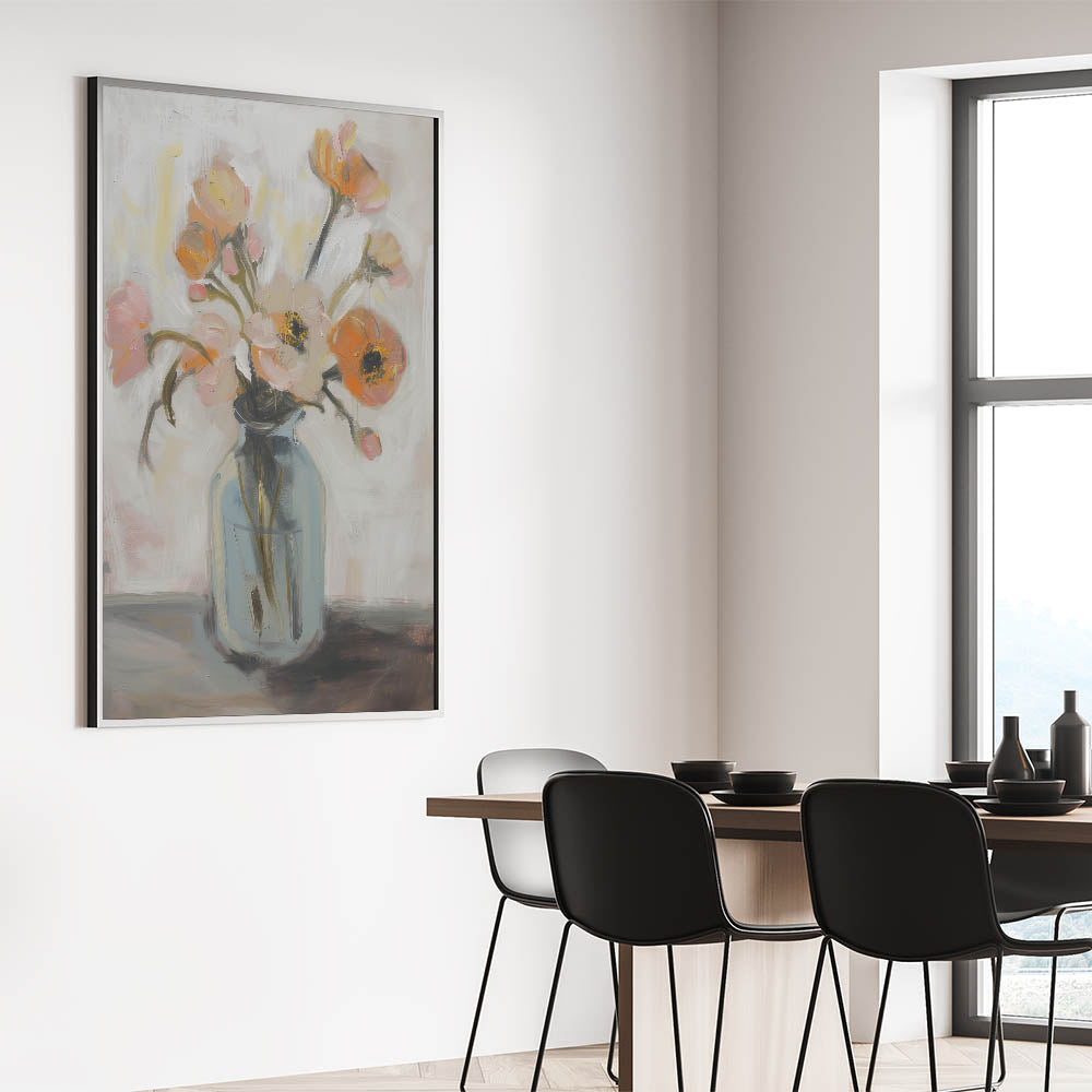 Brighten your space with this Abstract Floral Canvas, featuring a lively arrangement of orange and pink poppies set in a charming blue glass vase. The expressive brushstrokes and dynamic composition bring a sense of movement and vibrancy to the artwork, making it a captivating addition to any room.