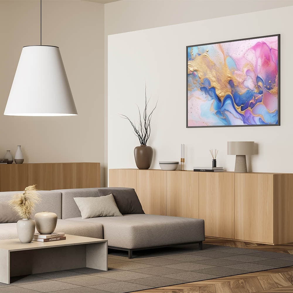 Infuse your space with elegance and charm with this abstract fluid canvas art. Featuring a harmonious blend of pastel pink, deep blue, soft lavender, and shimmering gold, this piece creates a dreamlike flow of color and texture. The luxurious metallic accents and soft gradients make it a stunning statement piece for any modern interior.