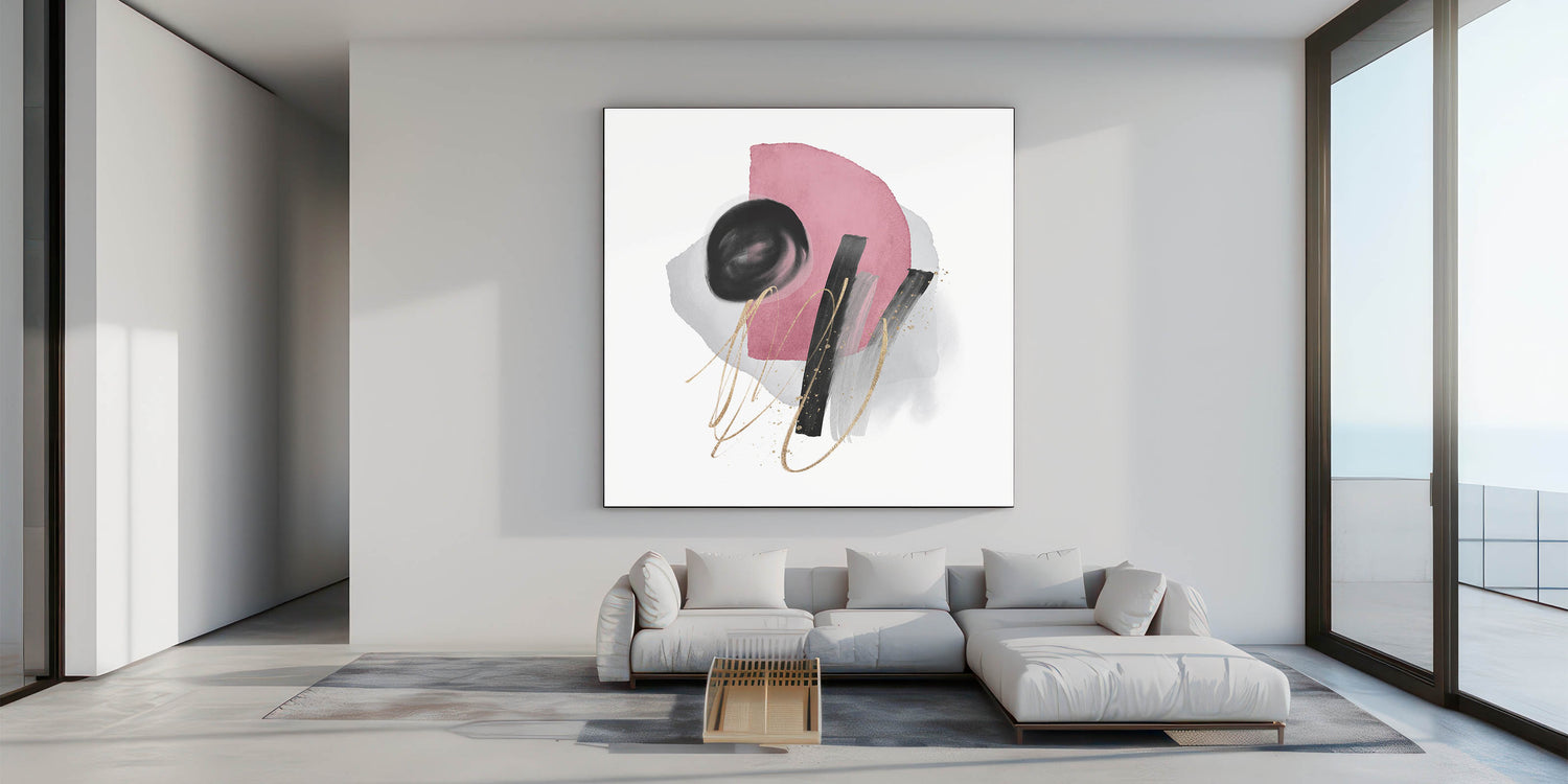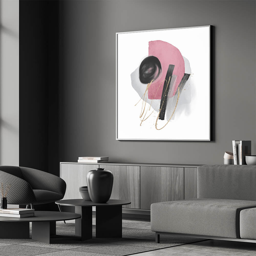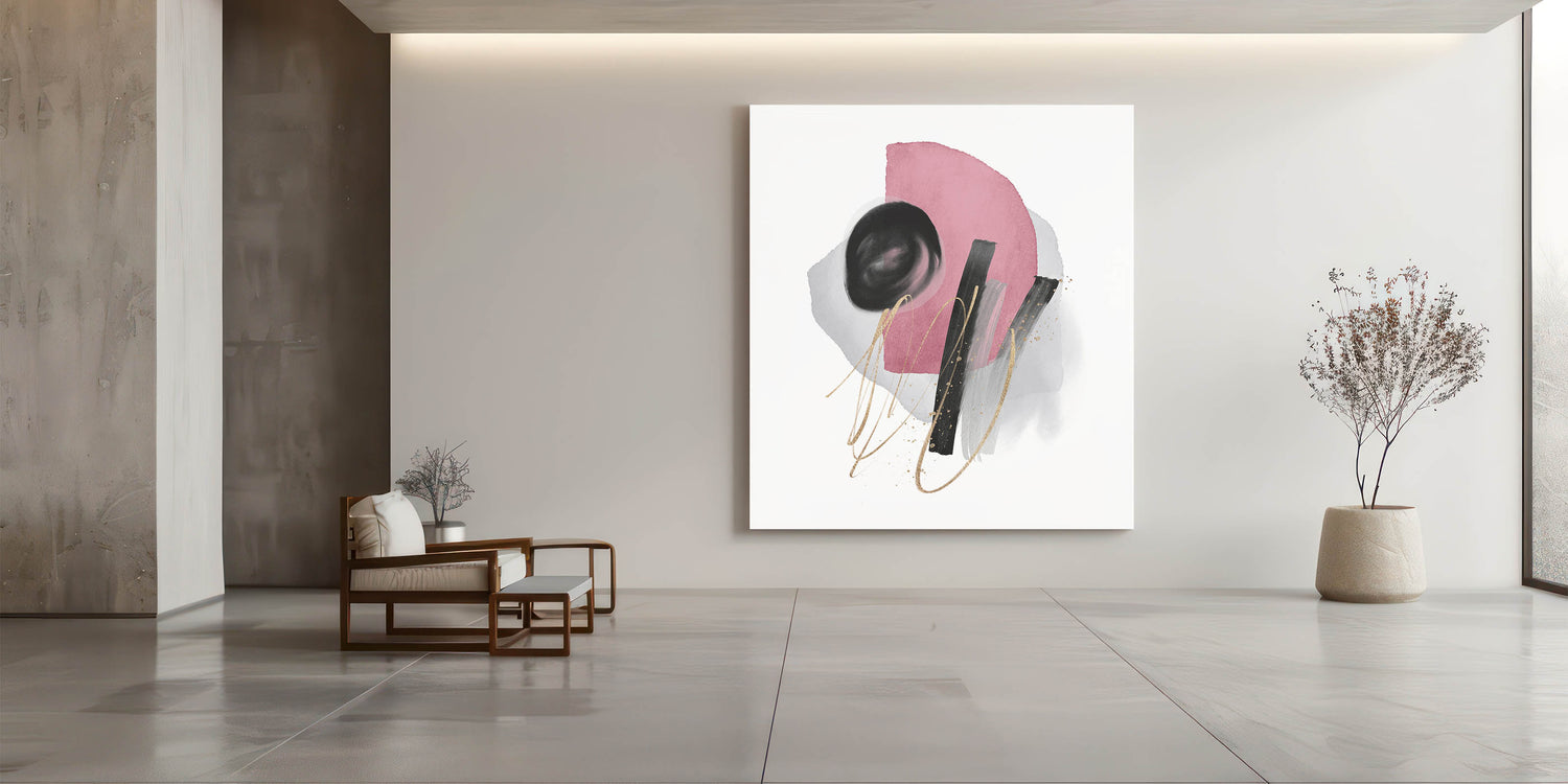 Make a bold artistic statement with this geometric minimalist abstract wall art. Featuring a dynamic arrangement of blush pink, black, gray, and soft white, the piece is brought to life with sweeping strokes and shimmering gold accents. The contrast between color and texture creates an expressive, gallery-worthy focal point.