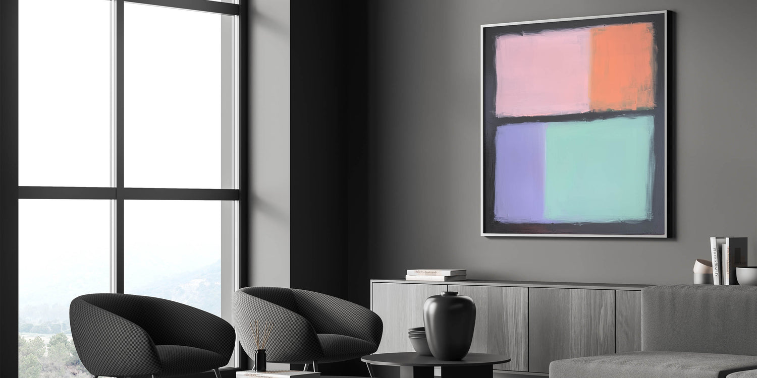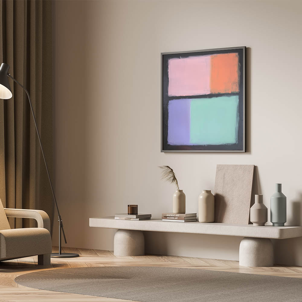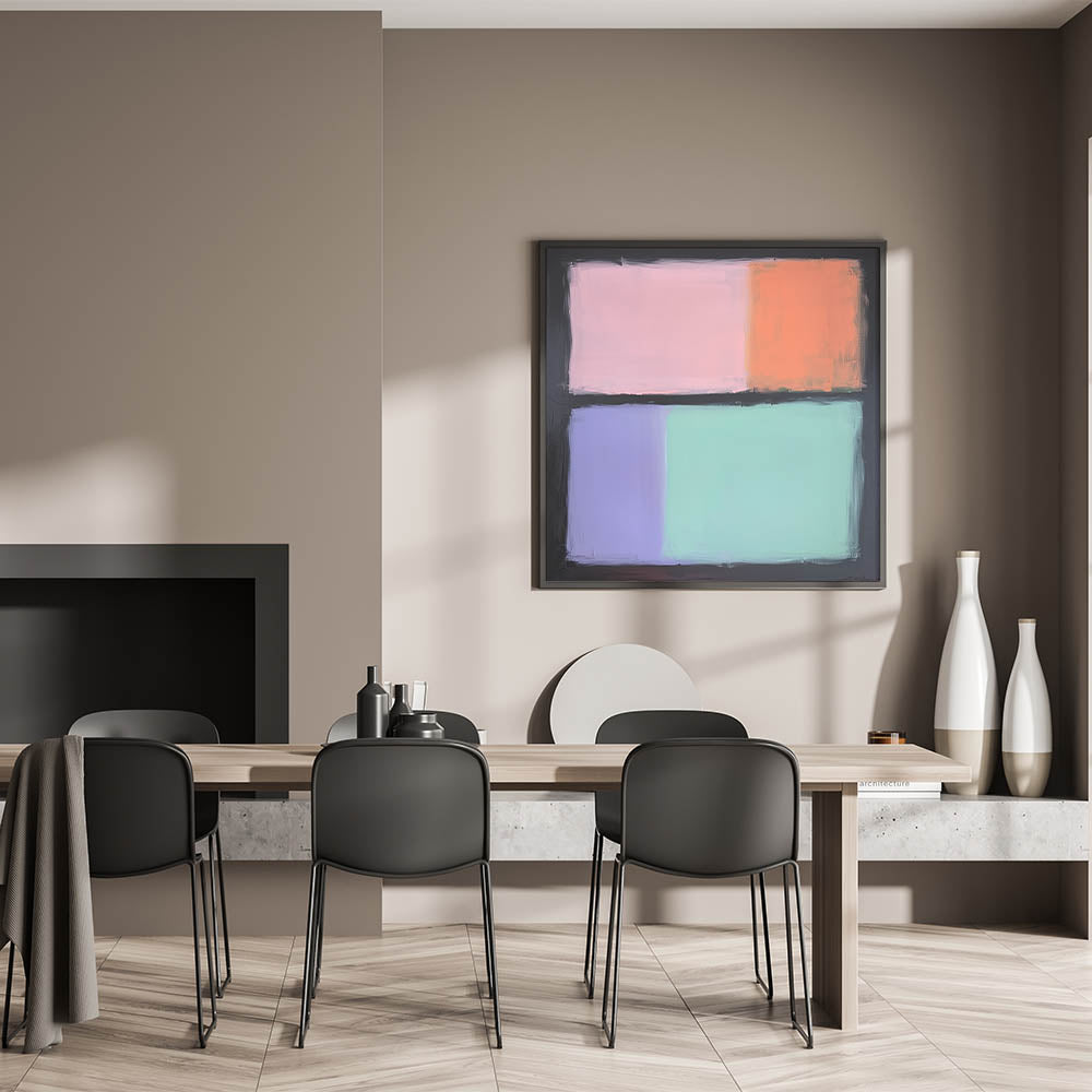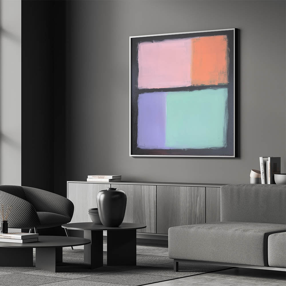Add a touch of elegance to your home with this abstract geometric painting. Featuring a minimalist design of bold rectangular blocks in pastel pink, orange, lavender, and mint green against a black backdrop, this artwork creates a modern and sophisticated vibe. Its clean lines and soothing color palette make it a versatile addition to contemporary or minimalist interiors.