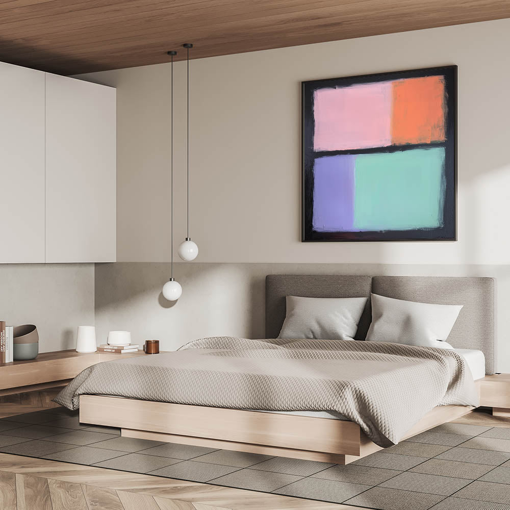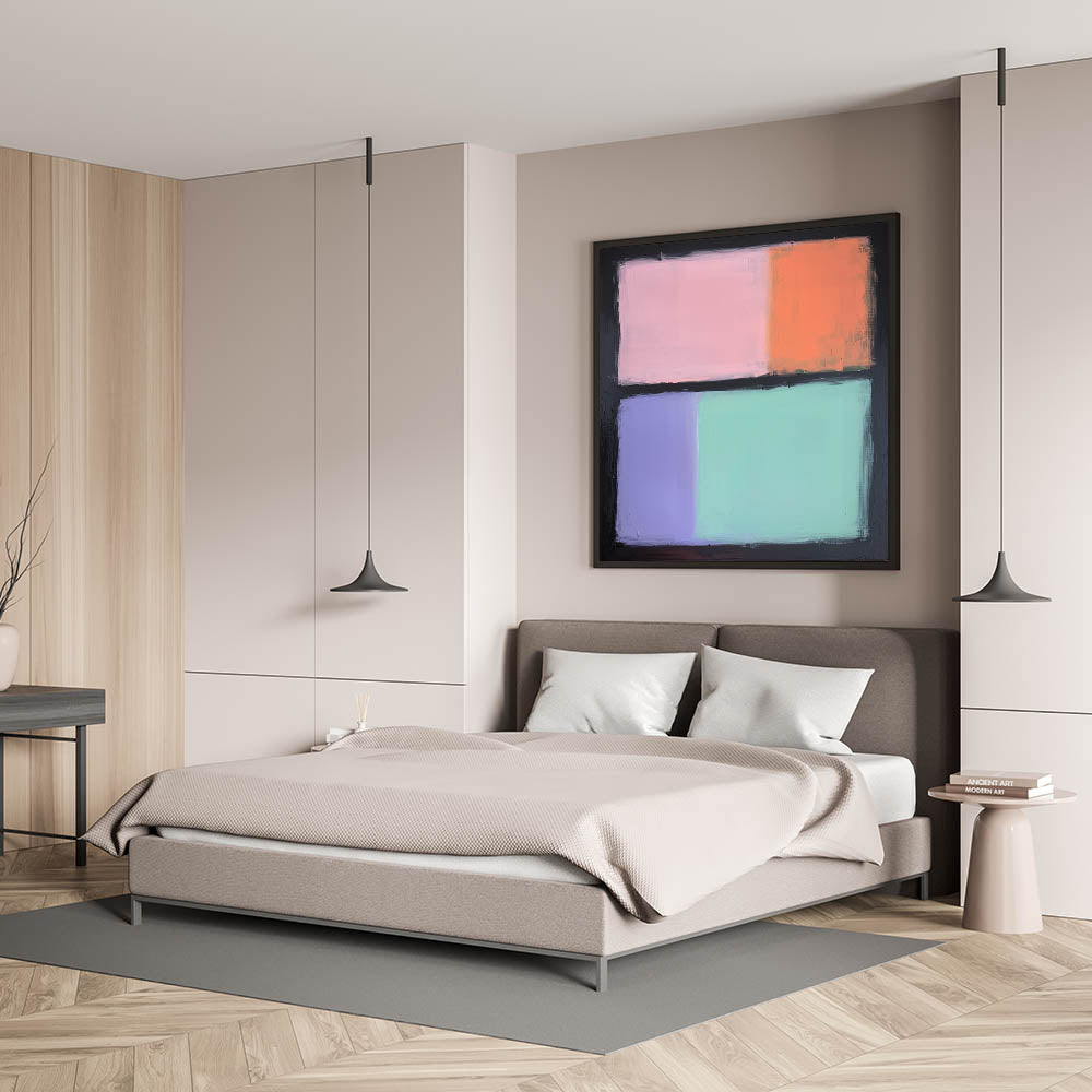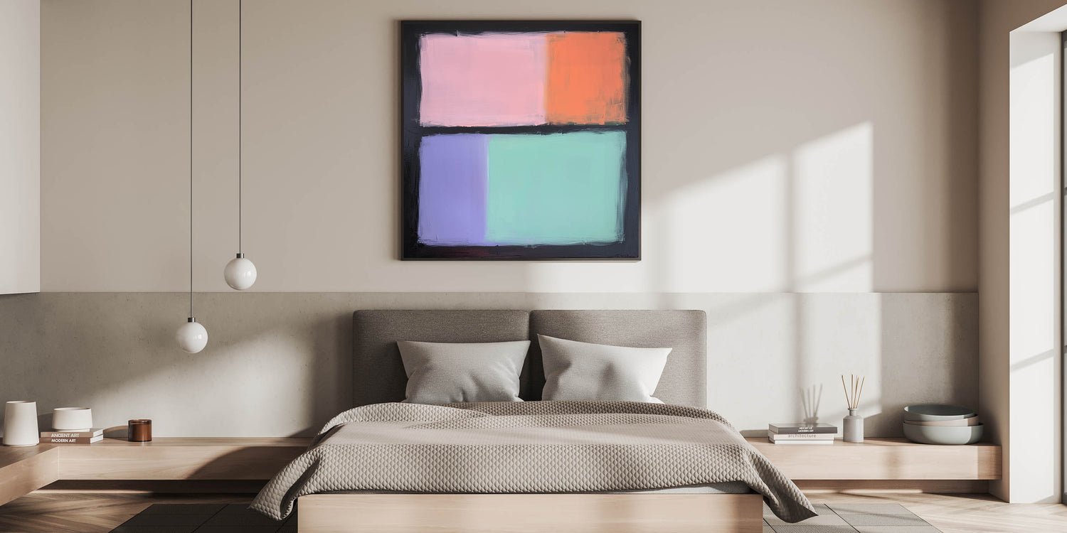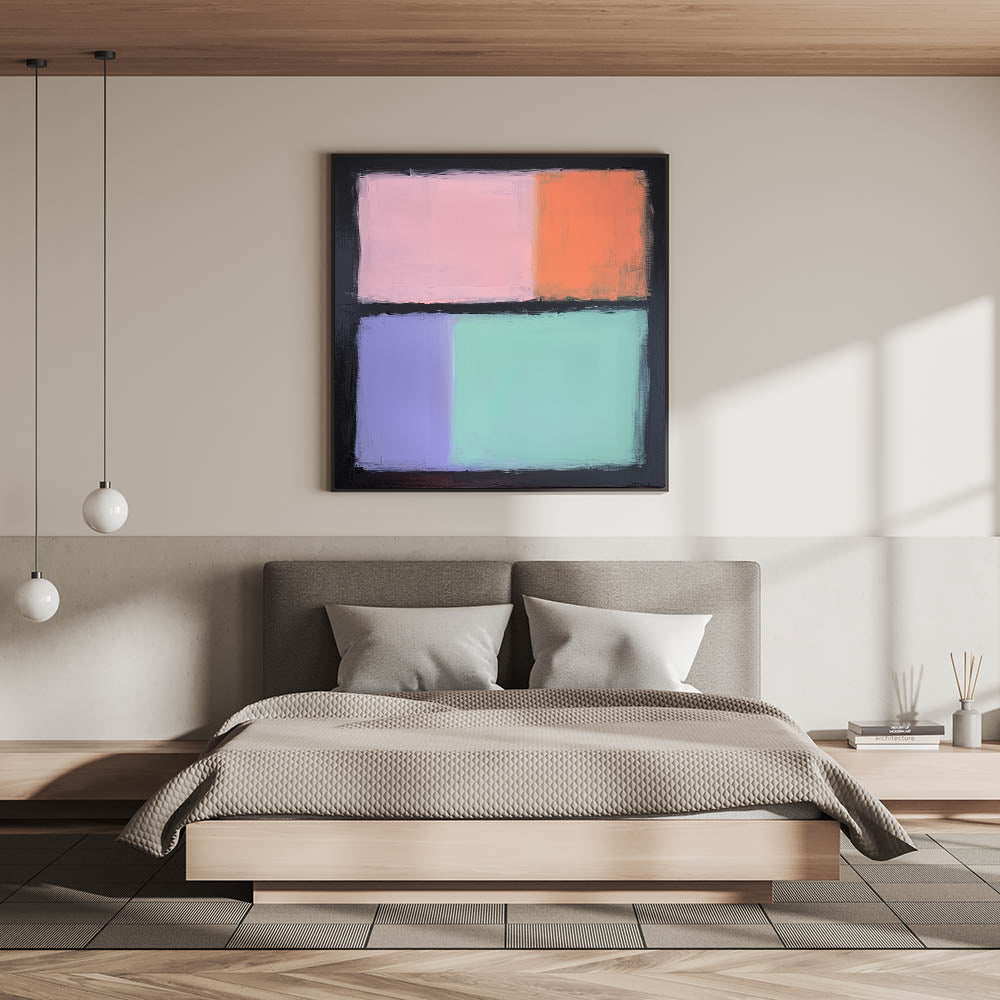 Add a soft yet vibrant touch to your bedroom with this modern bedroom wall art, featuring an abstract composition of pastel pink, orange, lilac, and mint green. This high-quality framed canvas print blends bold blocks of color with expressive brushstrokes, making it a unique statement piece for contemporary and artistic interiors. The combination of soft hues and dark contrast creates a visually striking balance, perfect for modern bedroom aesthetics.