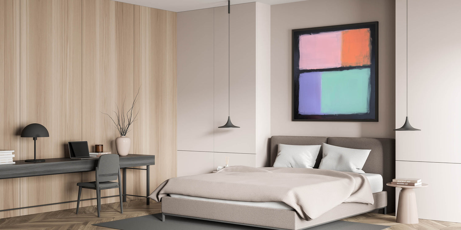 • Unique wall art designs for bedrooms, combining pastel shades with expressive abstract elements.