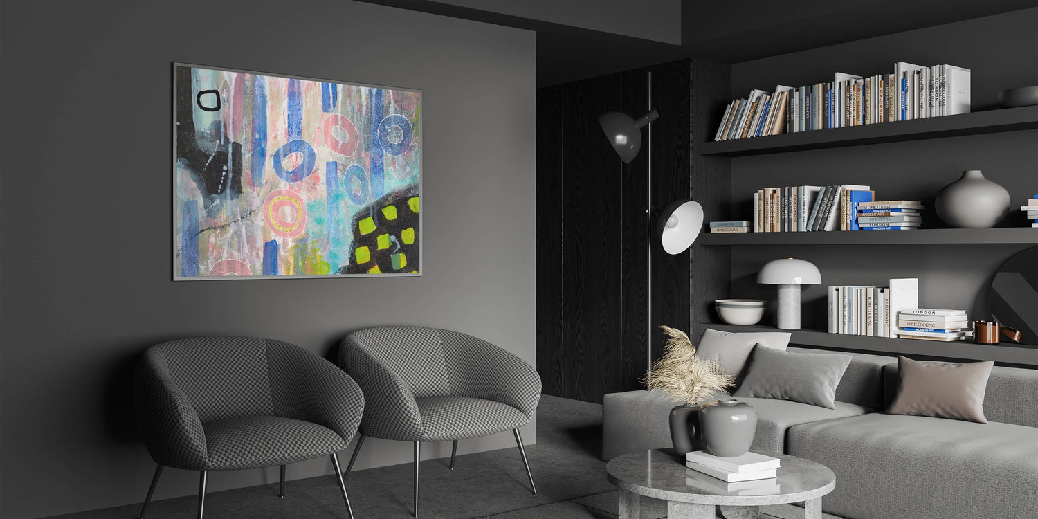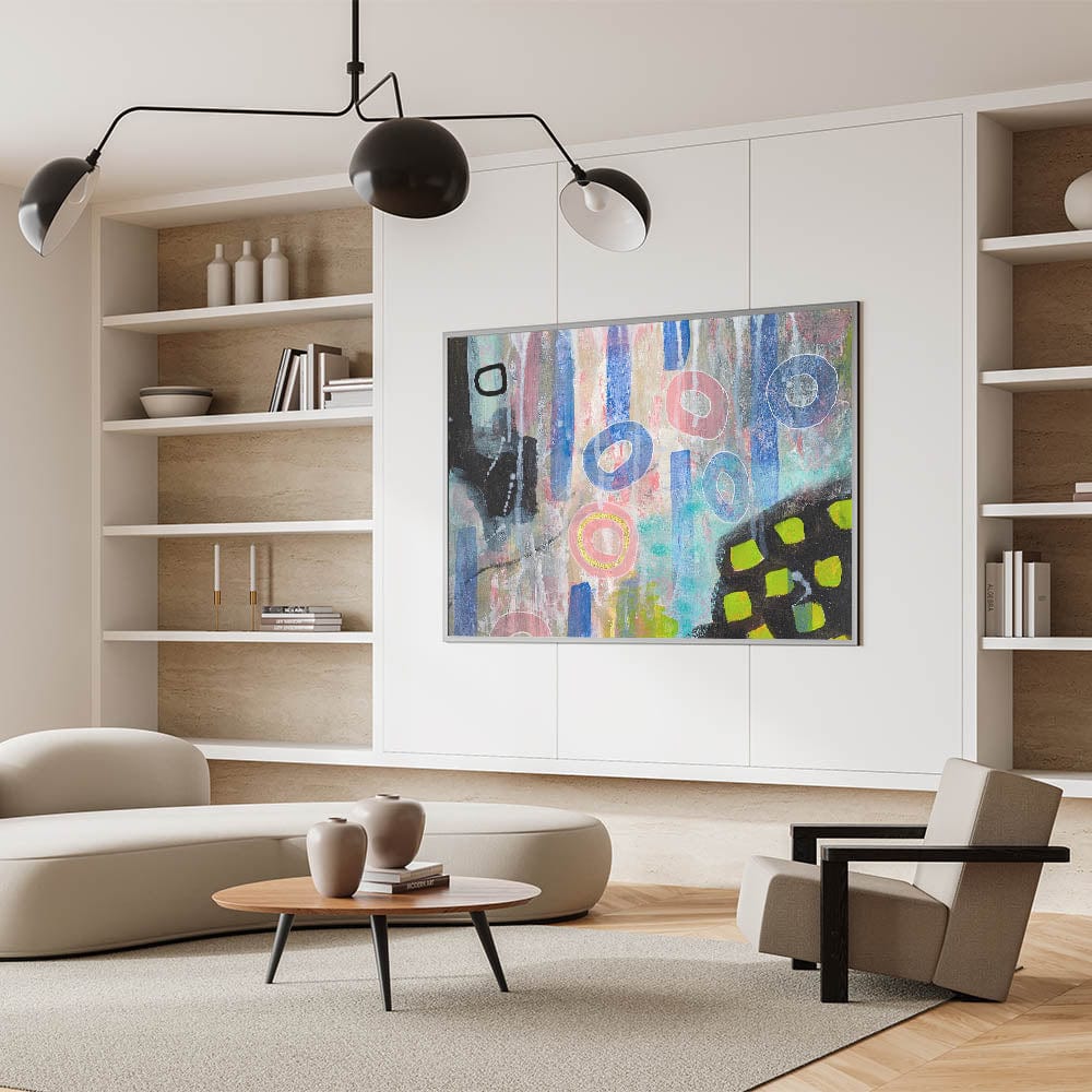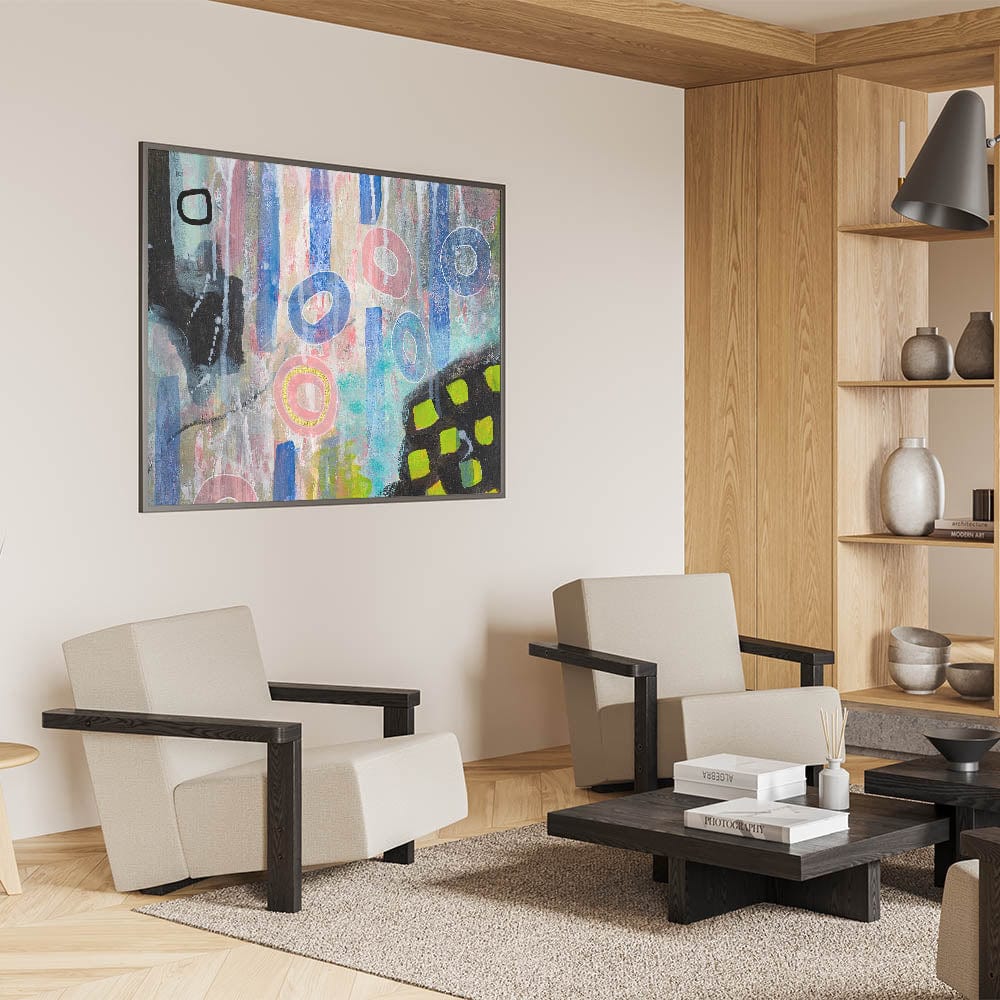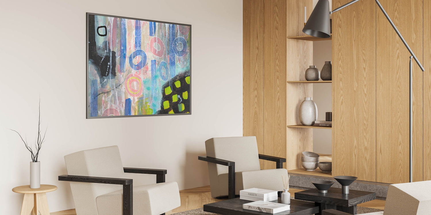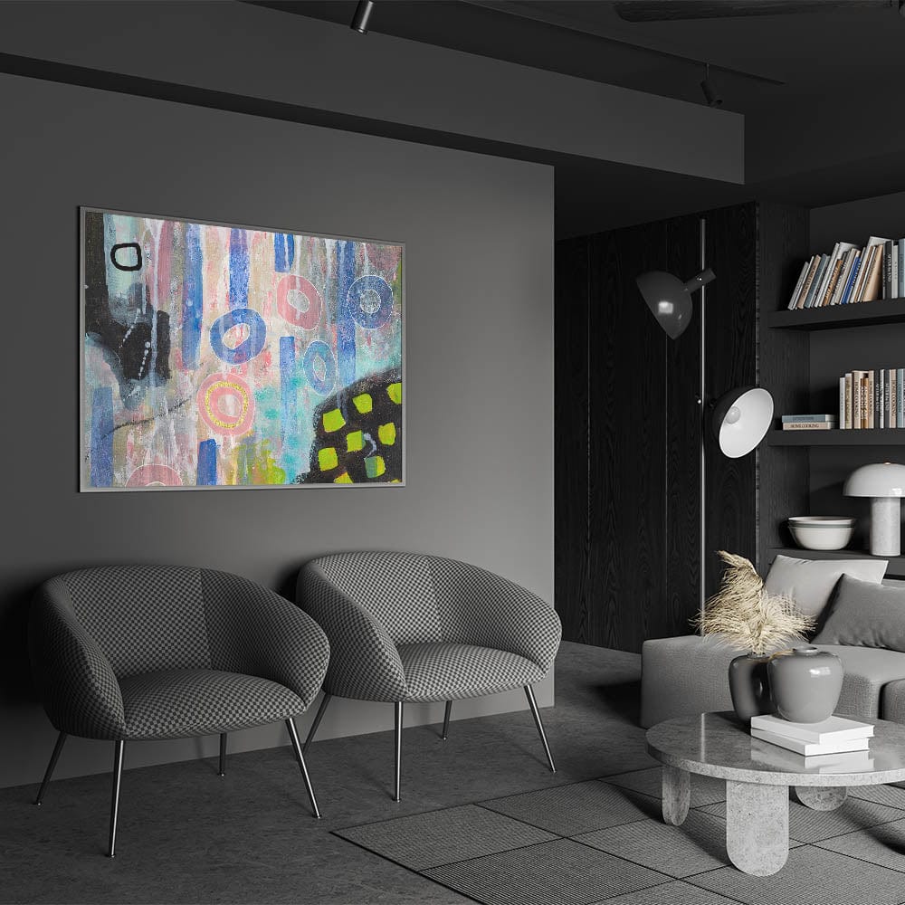 Infuse your space with creativity and color through this abstract wall art, a dynamic blend of moody modern wall art elements. Featuring soft pink, vibrant blue, and pastel tones, this contemporary abstract art is an expressive fusion of geometric forms and bold textures. The mix of organic shapes and structured patterns creates a unique and engaging composition.