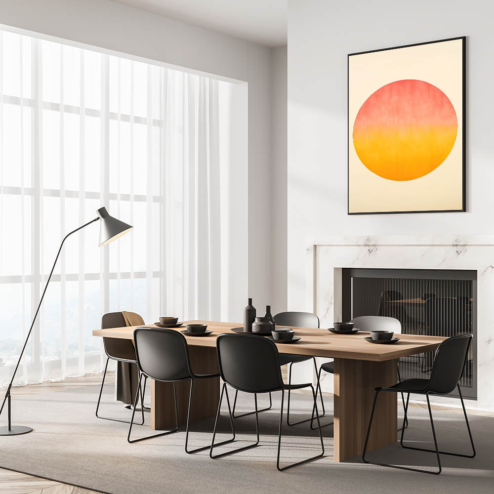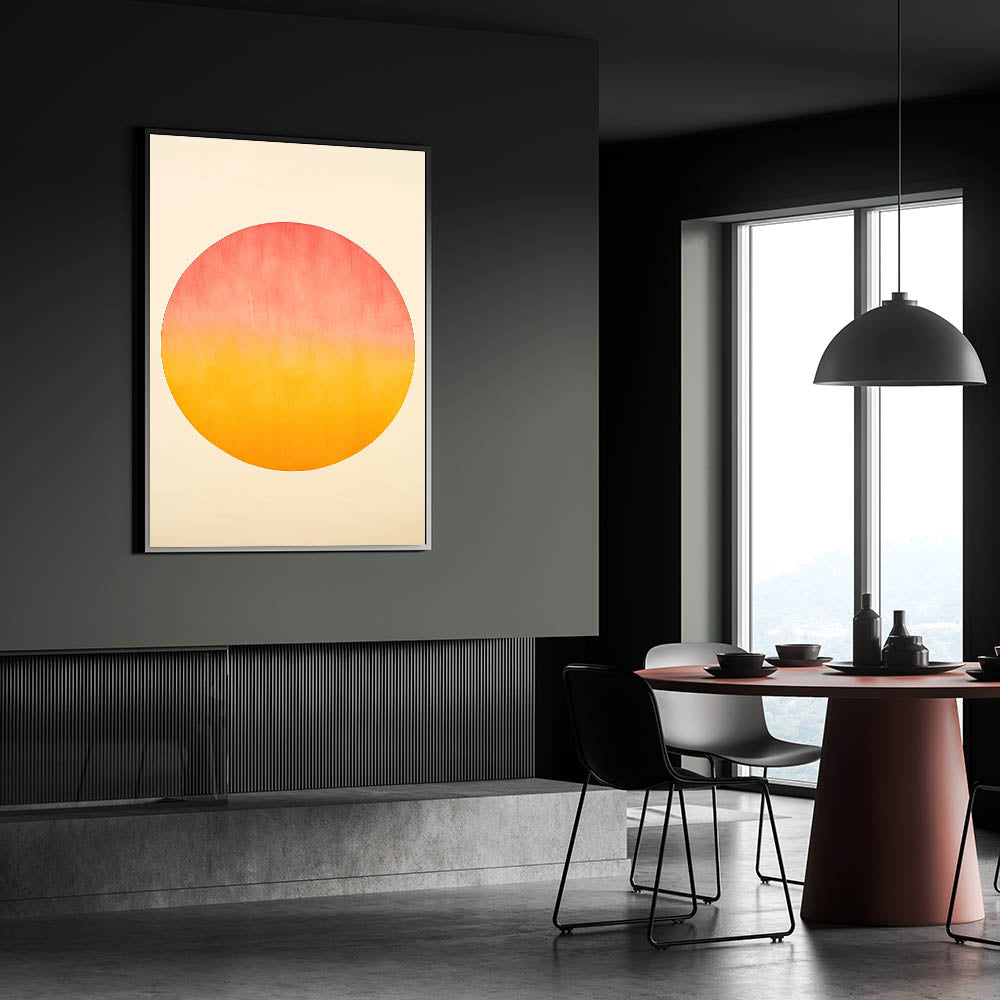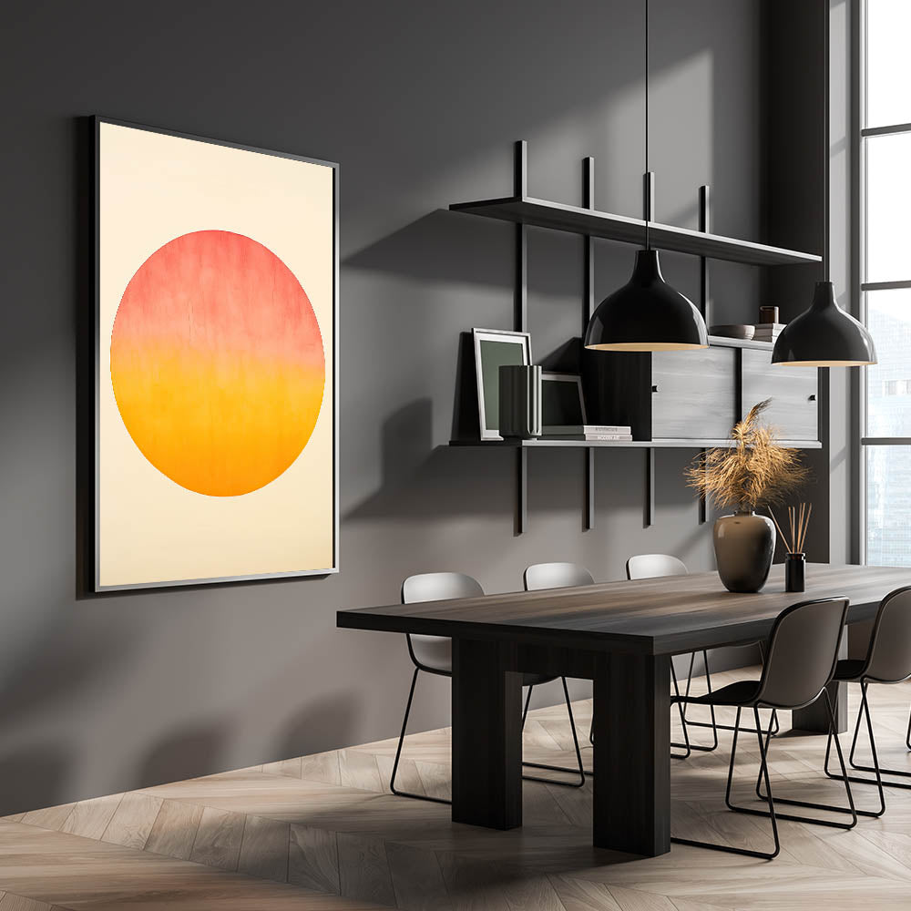 Infuse your dining area with warmth and energy using this acrylic dining room artwork, inspired by the beauty of a glowing sunset. Featuring a captivating gradient of rich orange and soft pink hues, this piece adds a bold yet elegant touch to your space. The simplicity of its circular design enhances modern and minimalist dining room aesthetics, making it an excellent wall decor choice for contemporary interiors.
