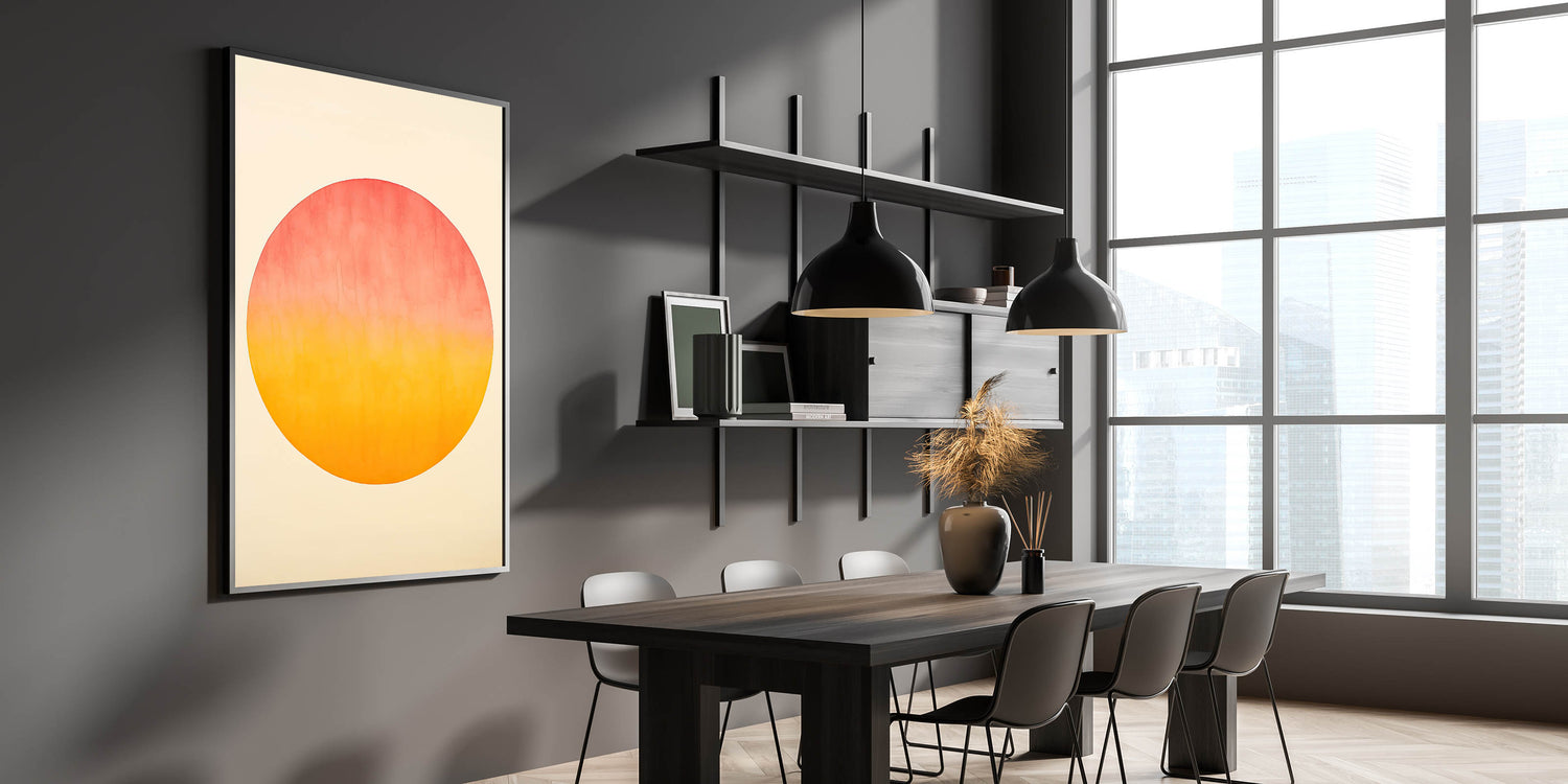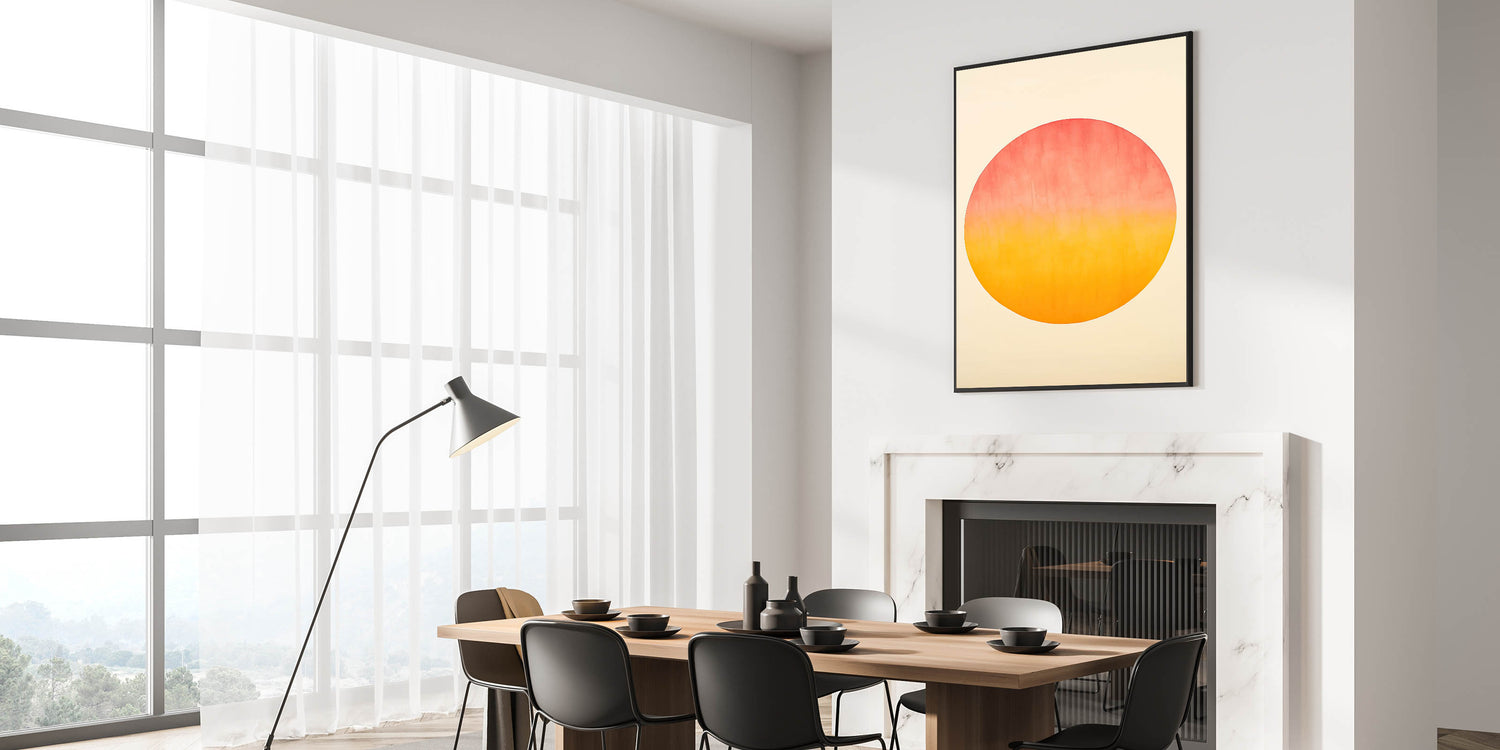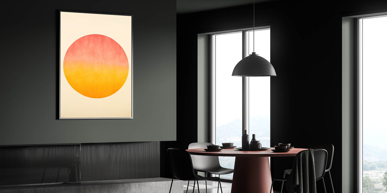 Infuse your dining area with warmth and energy using this acrylic dining room artwork, inspired by the beauty of a glowing sunset. Featuring a captivating gradient of rich orange and soft pink hues, this piece adds a bold yet elegant touch to your space. The simplicity of its circular design enhances modern and minimalist dining room aesthetics, making it an excellent wall decor choice for contemporary interiors.