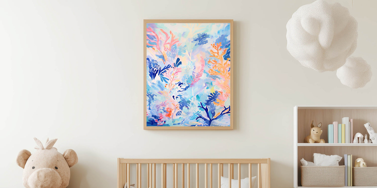 Transform your child’s room into an underwater paradise with this Acrylic Glass Art for Kids Rooms, featuring a vibrant coral reef-inspired design. The mix of soft blues, pinks, and oranges creates a stunning aquatic scene, making this Children’s Wall Art Print an excellent choice for nurseries, playrooms, and kids' bedrooms.