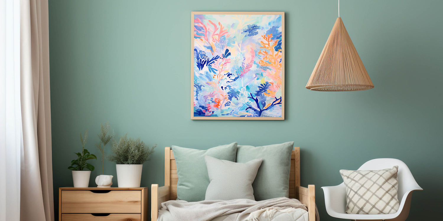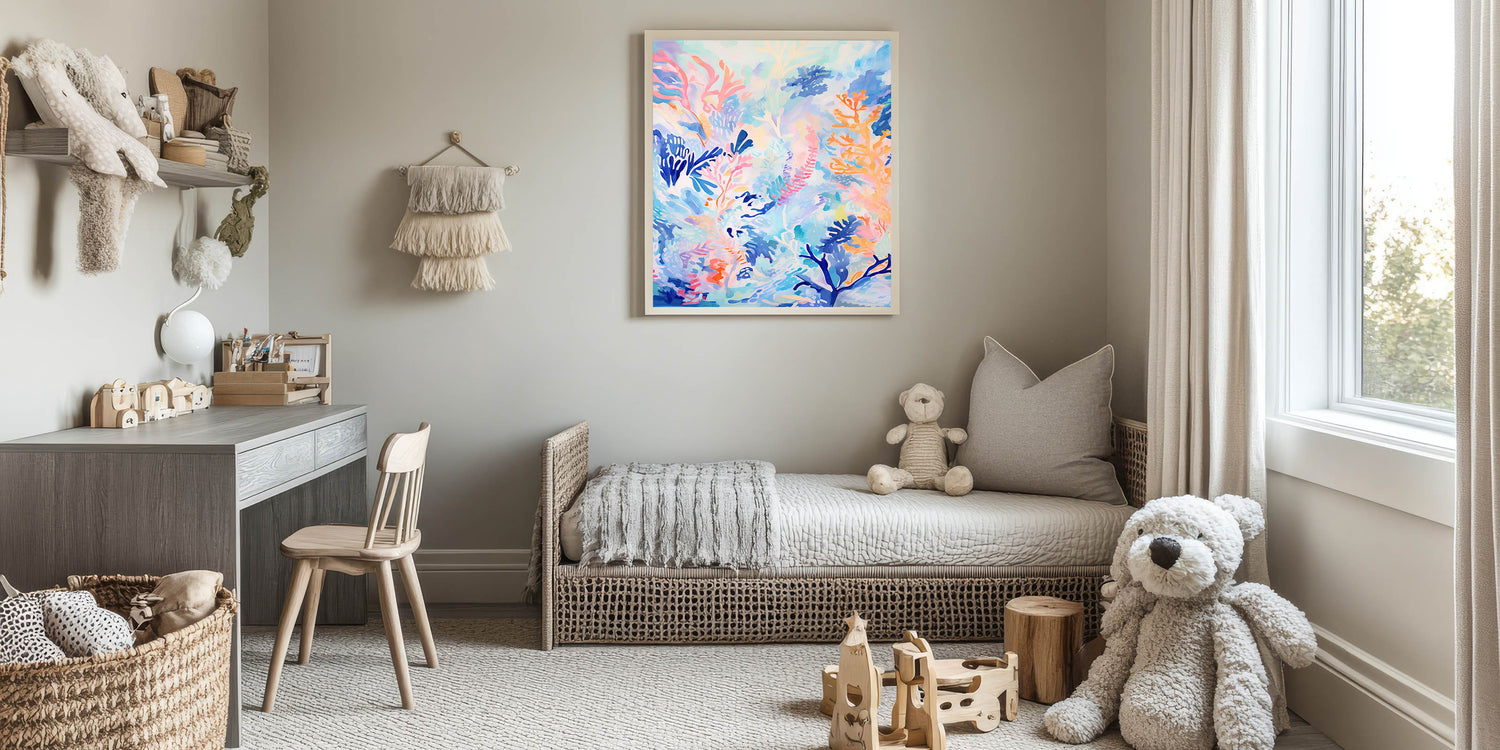 - Colorful Art for Kids' Spaces with calming blue and vibrant coral hues, perfect for a marine-themed decor.
