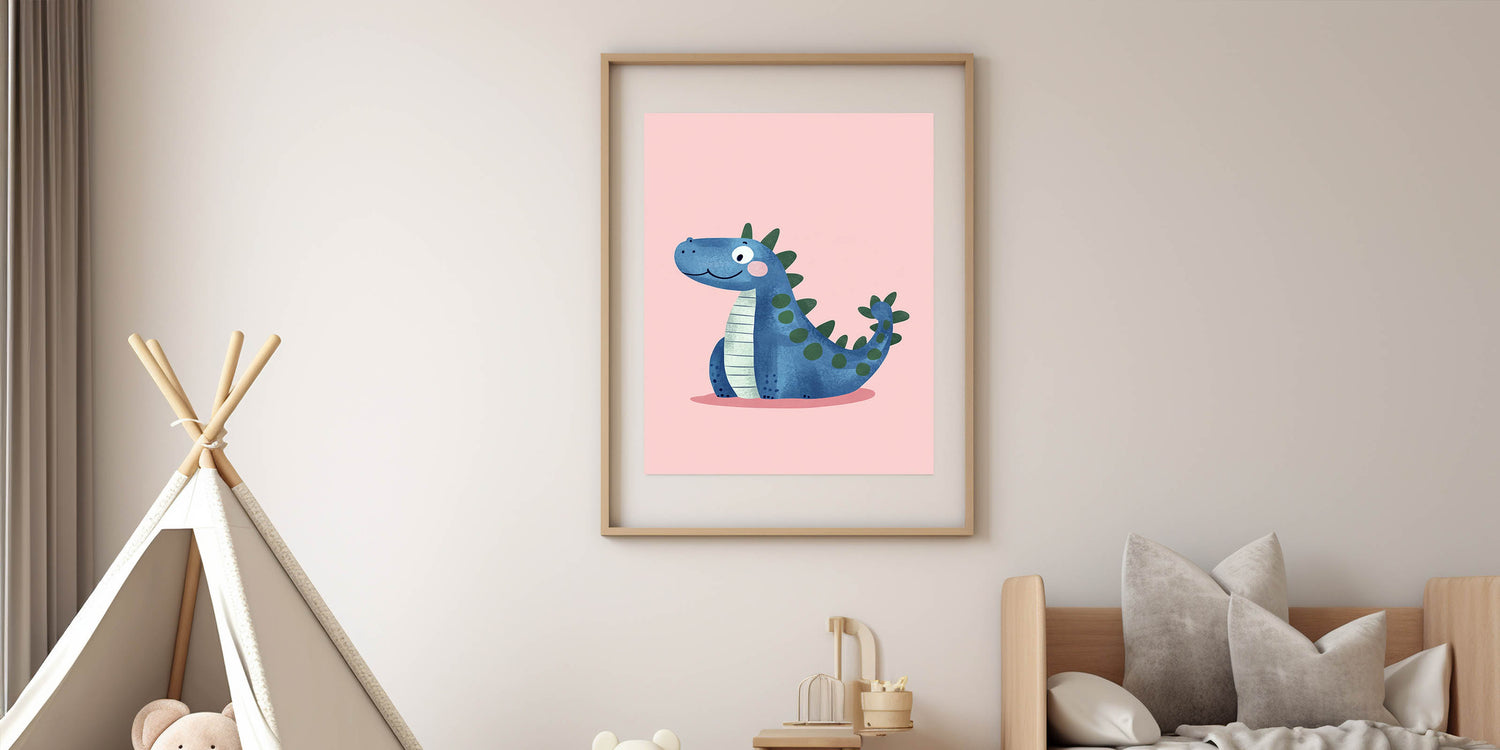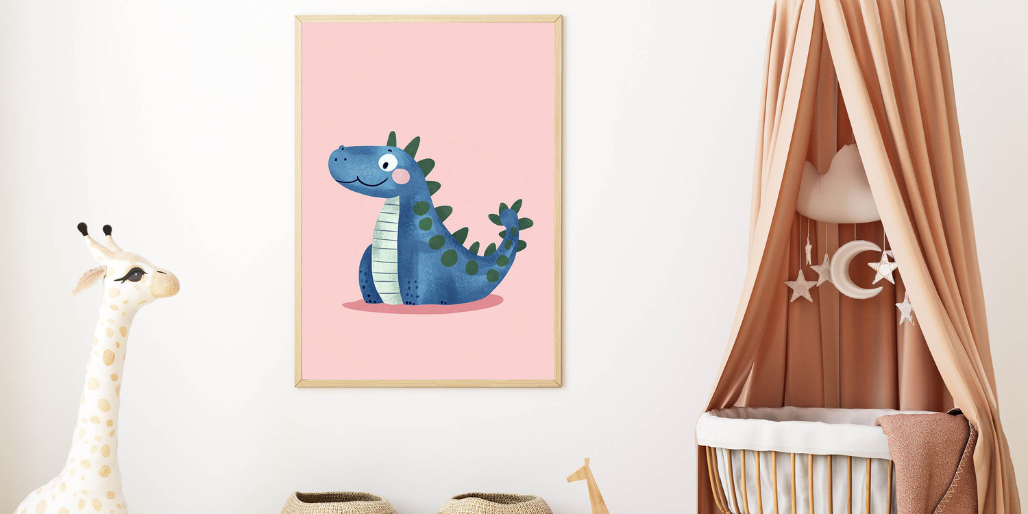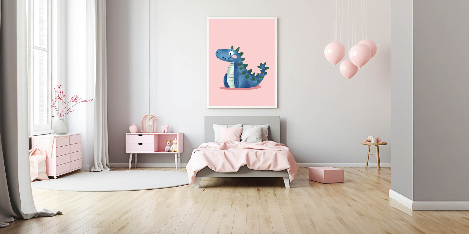 Create a fun and playful atmosphere with this adorable blue dinosaur wall art, perfect for a girl's nursery, bedroom, or playroom. The charming dinosaur illustration features a friendly blue dino with green spikes, set against a soft pink background, making it an ideal addition to any children's wall decor. Whether you're decorating a kids' room or adding a whimsical touch to a nursery, this delightful print will spark imagination and joy.