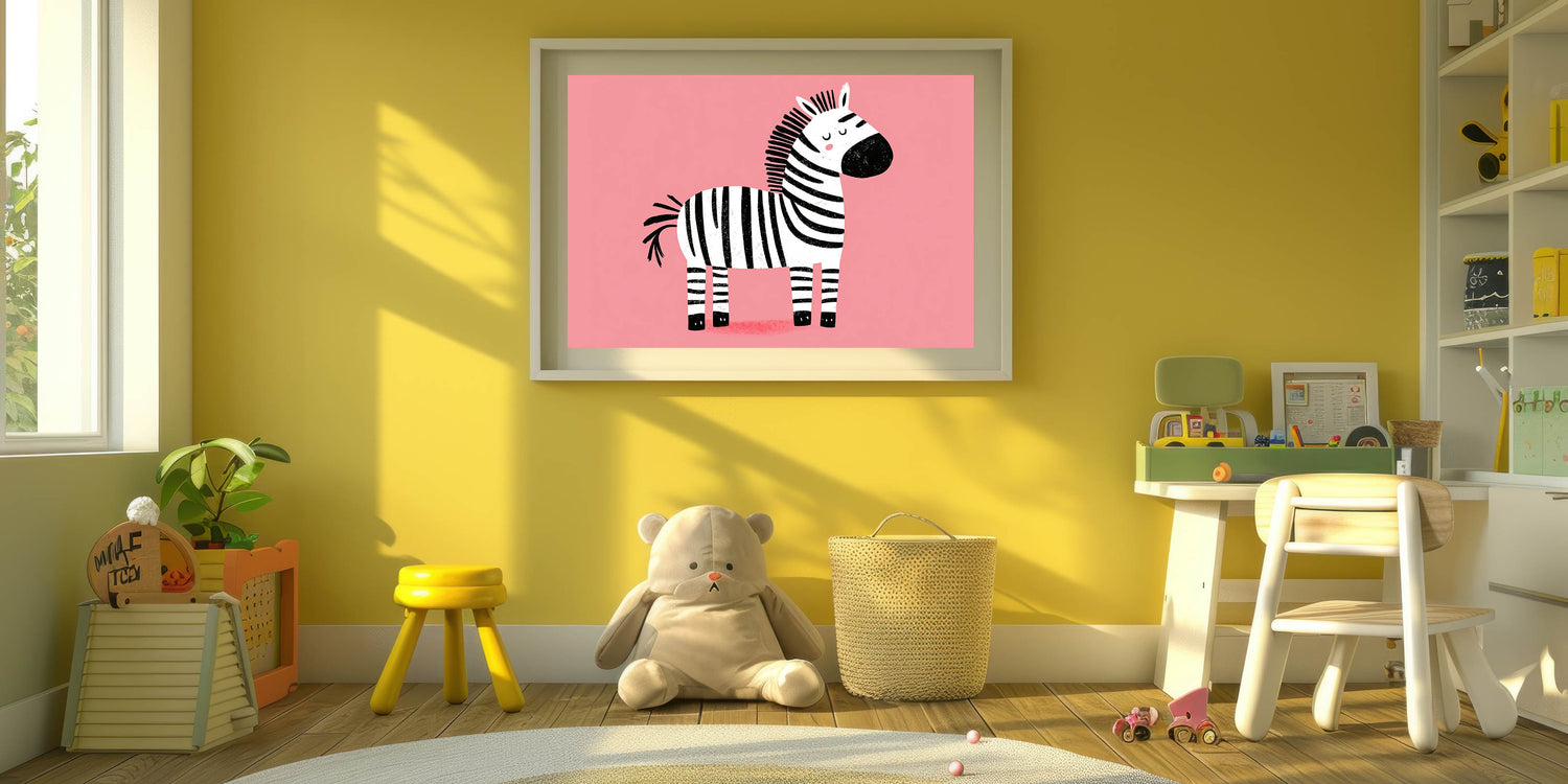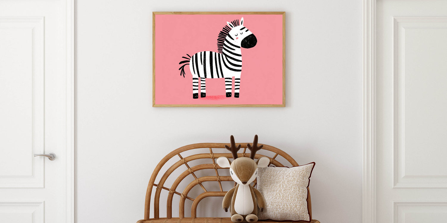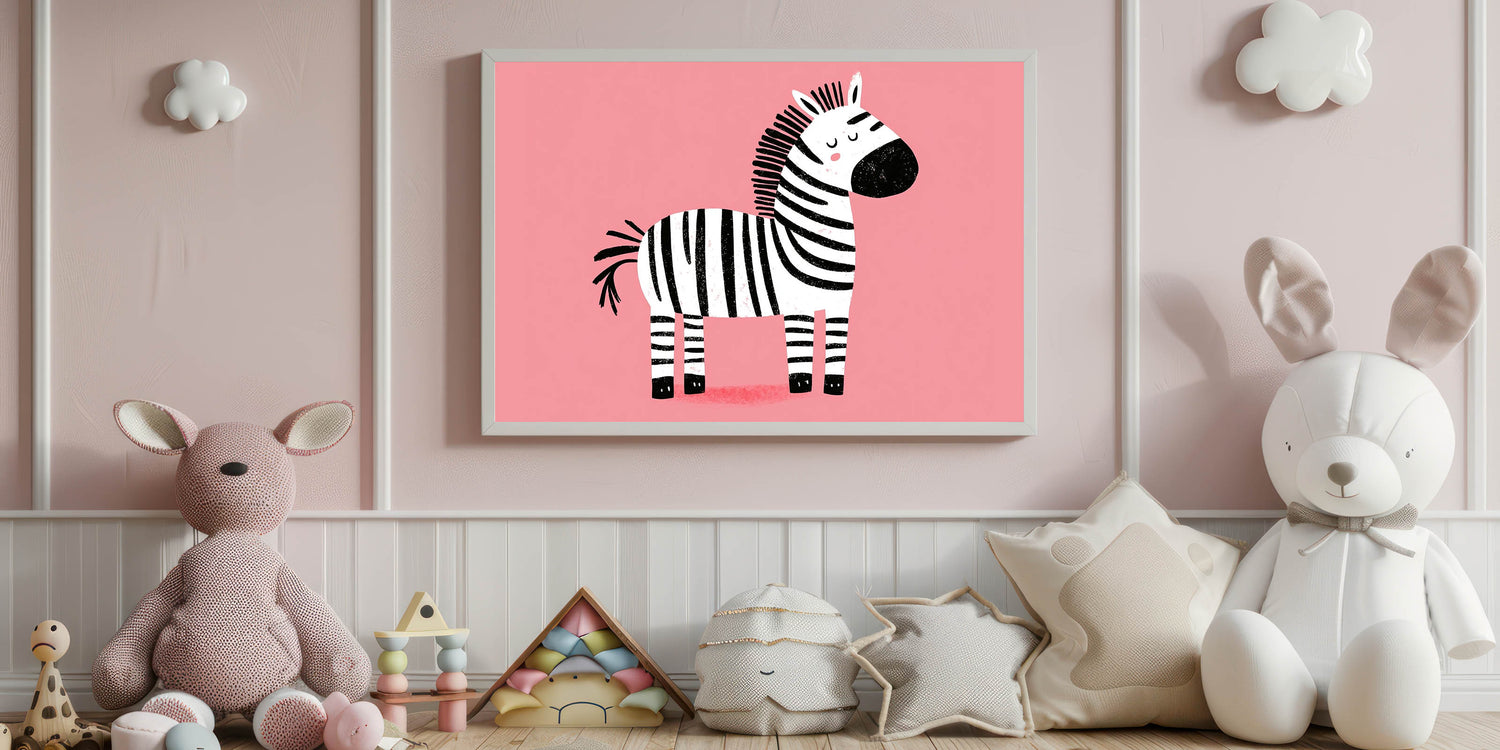 Bring a sense of calm and charm to your child’s space with this adorable zebra wall art. Featuring a cute, peacefully resting zebra against a soft pink background, this delightful artwork is perfect for girls' bedrooms, nurseries, and playrooms. The simple yet playful design makes it a wonderful addition to children’s wall decor, creating a cozy and soothing atmosphere.