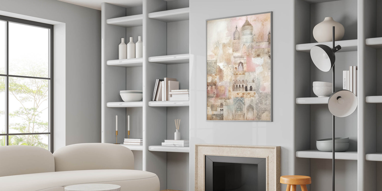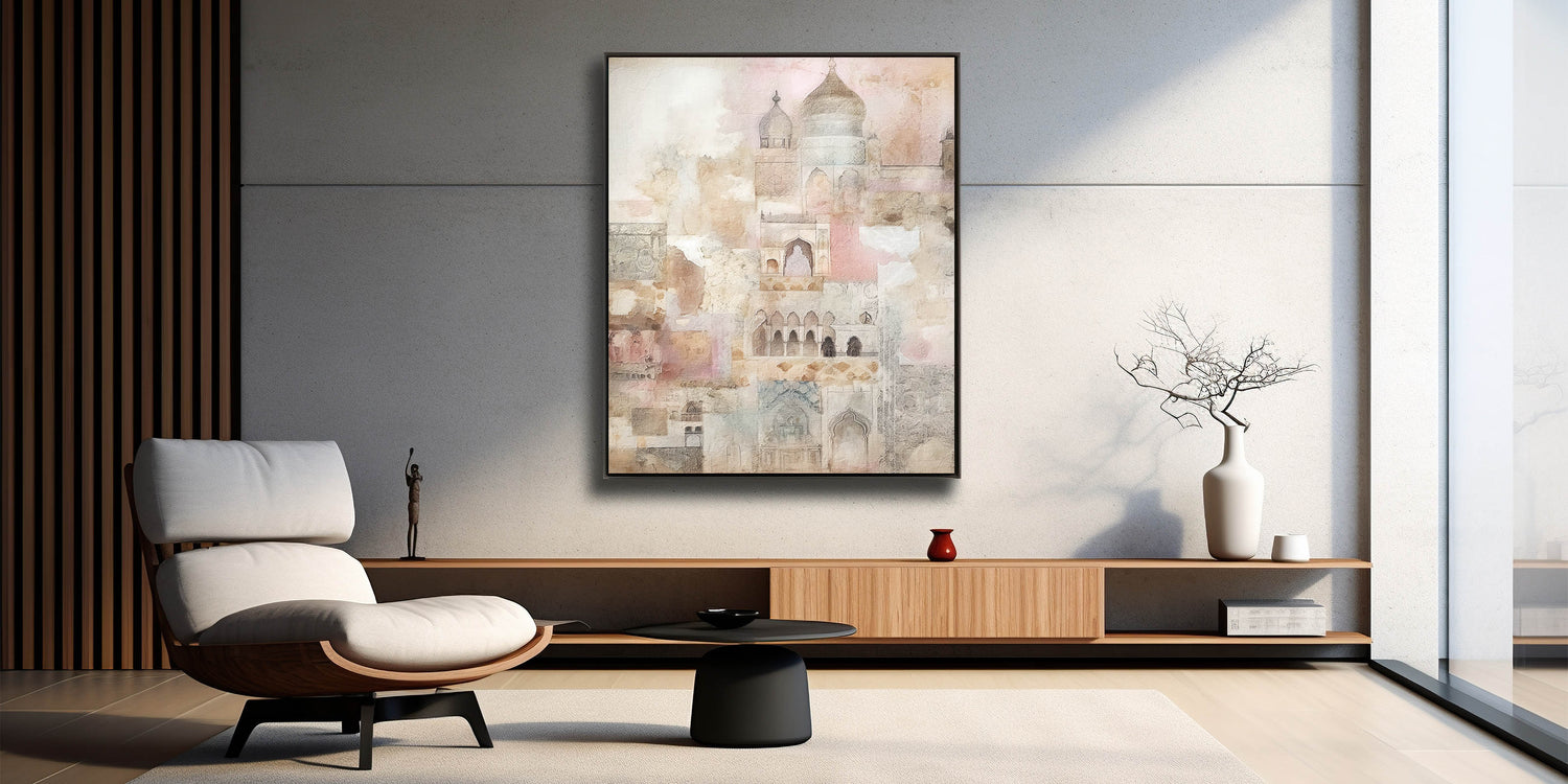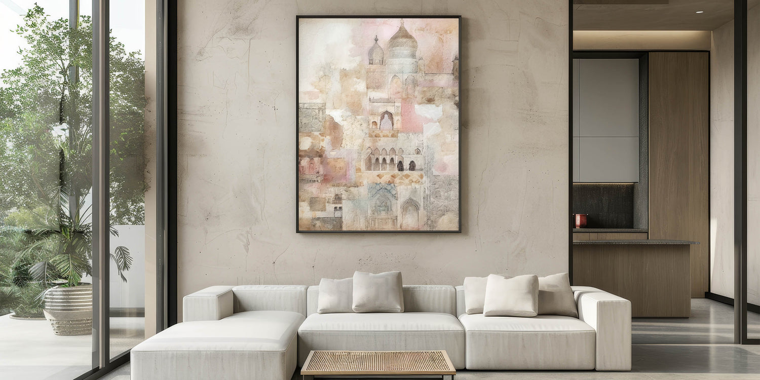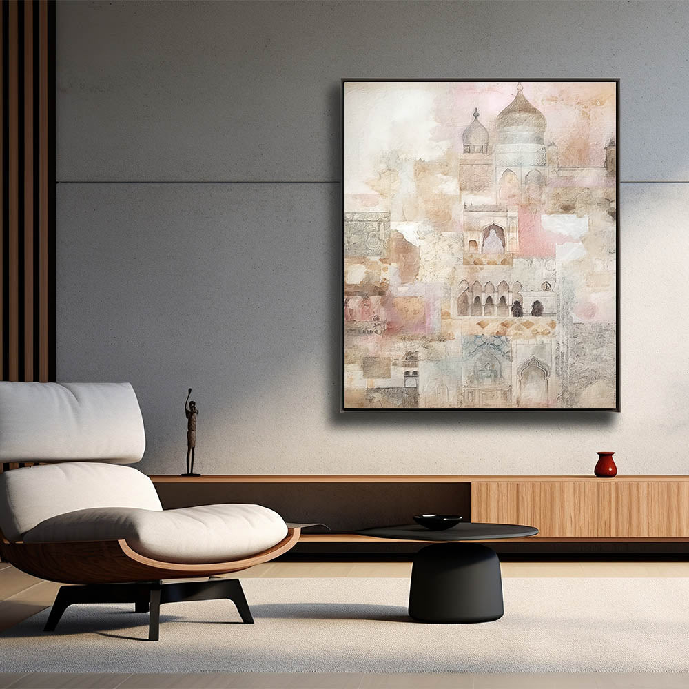 Infuse your space with a sense of timeless beauty through this ethereal architectural abstract art piece. Featuring intricate patterns and soft, pastel tones, this artwork draws inspiration from classical architecture, blending arches, domes, and delicate details to create a dreamlike collage. Perfect for those who appreciate the fusion of history and abstraction, this design is ideal for adding elegance to modern or traditional interiors.