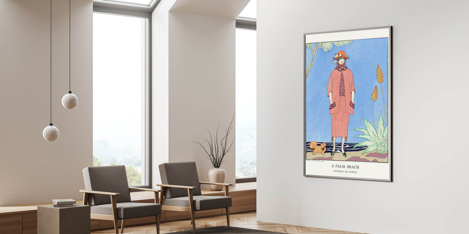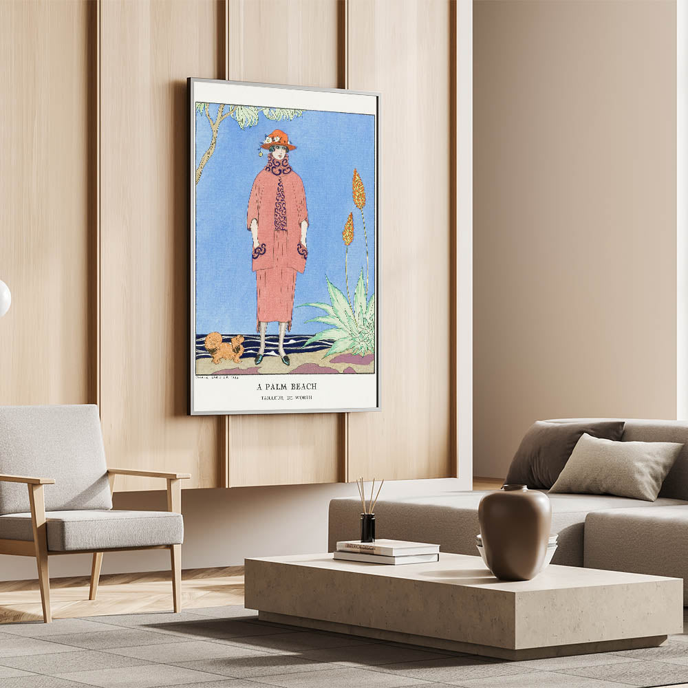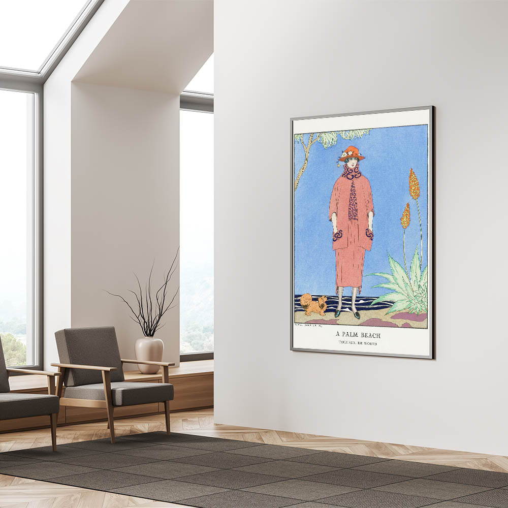 Transport yourself to a glamorous day in Palm Beach with this vibrant Art Deco wall art. This illustration features a sophisticated woman in stylish 1920s attire, complete with a bold hat and elegant coat, set against a scenic background with tropical plants and a serene sky. The bright colors and intricate details bring the charm and elegance of the Art Deco era to life, making it an ideal piece for any art lover.