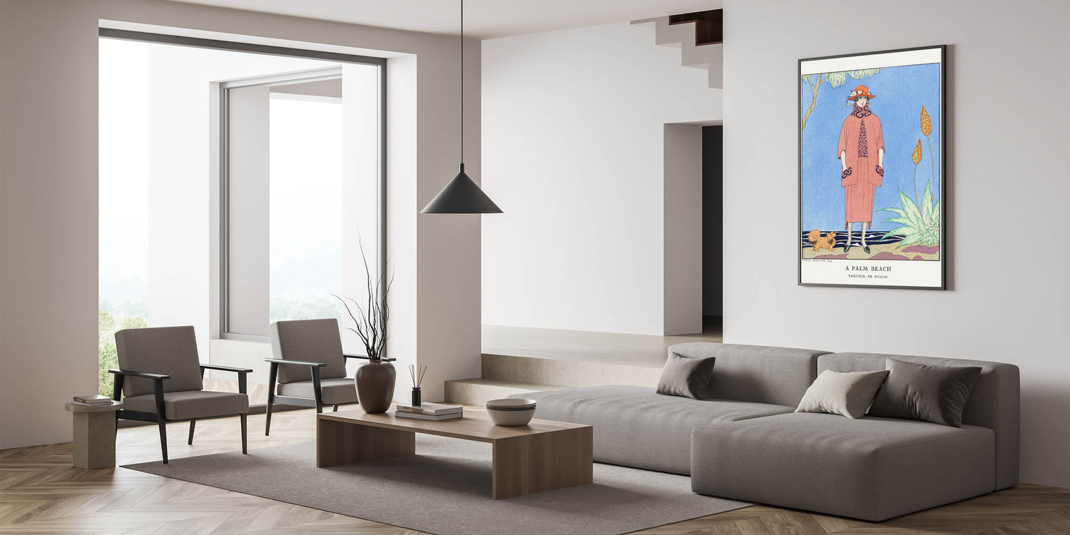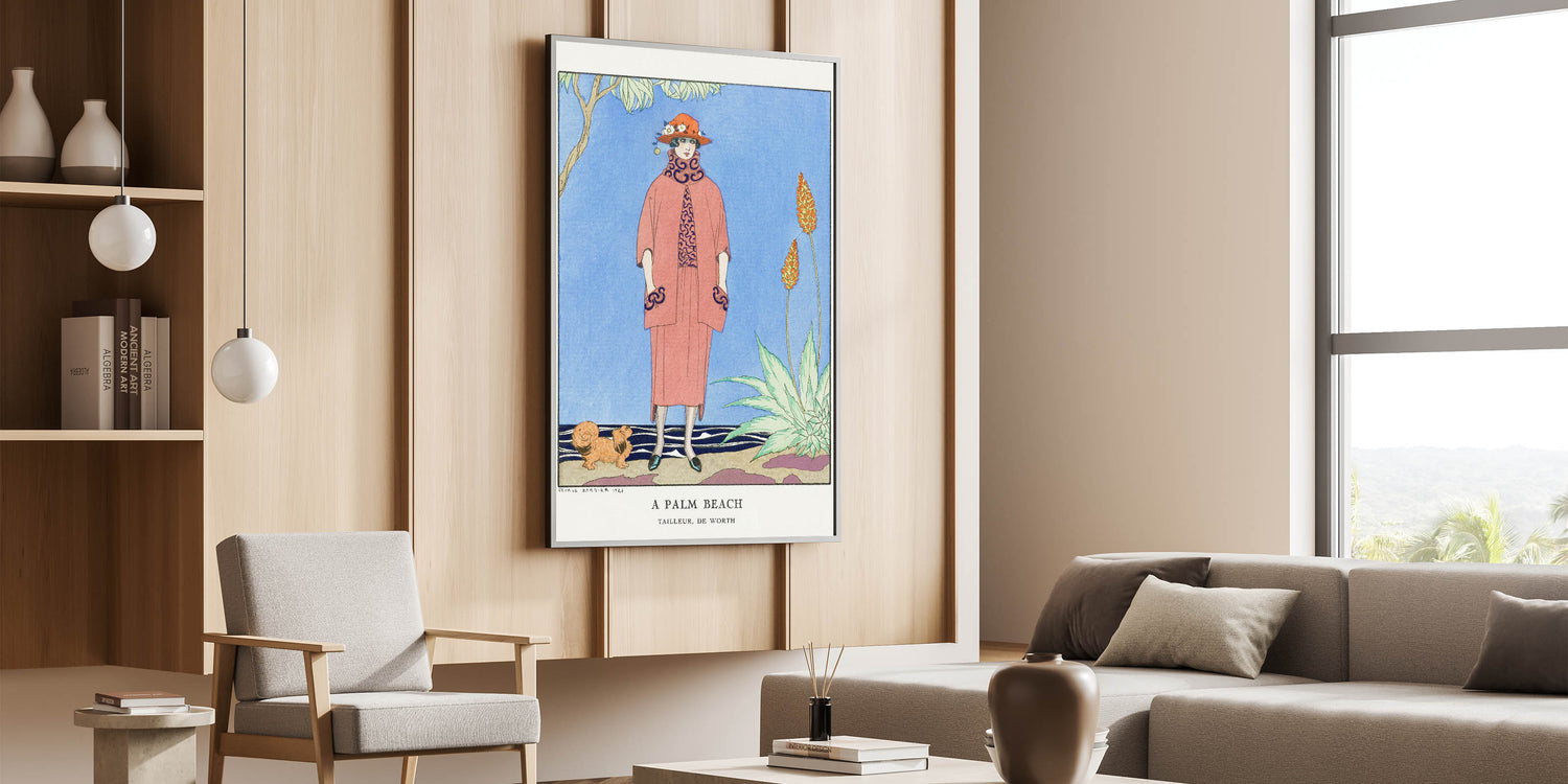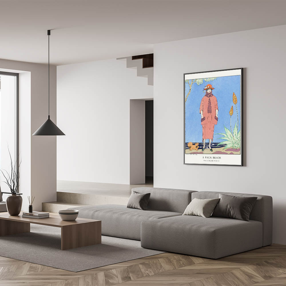 Transport yourself to a glamorous day in Palm Beach with this vibrant Art Deco wall art. This illustration features a sophisticated woman in stylish 1920s attire, complete with a bold hat and elegant coat, set against a scenic background with tropical plants and a serene sky. The bright colors and intricate details bring the charm and elegance of the Art Deco era to life, making it an ideal piece for any art lover.
