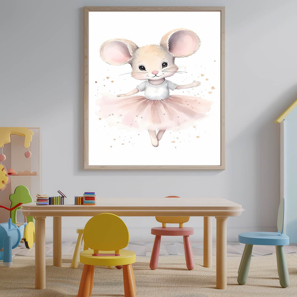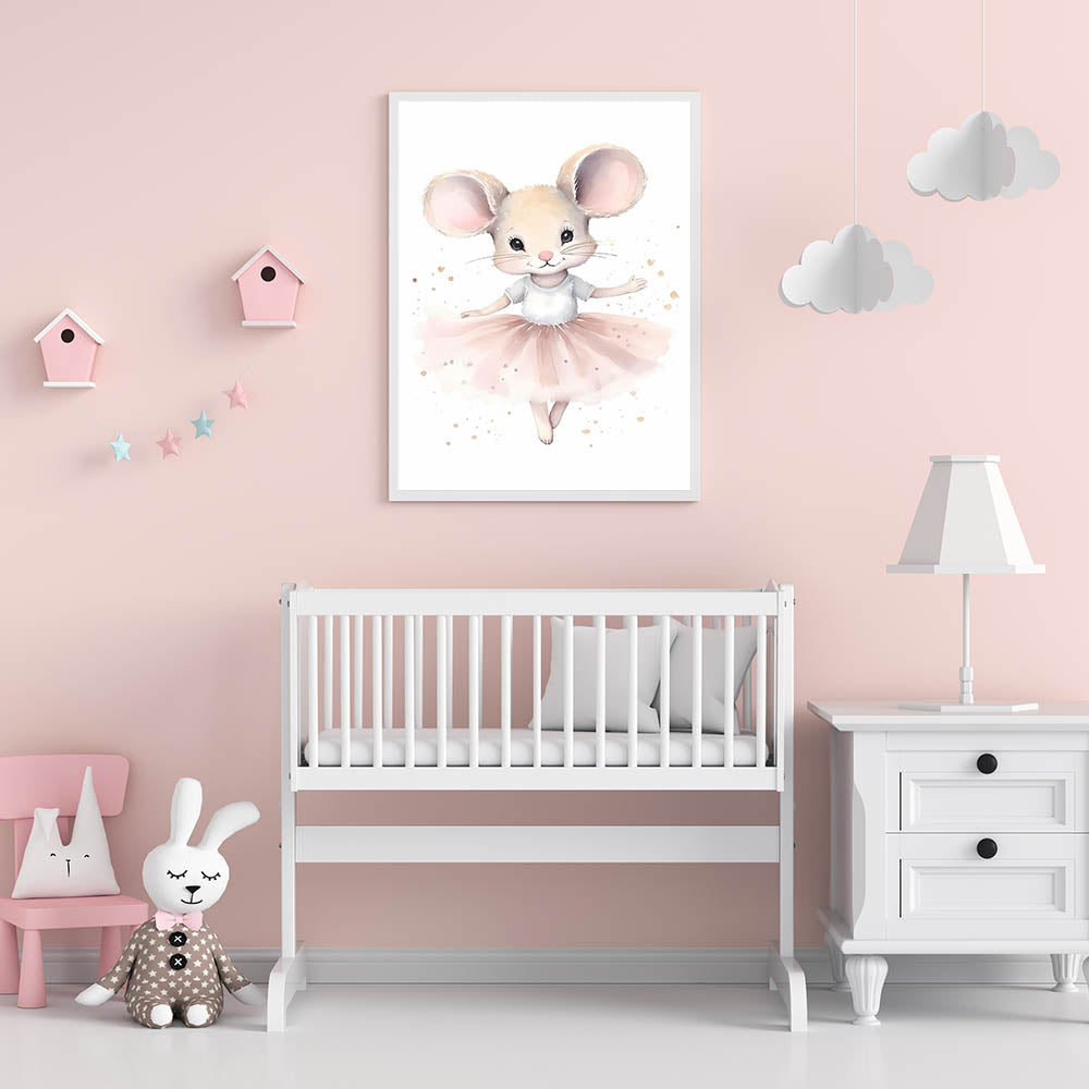 Create a dreamy and elegant space for your little one with this ballerina mouse nursery wall art. Featuring a graceful mouse twirling in a soft pink tutu, this enchanting illustration adds a whimsical and delicate charm to baby room decor. The soft beige, pink, and white tones make it a perfect fit for children’s wall art, blending beautifully with modern, classic, and ballet-themed nurseries.