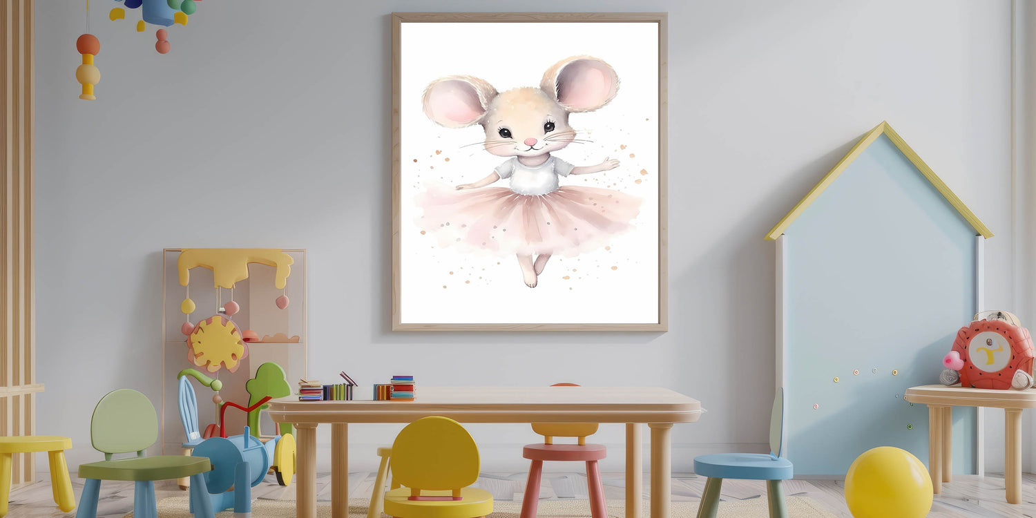 This framed nursery art is an ideal gift for ballet lovers, new parents, or as an elegant addition to a baby girl’s room. Whether in acrylic nursery art or canvas, this ballerina mouse print brings grace and joy to any child’s space.