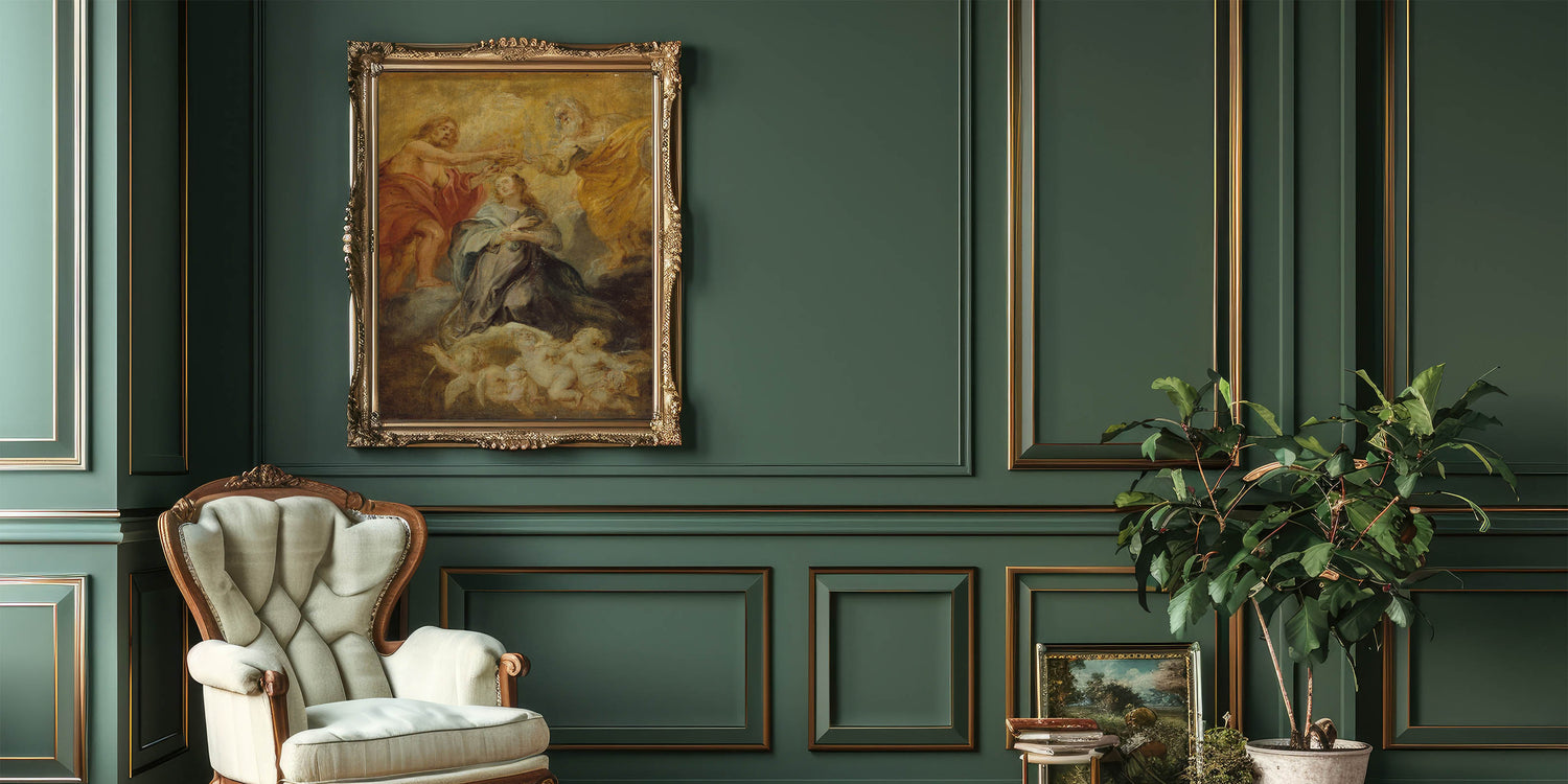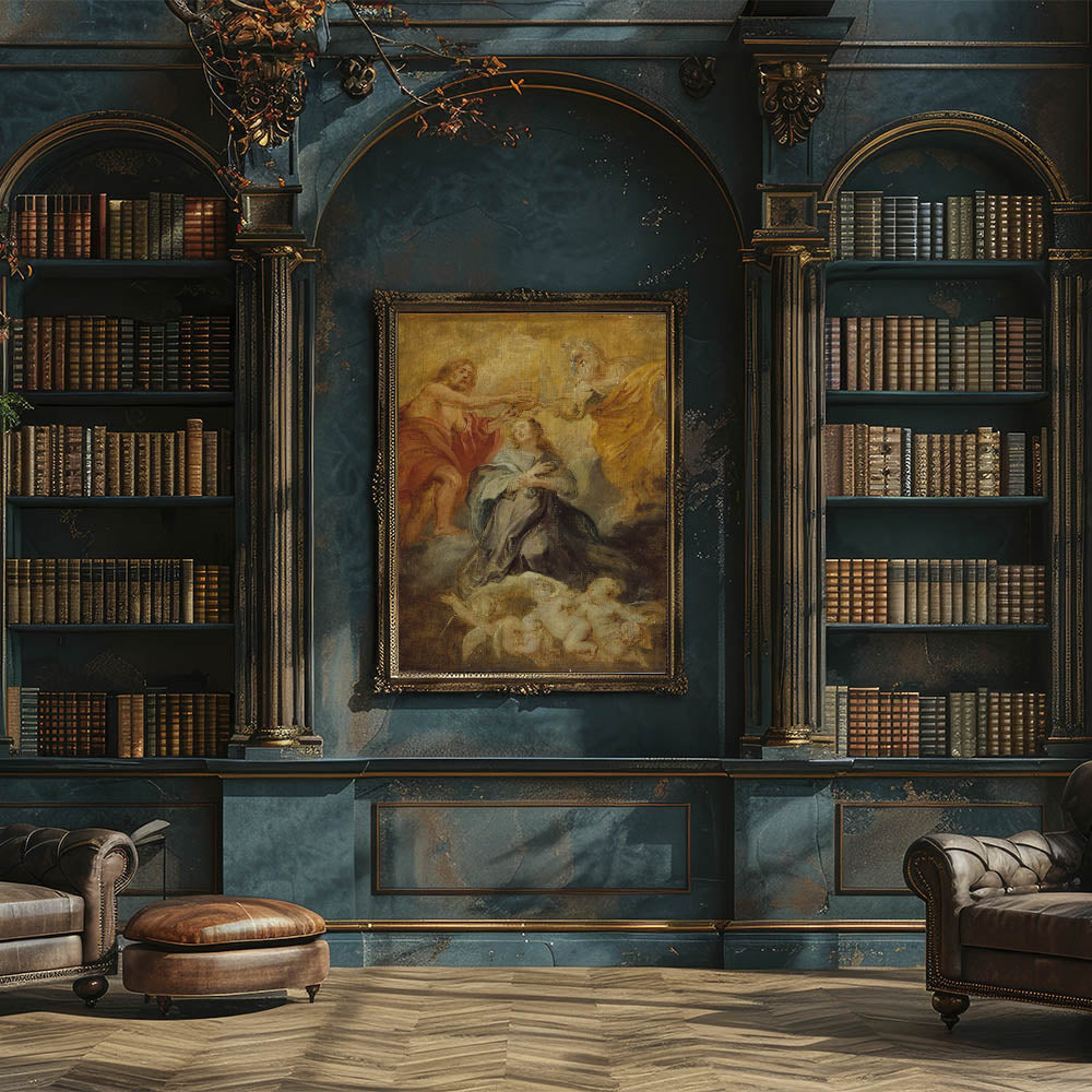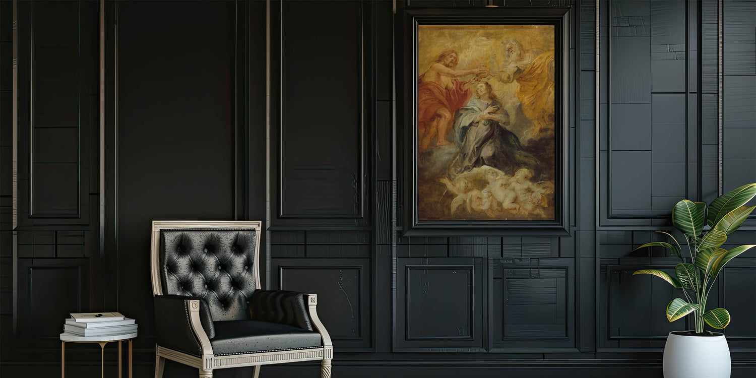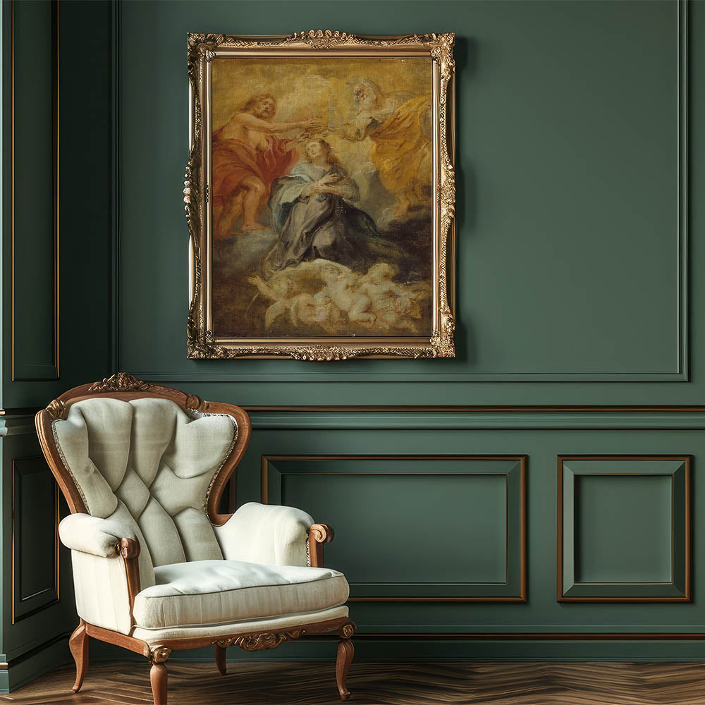 Embrace the heavenly beauty of Baroque art with this stunning depiction of "The Coronation of the Virgin." This masterpiece captures a sacred moment of divine glory, as cherubic figures and celestial light frame the central figures in an aura of ethereal grace. Rendered in soft, flowing strokes and warm tones, this artwork embodies the elegance and spiritual depth that define Baroque and Rococo décor.