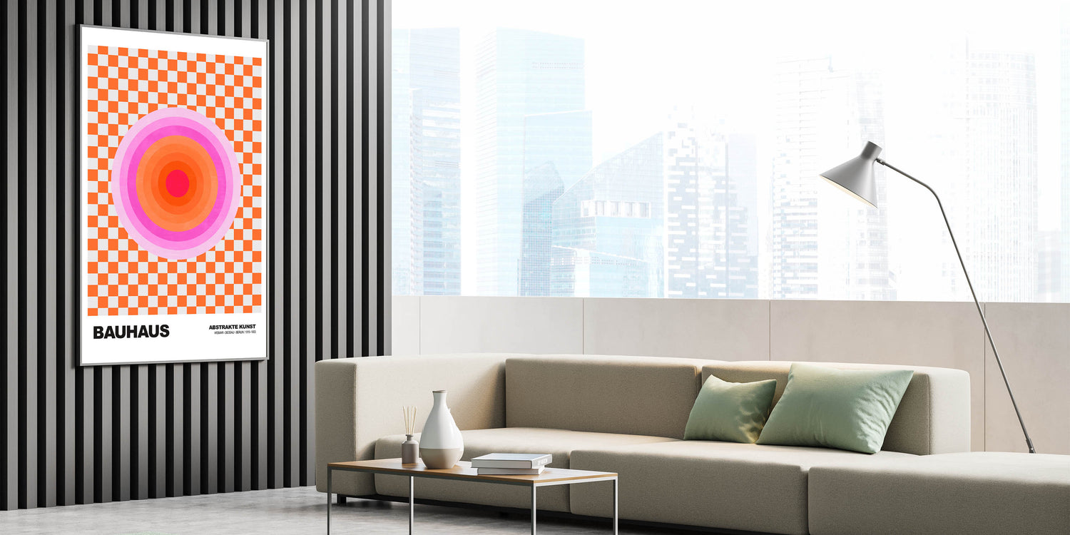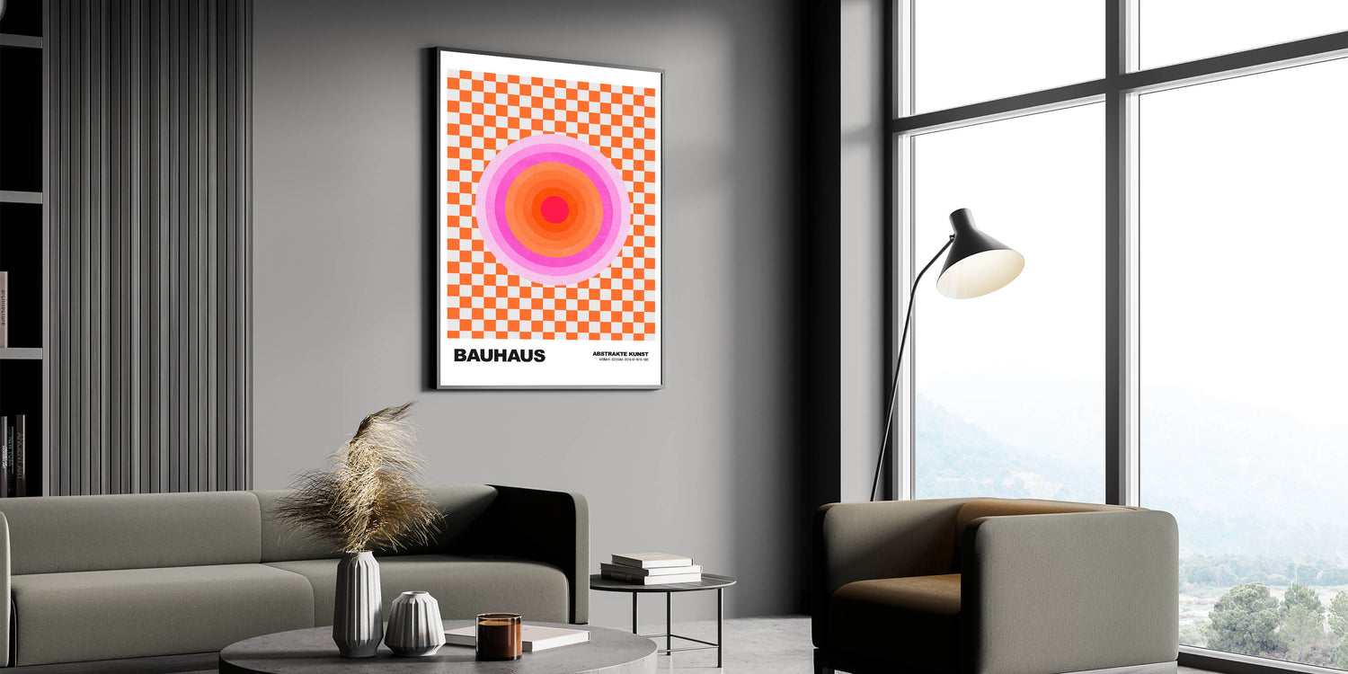 Bring a vibrant touch to your space with this Bauhaus-inspired abstract art piece. Featuring concentric circles in shades of pink and orange over a dynamic orange and white checkered background, this artwork exudes a retro yet modern vibe. The bold colors and geometric patterns make it a perfect addition to any interior that embraces eclectic or contemporary styles. Available in multiple materials, including stretched canvas, framed canvas, acrylic glass, and more, this piece can be tailored to suit your home or office decor.