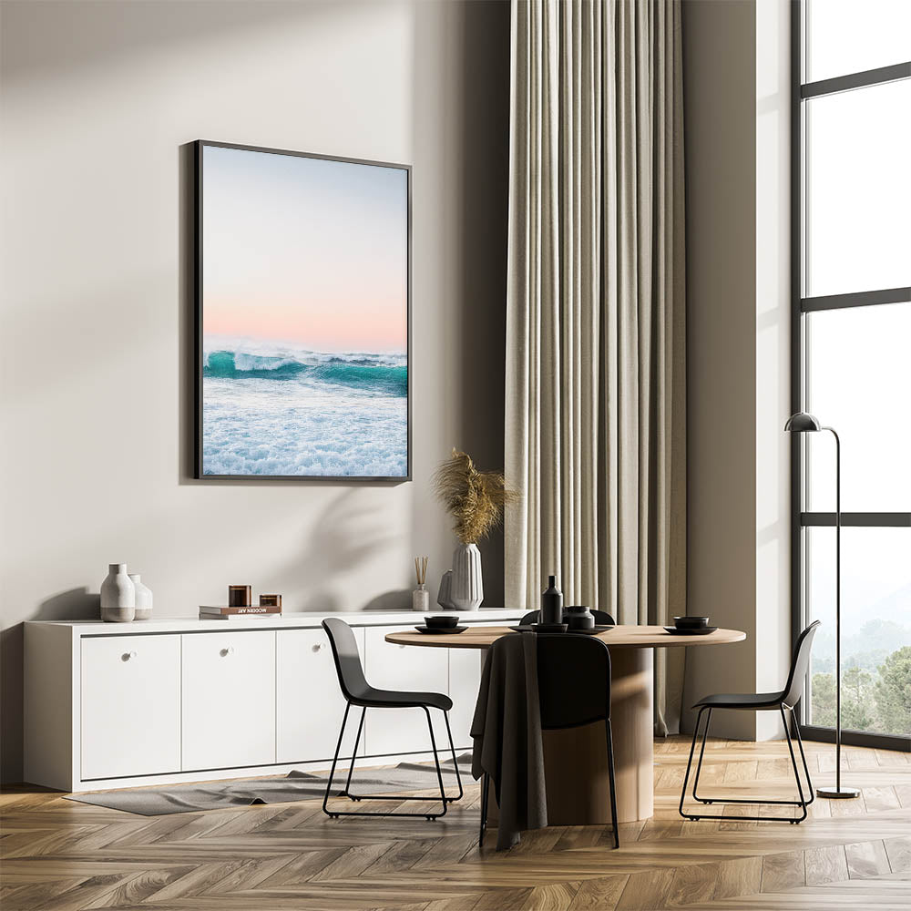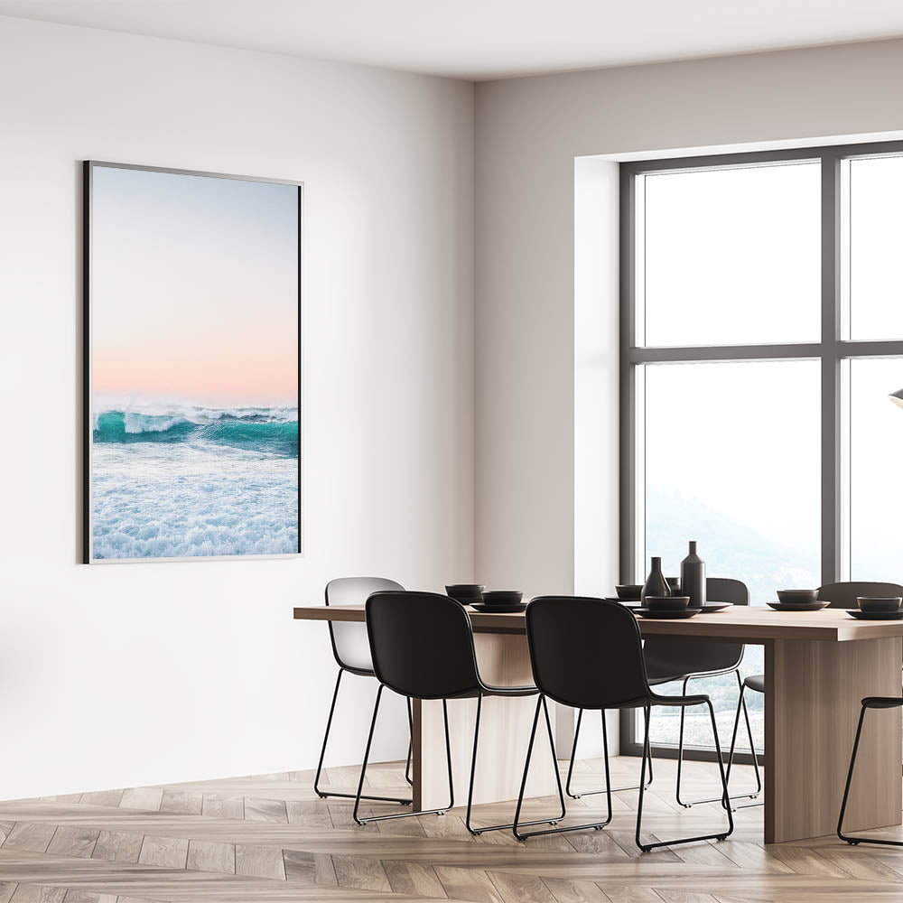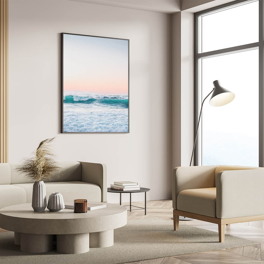 Experience the serenity of the sea with this mesmerizing beach decor print. Featuring rolling turquoise waves beneath a soft pastel sunset, this artwork captures the beauty and power of the ocean. The blend of vibrant blue tones and warm pink hues makes it perfect for adding a touch of seasonal home decor to your space.