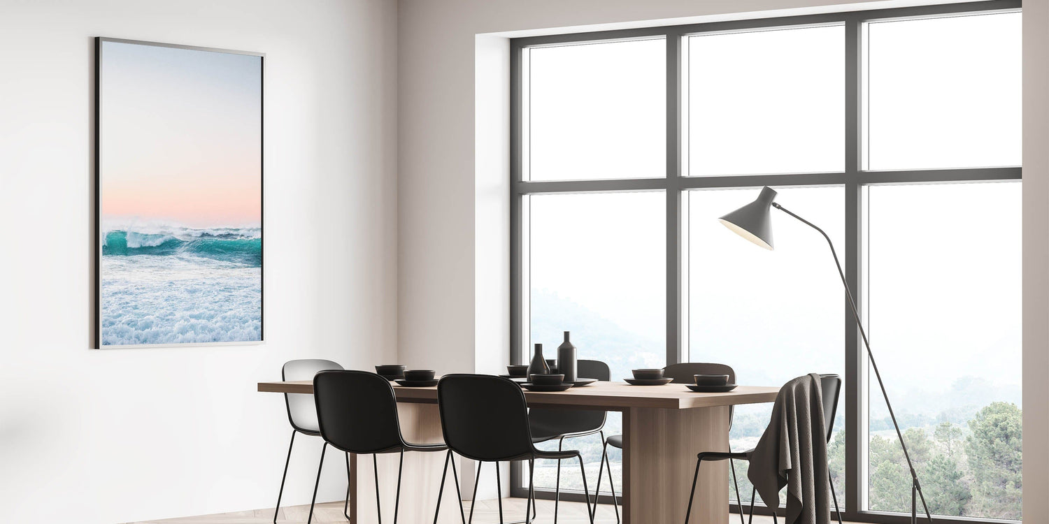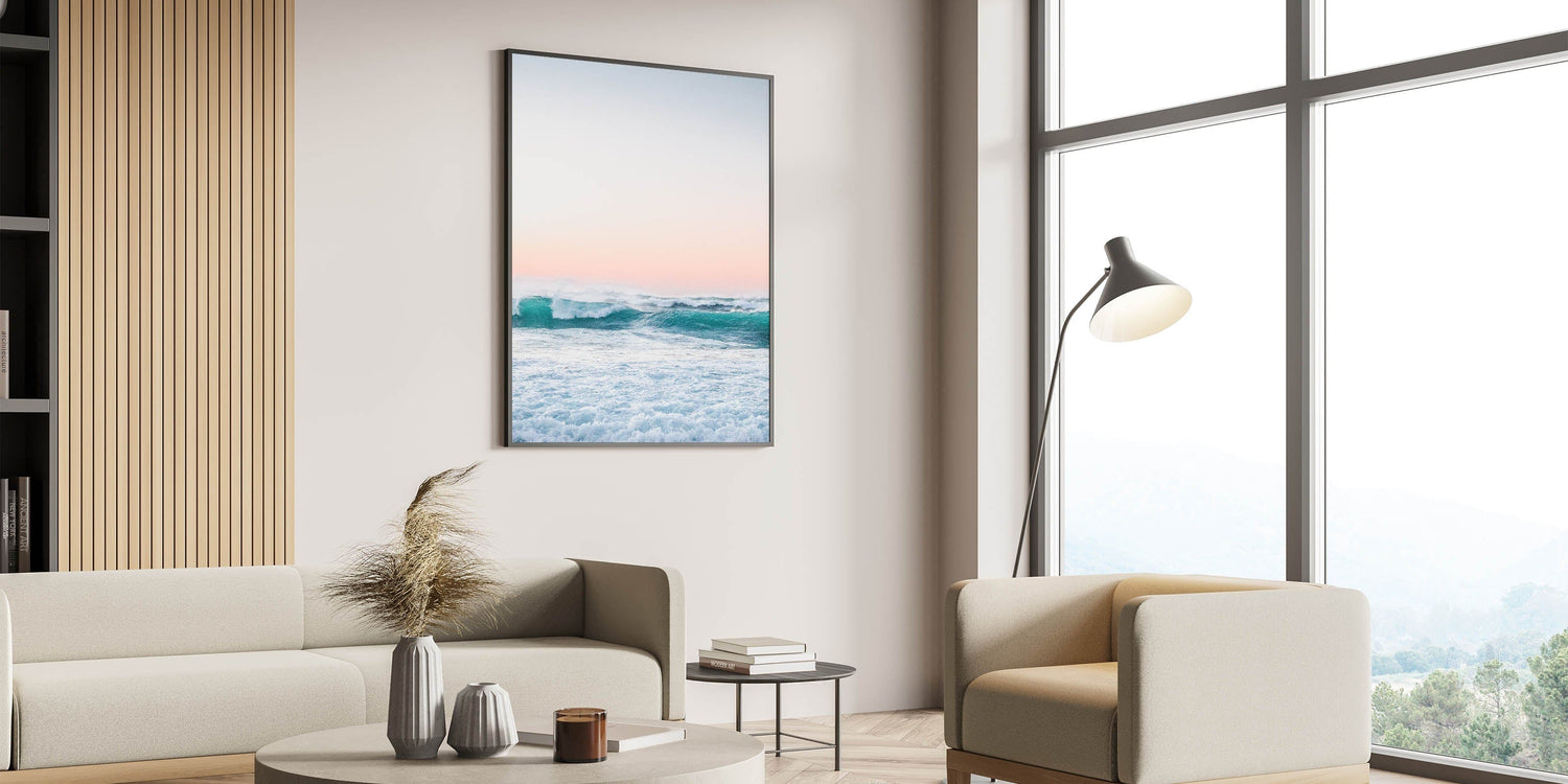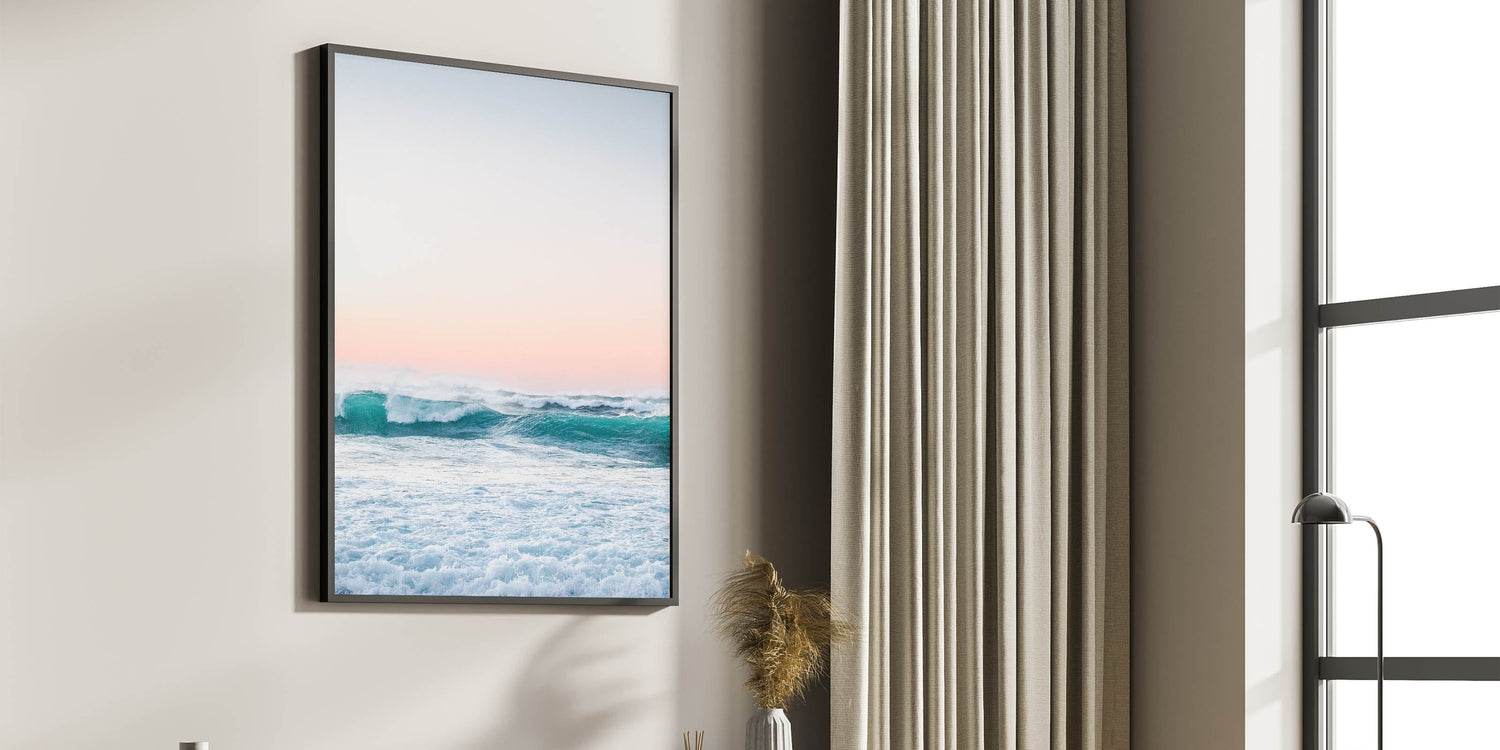 Experience the serenity of the sea with this mesmerizing beach decor print. Featuring rolling turquoise waves beneath a soft pastel sunset, this artwork captures the beauty and power of the ocean. The blend of vibrant blue tones and warm pink hues makes it perfect for adding a touch of seasonal home decor to your space.