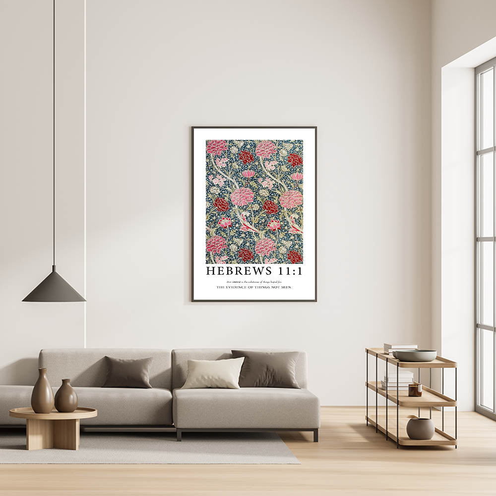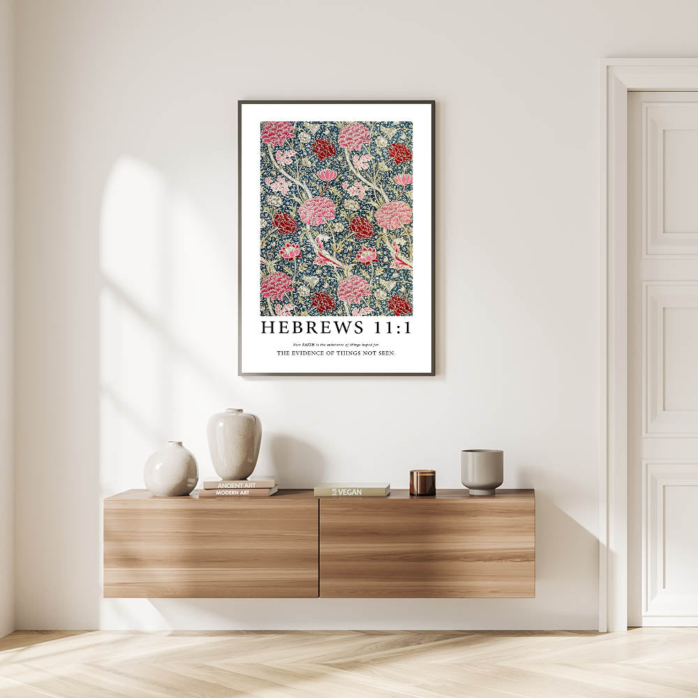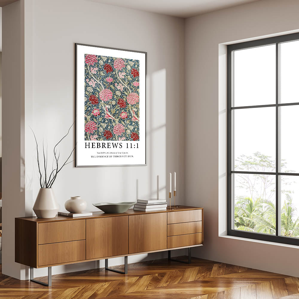 Inspire your space with our Biblical Typography Wall Art featuring Hebrews 11:1: "Now faith is the substance of things hoped for, the evidence of things not seen." This vibrant design combines the powerful scripture with intricate floral patterns in bold shades of pink, red, and blue. The artistic floral imagery and meaningful verse create an uplifting atmosphere, making it a perfect addition to living rooms, offices, or spiritual spaces.