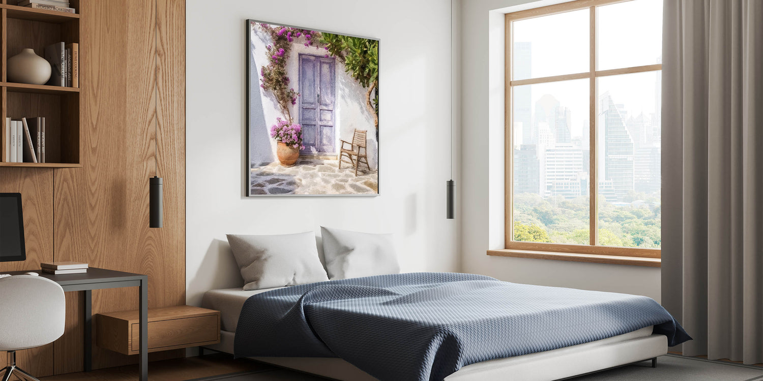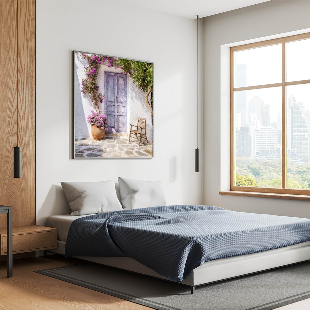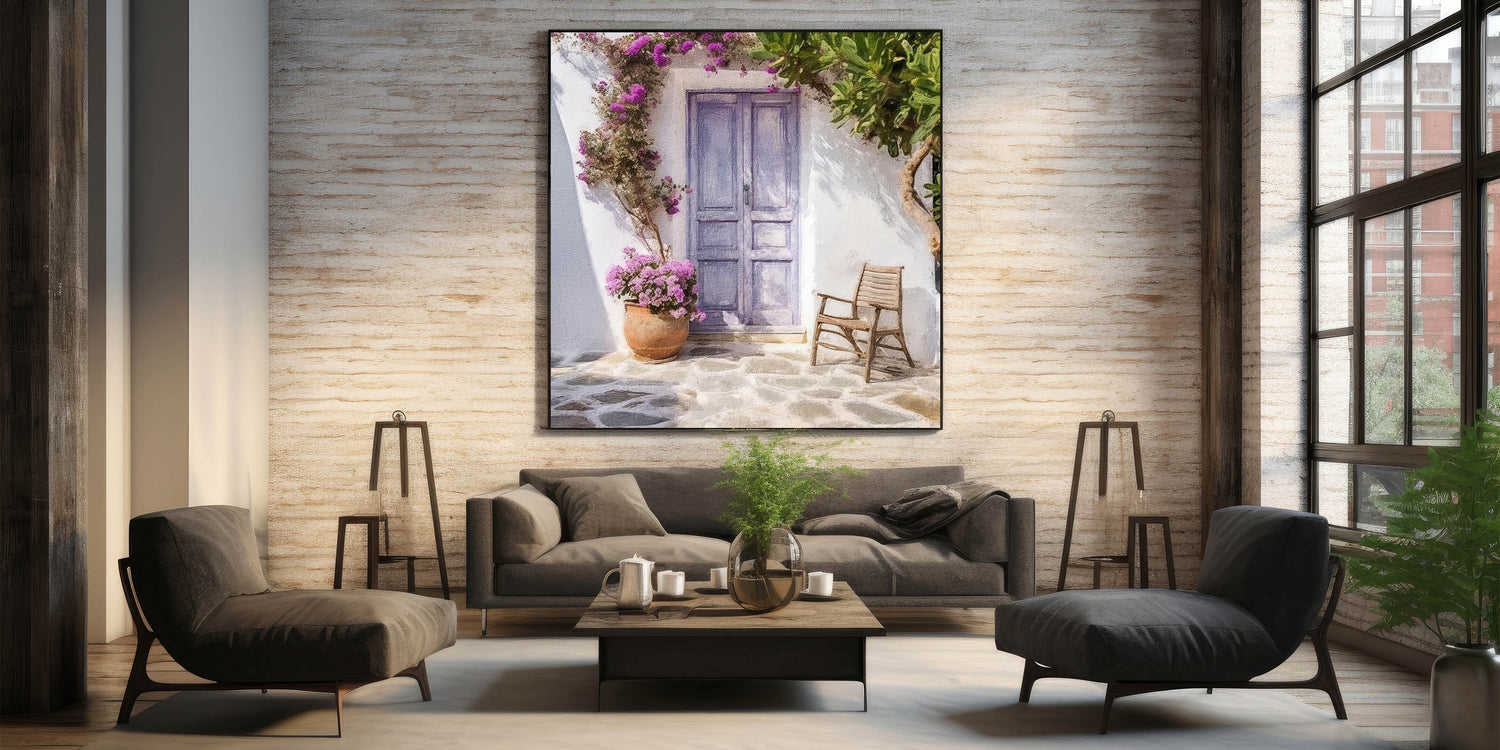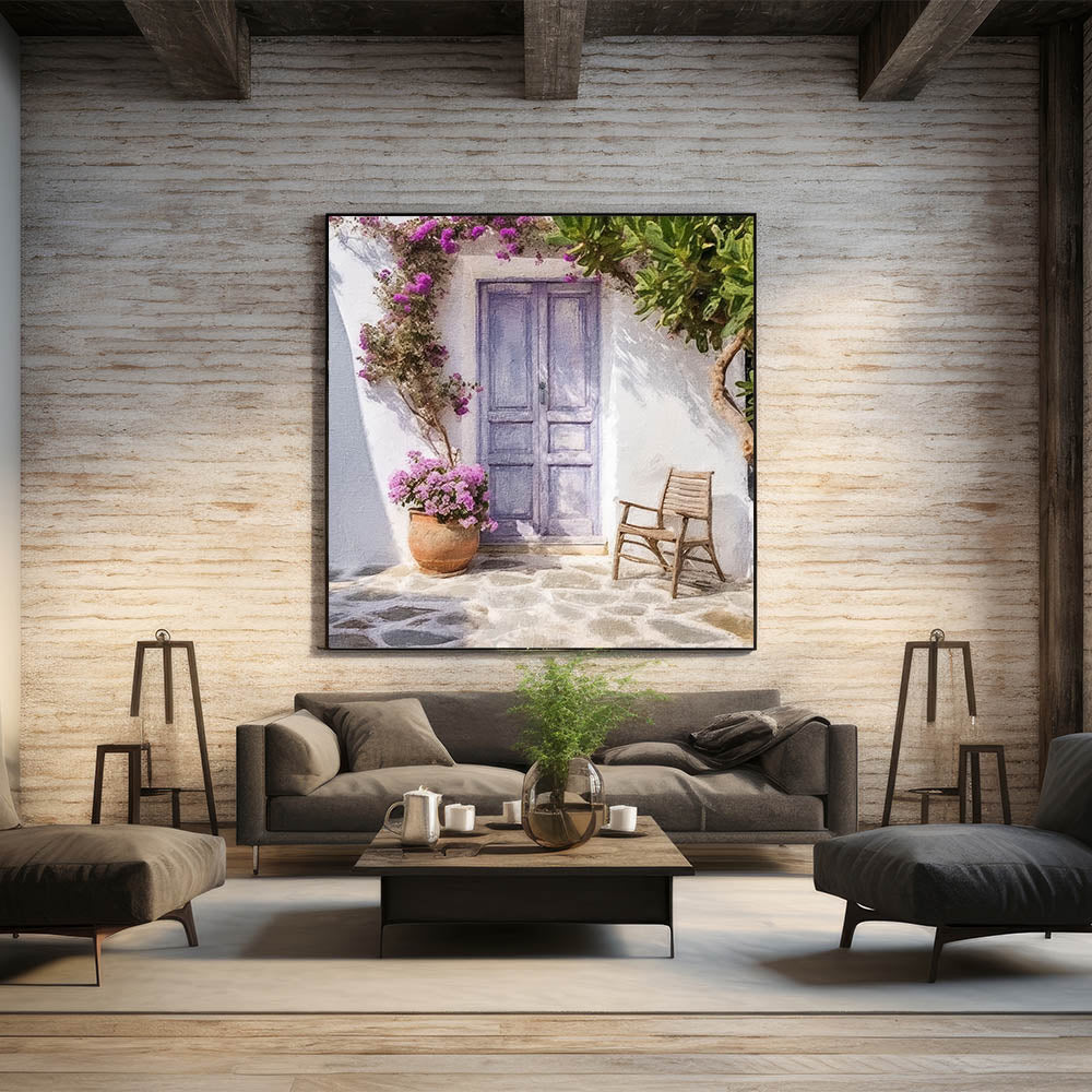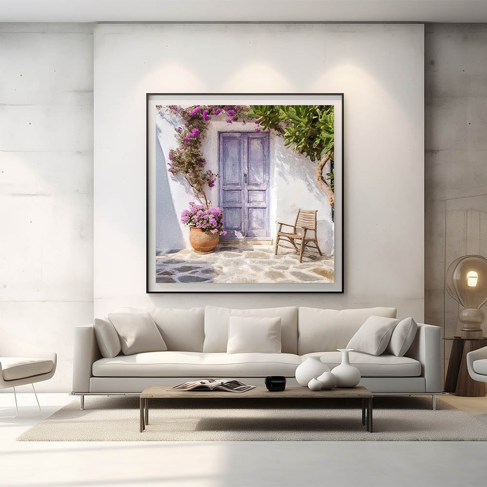Bring the tranquil charm of the Mediterranean into your home with our Blue Door Canvas Print. This artwork features a pastel blue Greek door surrounded by vibrant pink flowers and lush green foliage. A rustic wooden chair and a terracotta pot filled with blooming flowers complete the cozy scene, evoking the peaceful vibe of a traditional Greek courtyard. The soft color palette and delicate details capture the essence of Greek island living, making this piece a perfect choice for those seeking a touch of elegance and serenity in their decor.