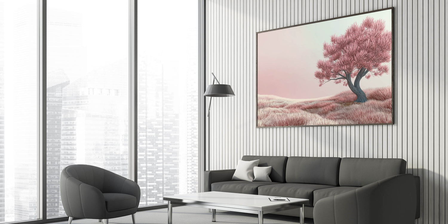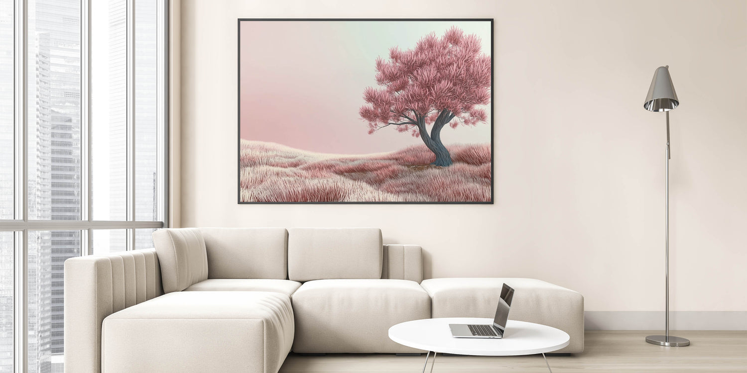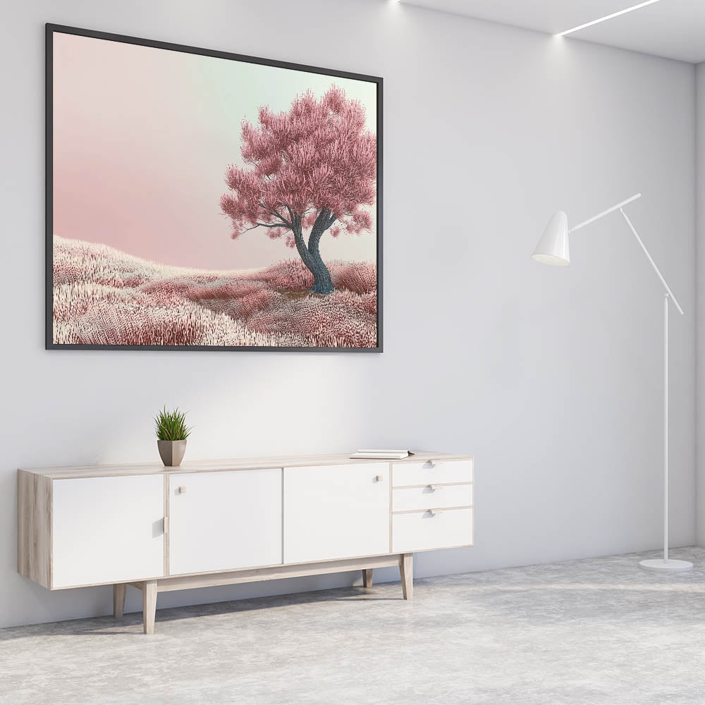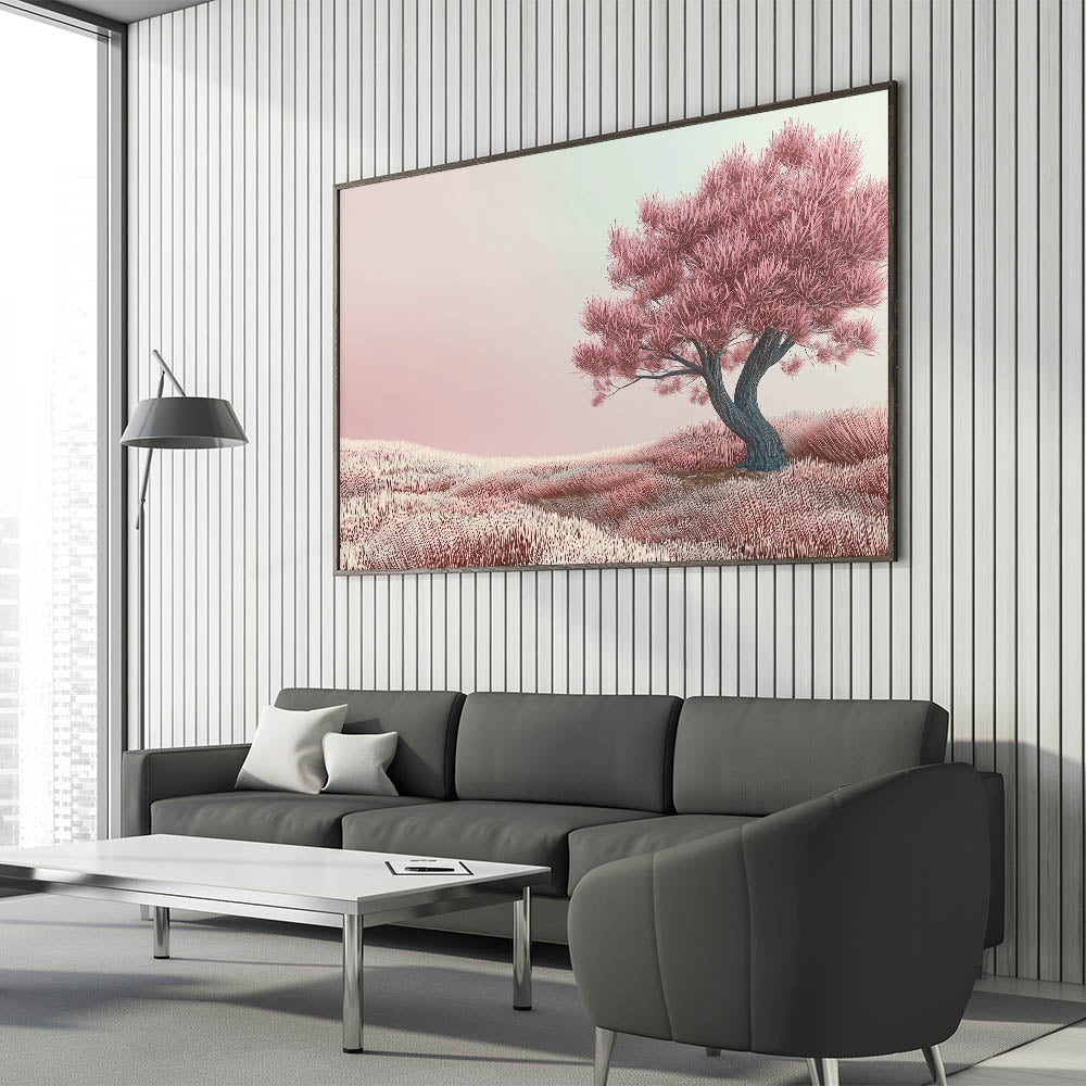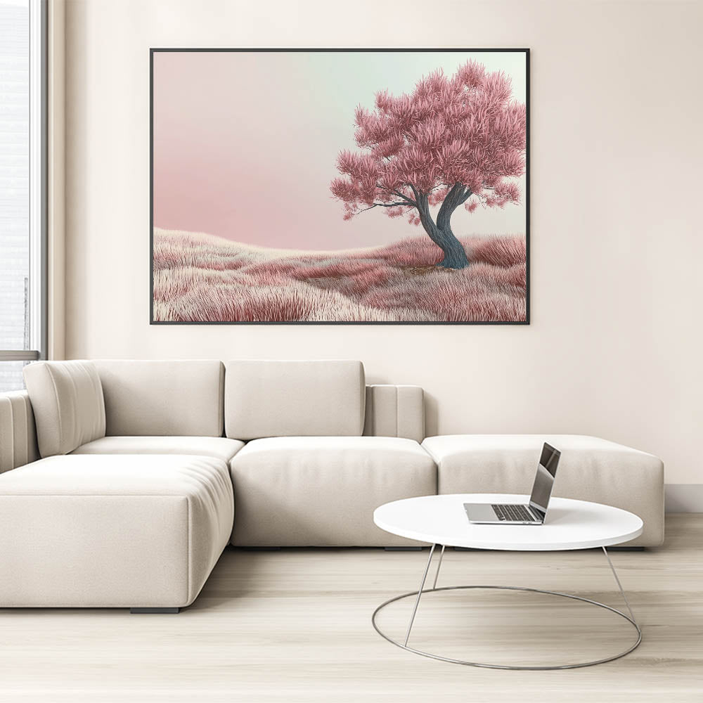 Transform your space with the gentle beauty of the Blush Meadow Abstract Floral Wall Art. This serene artwork features a solitary tree adorned with blush pink foliage, standing gracefully amidst a flowing meadow of soft textures. The subtle pastel tones of pink and muted blue create an atmosphere of tranquility, making it a perfect choice for contemporary, minimalist, or Scandinavian interiors.