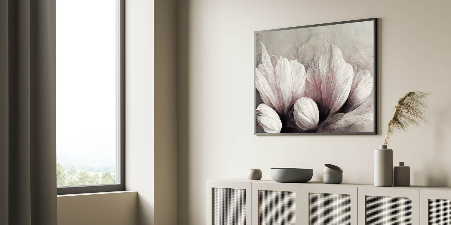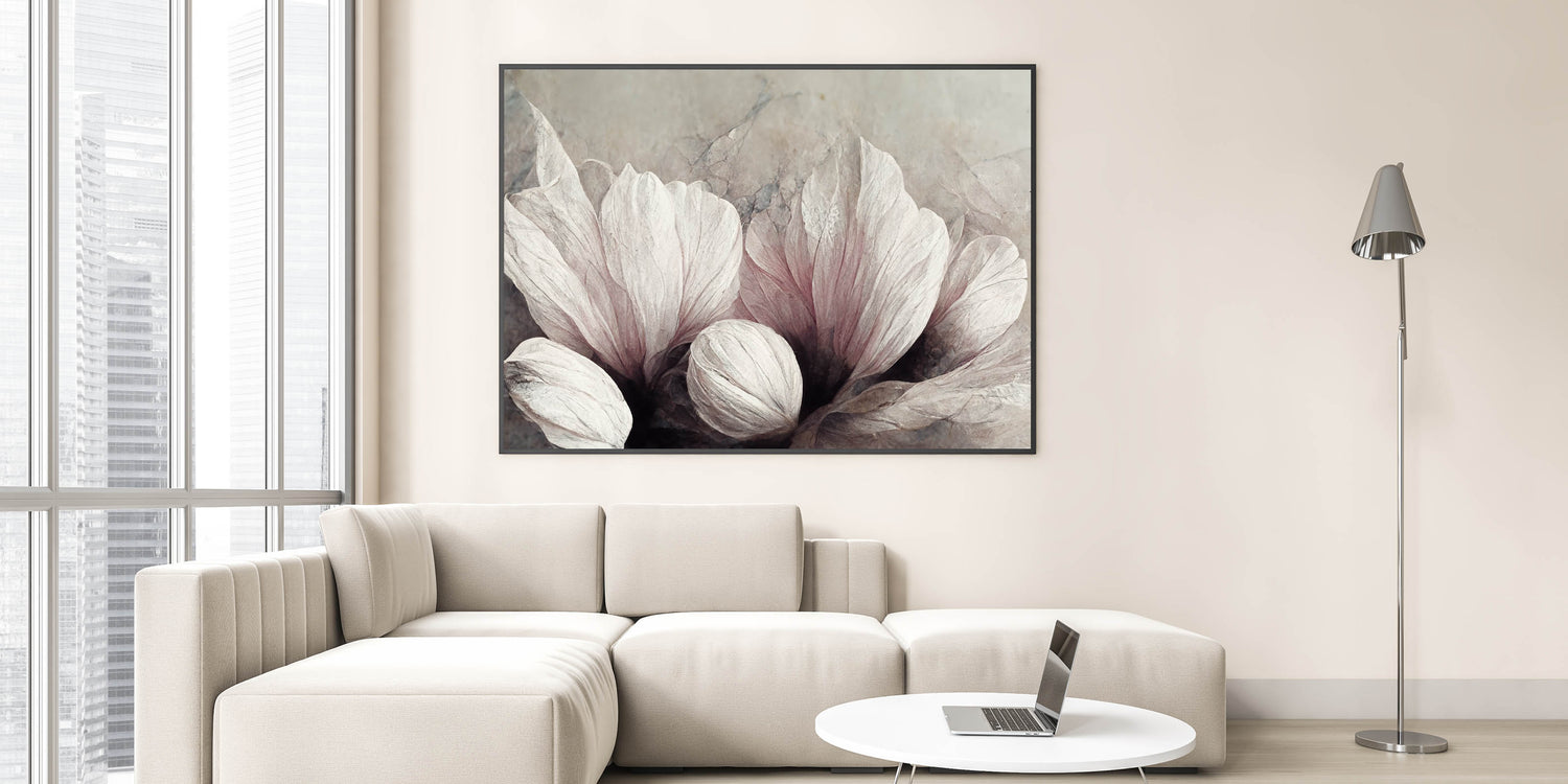 This abstract art piece beautifully blends floral elegance with modern aesthetics. Whether used as large wall art or a smaller framed display, its delicate hues and organic composition bring warmth and sophistication to your home.