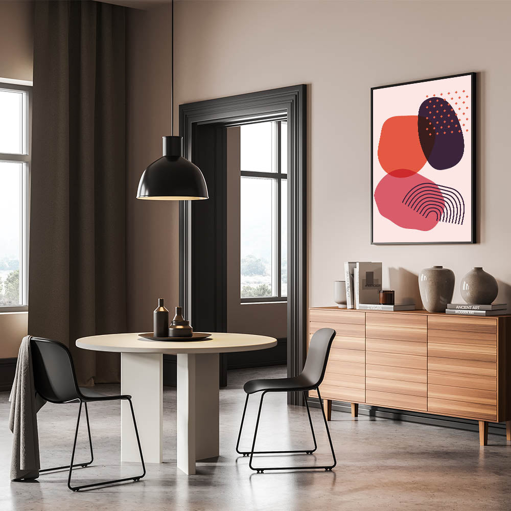 The rich mix of red, pink, and dark plum tones creates an eye-catching contrast that will brighten any room. Whether you're decorating a living room, bedroom, or office, this abstract bohemian canvas brings a vibrant and creative flair to your space. Its unique design makes it a perfect piece to complement a variety of decor styles, from modern to boho chic.