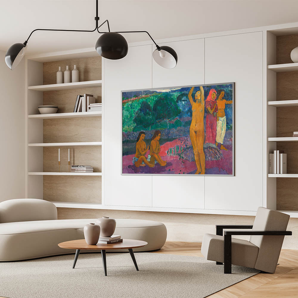 Immerse yourself in the vivid world of Polynesian culture with this modern wall art, inspired by Paul Gauguin's expressive portrayal of island life. This artwork features a rich palette of greens, pinks, and earthy tones, depicting figures in a natural landscape, surrounded by lush vegetation and dramatic skies. Perfect for trendy home decor, this unique modern art piece brings cultural depth and bold colors to any room, making it an ideal choice for those who appreciate history and diversity in art.