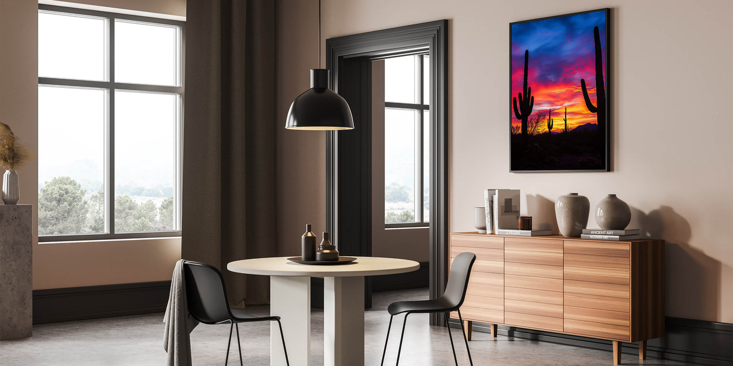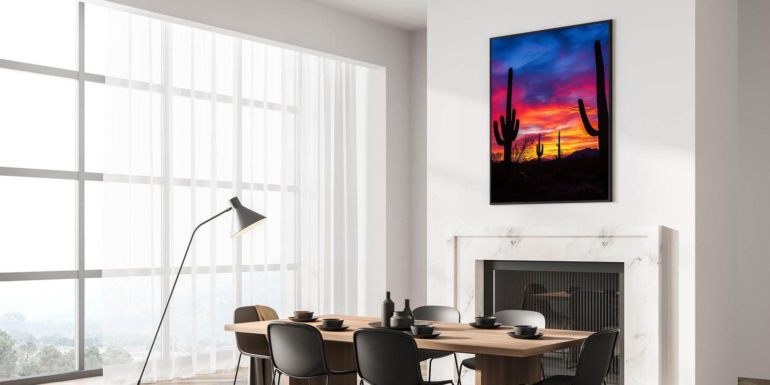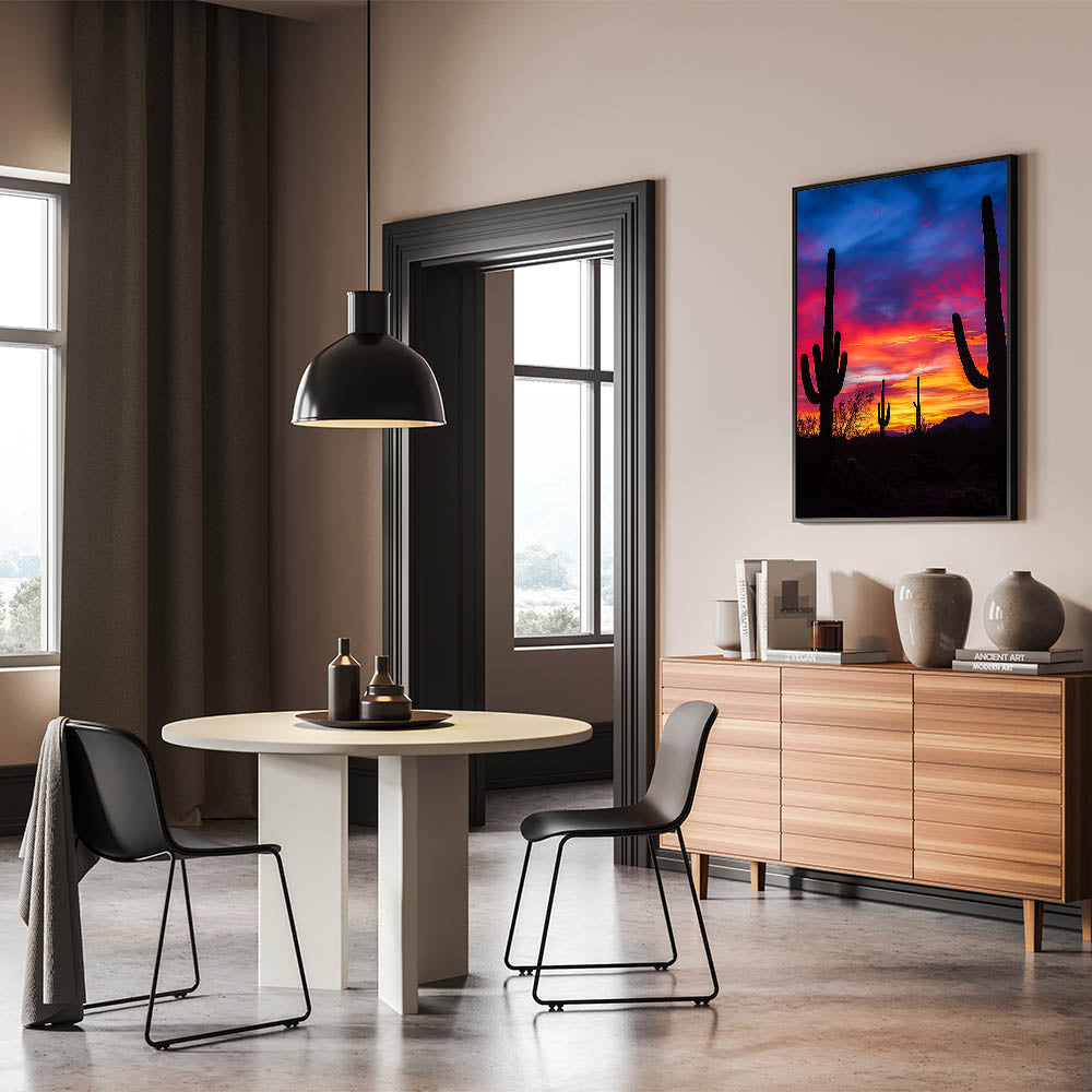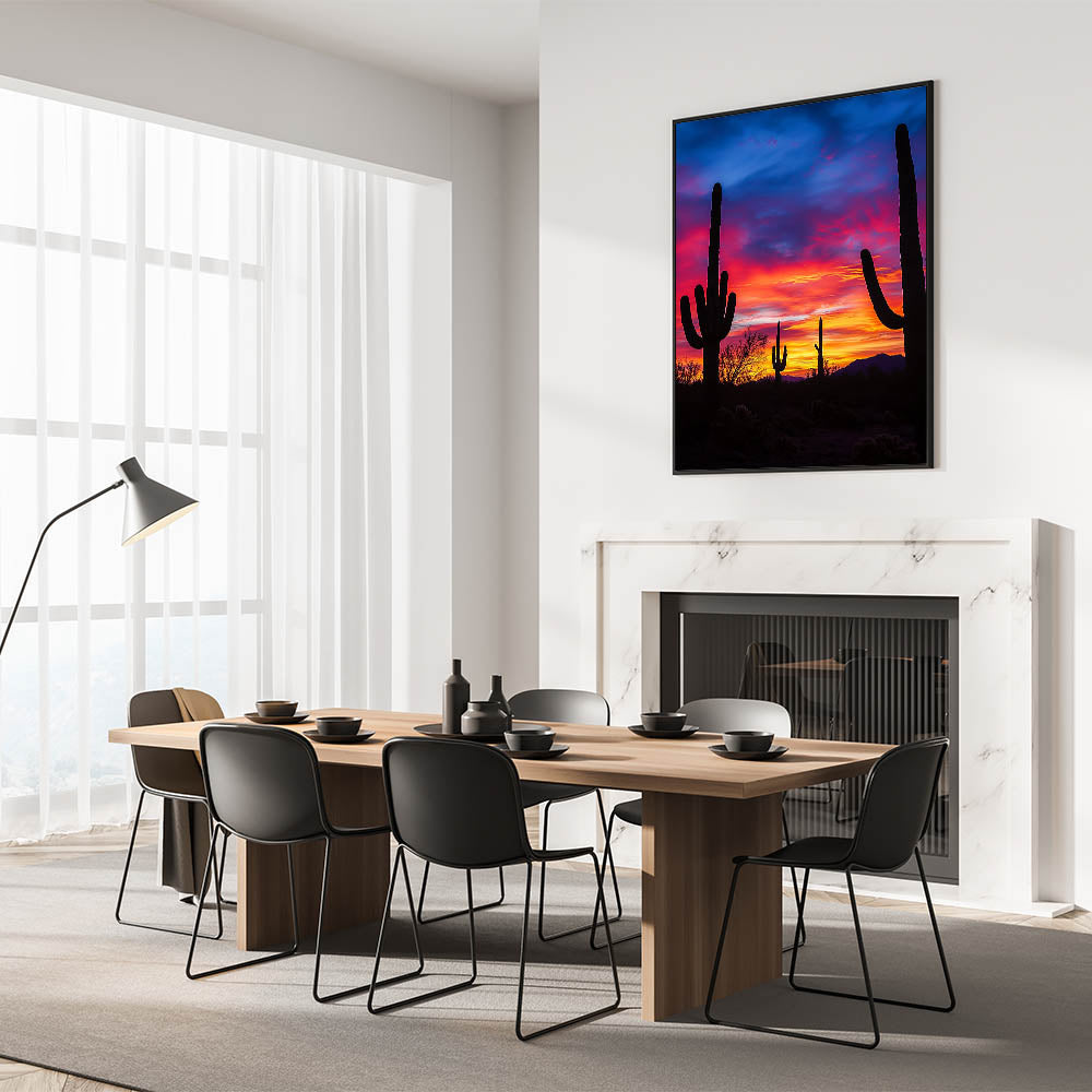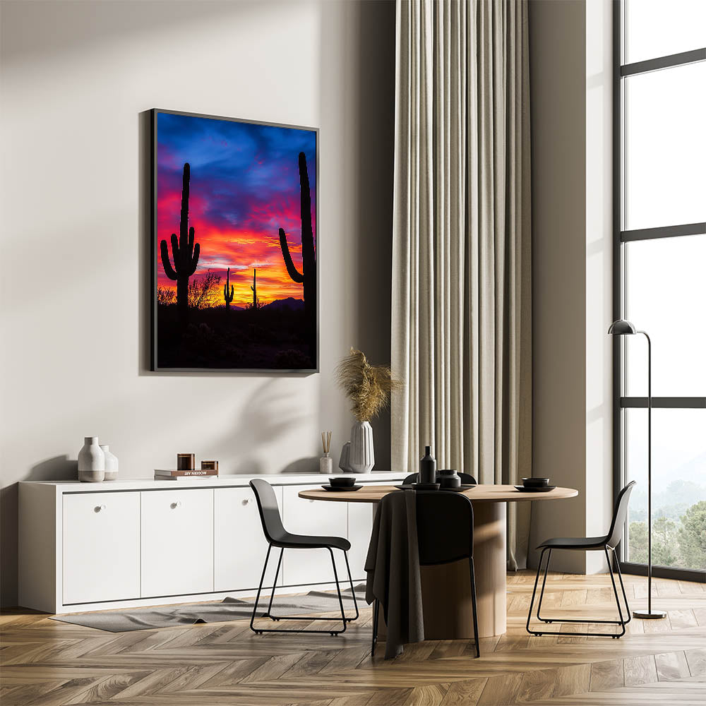 Experience the captivating beauty of the desert with this vibrant wall art featuring silhouetted cacti against a stunning desert sunset. The vivid hues of pink, orange, and blue blend seamlessly to create a mesmerizing Southwestern scene that radiates warmth and tranquility.