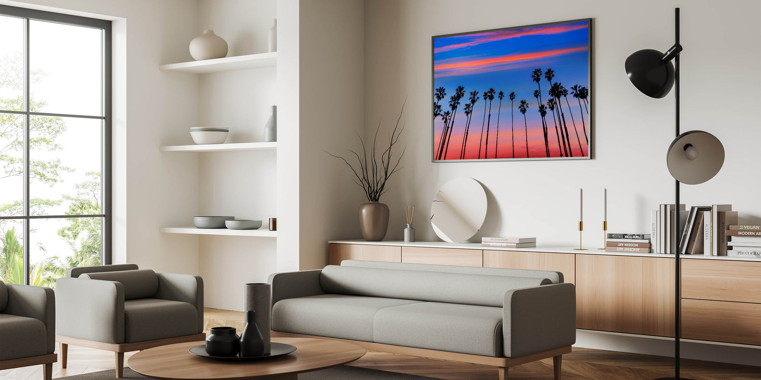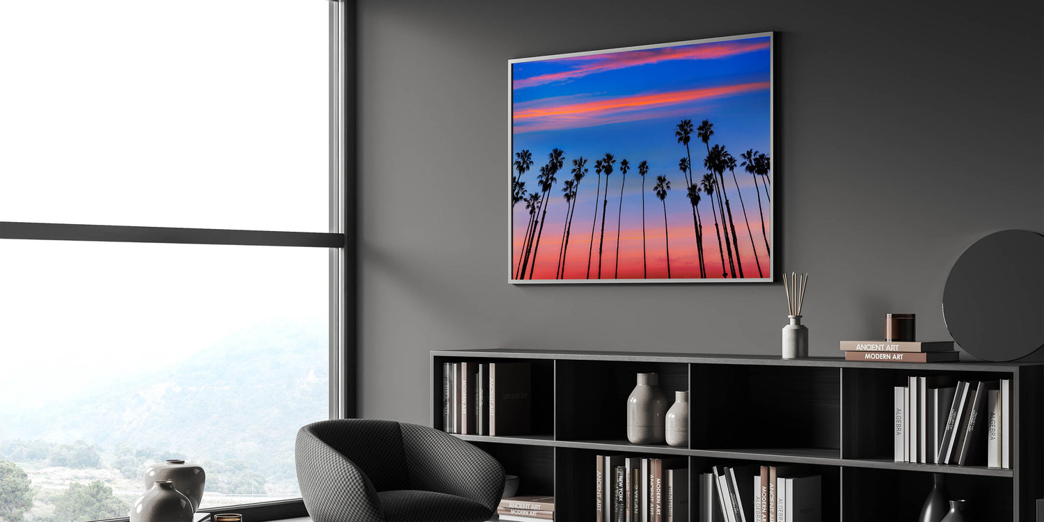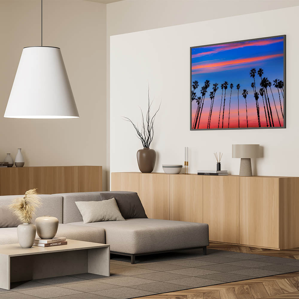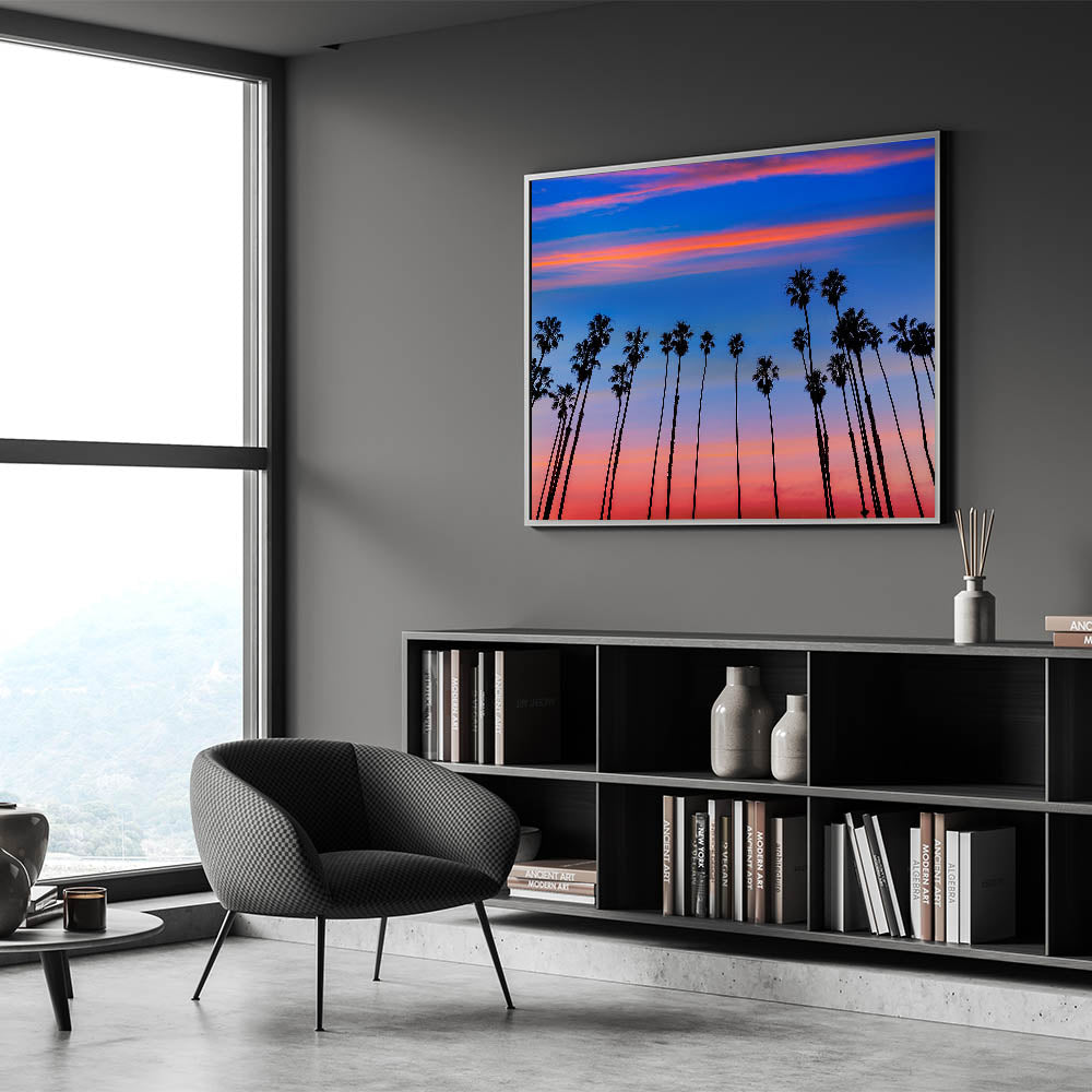 Experience the serene beauty of California's coastline with this captivating art print, showcasing tall palm trees set against a stunning twilight sky. The blend of deep blue, pink, and red hues captures the magic of the sunset, making it an ideal piece for coastal-themed decor. Perfect for adding a touch of vibrant California beach scenery to any space, this artwork highlights the tranquil charm of the coast.