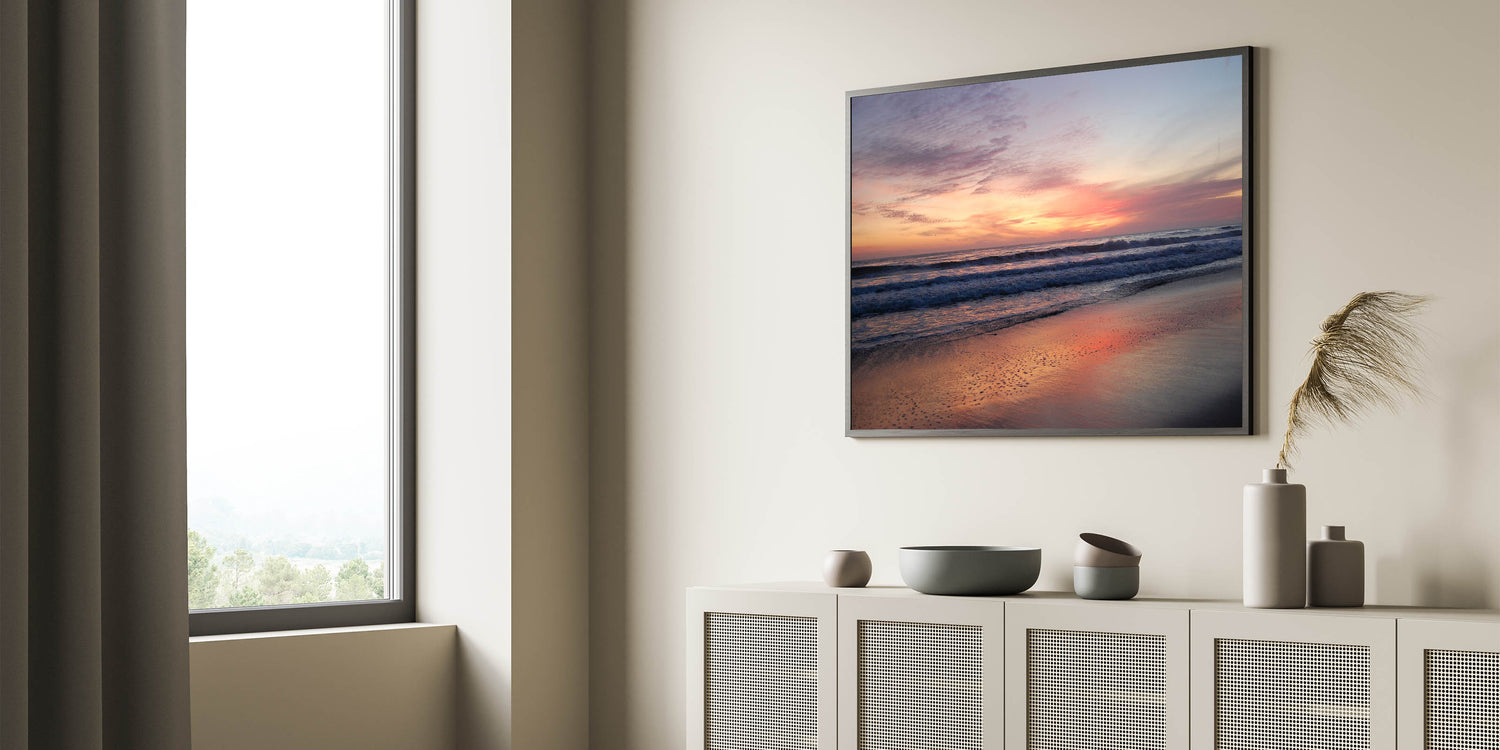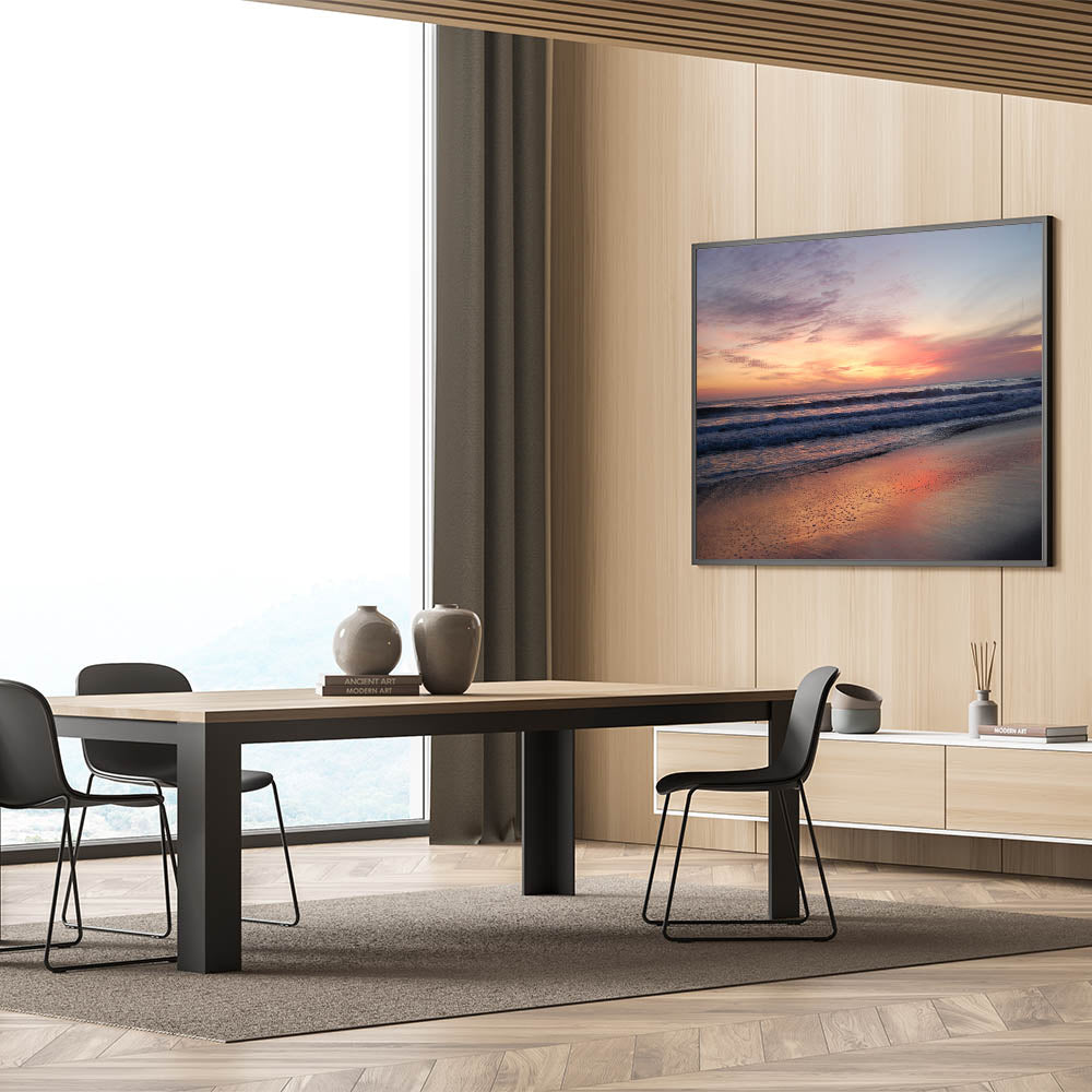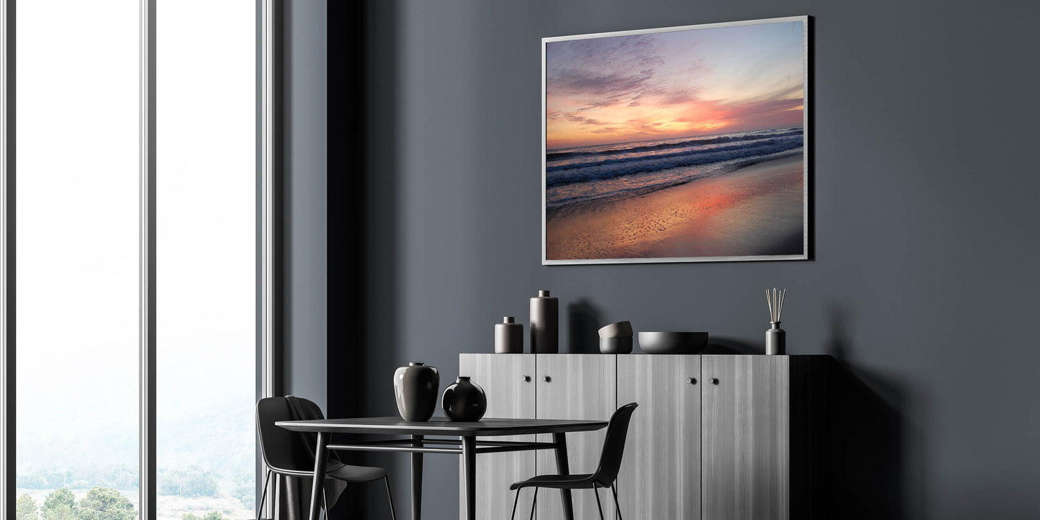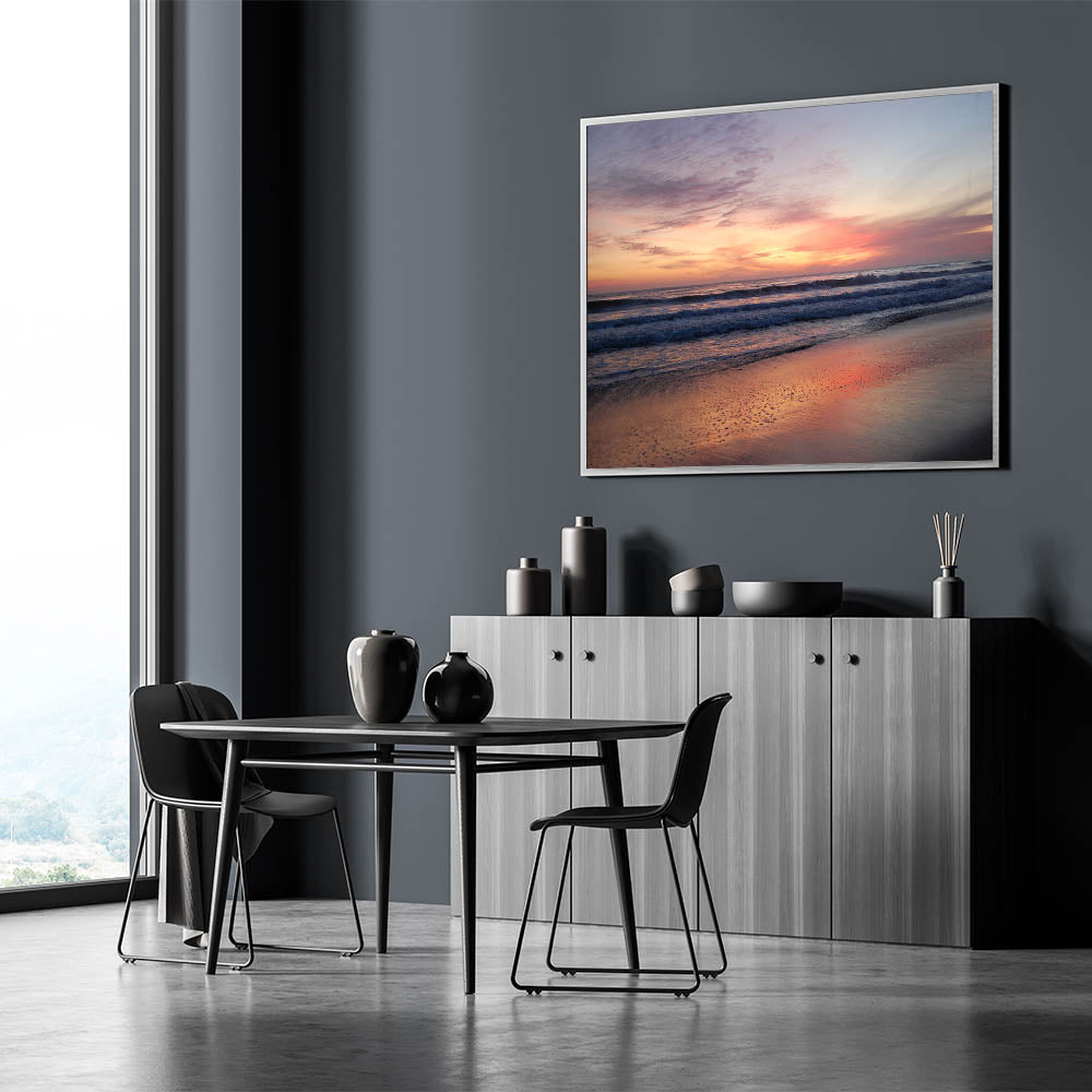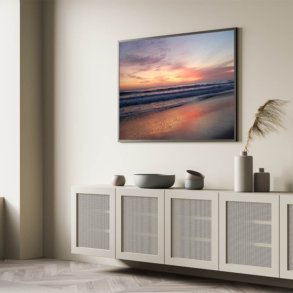 • High-quality coastal sunset art available on canvas, framed, and acrylic.