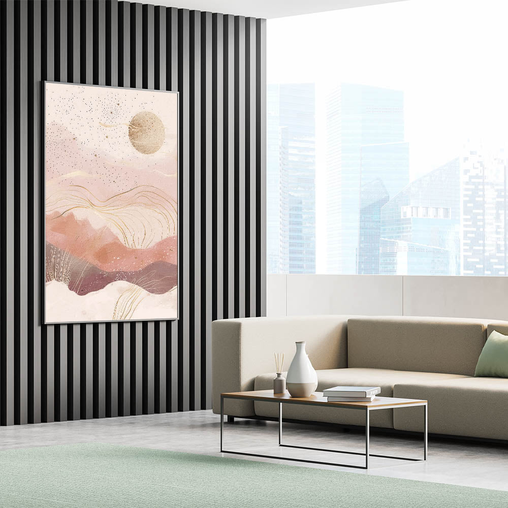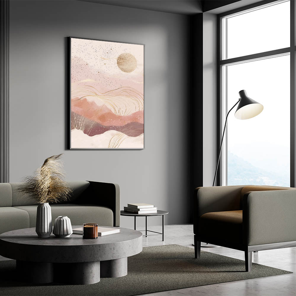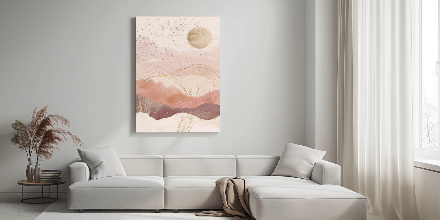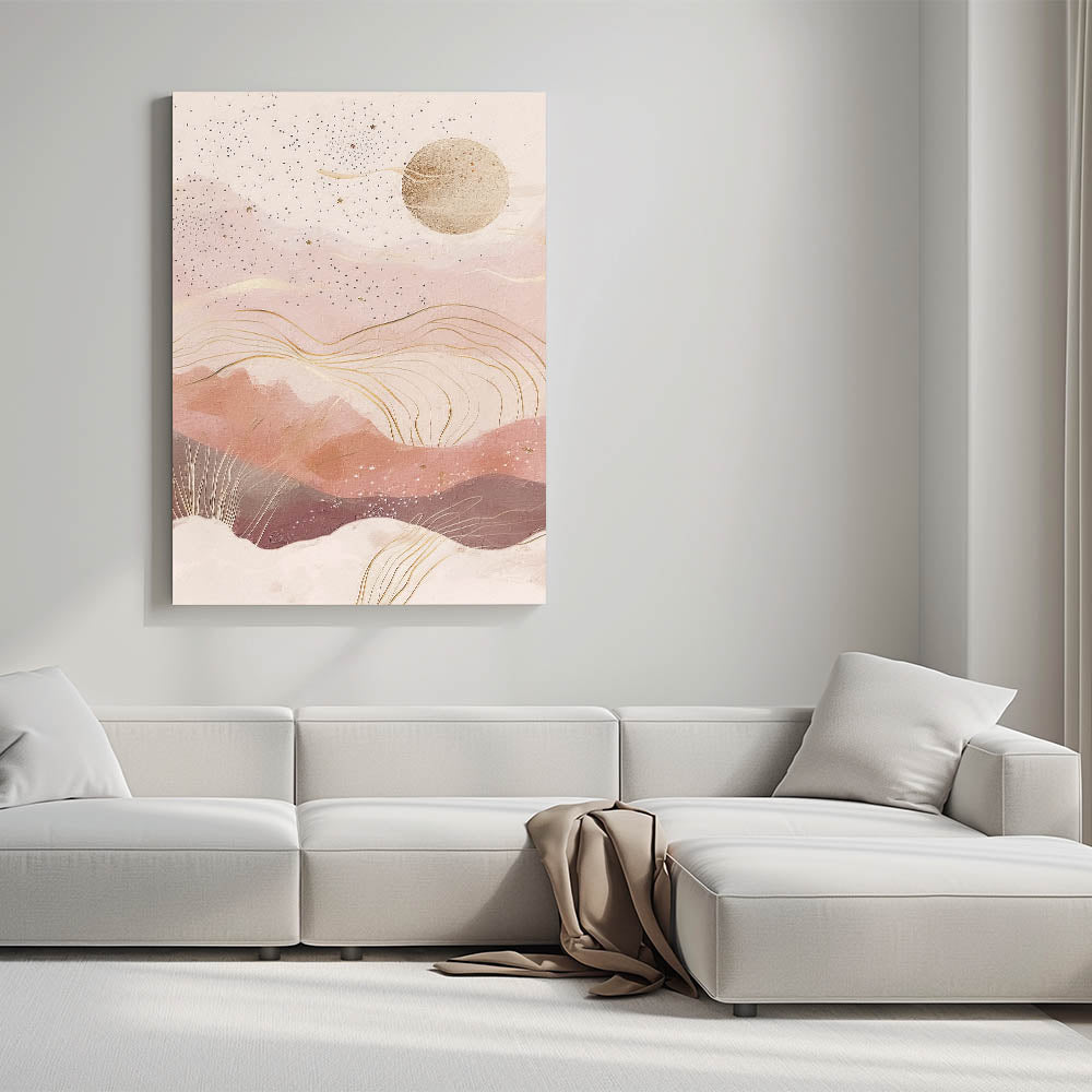 Elevate your space with this dreamy abstract landscape art that features soft pink and beige tones, accented by a golden moon and scattered stars. This enchanting artwork combines celestial and natural elements, capturing the serene beauty of a starlit night over rolling hills. The gentle curves and warm hues evoke a sense of calm and wonder, making it perfect for those who appreciate a peaceful yet sophisticated decor.