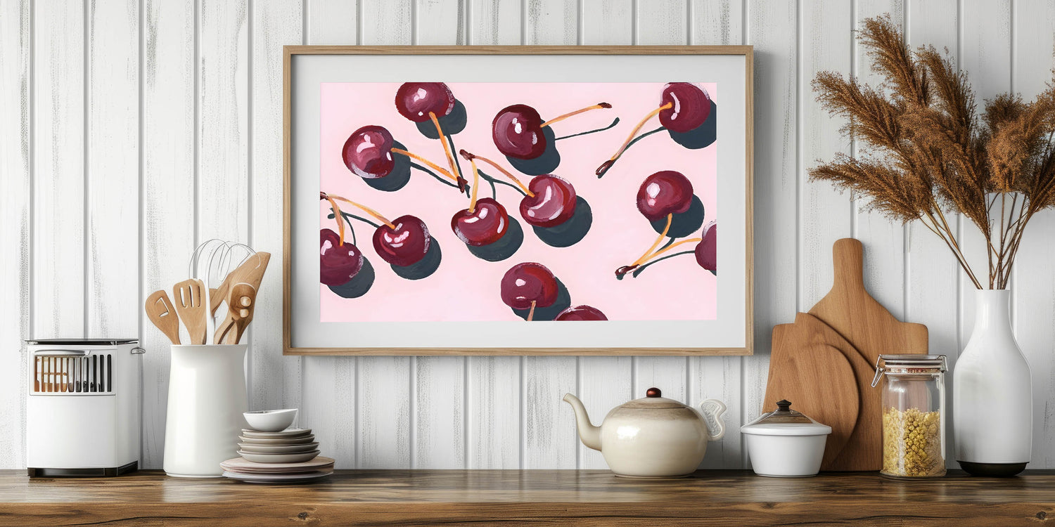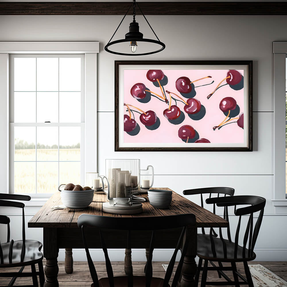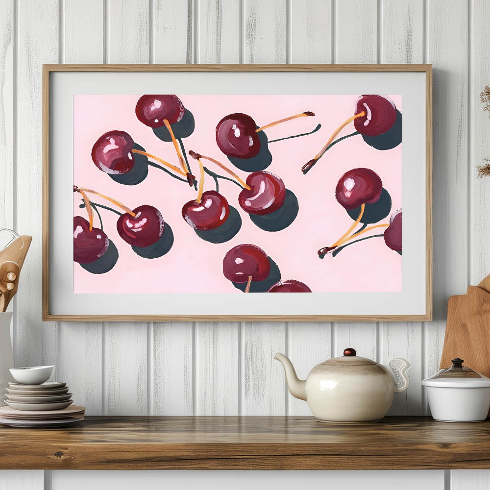 Bring a touch of elegance to your space with this fruit-themed wall art, showcasing beautifully painted cherries on a soft pink backdrop. The rich burgundy tones and delicate brushstrokes give this piece a refined yet playful charm, making it an ideal fruit illustration print for modern kitchens, dining areas, and cafés.