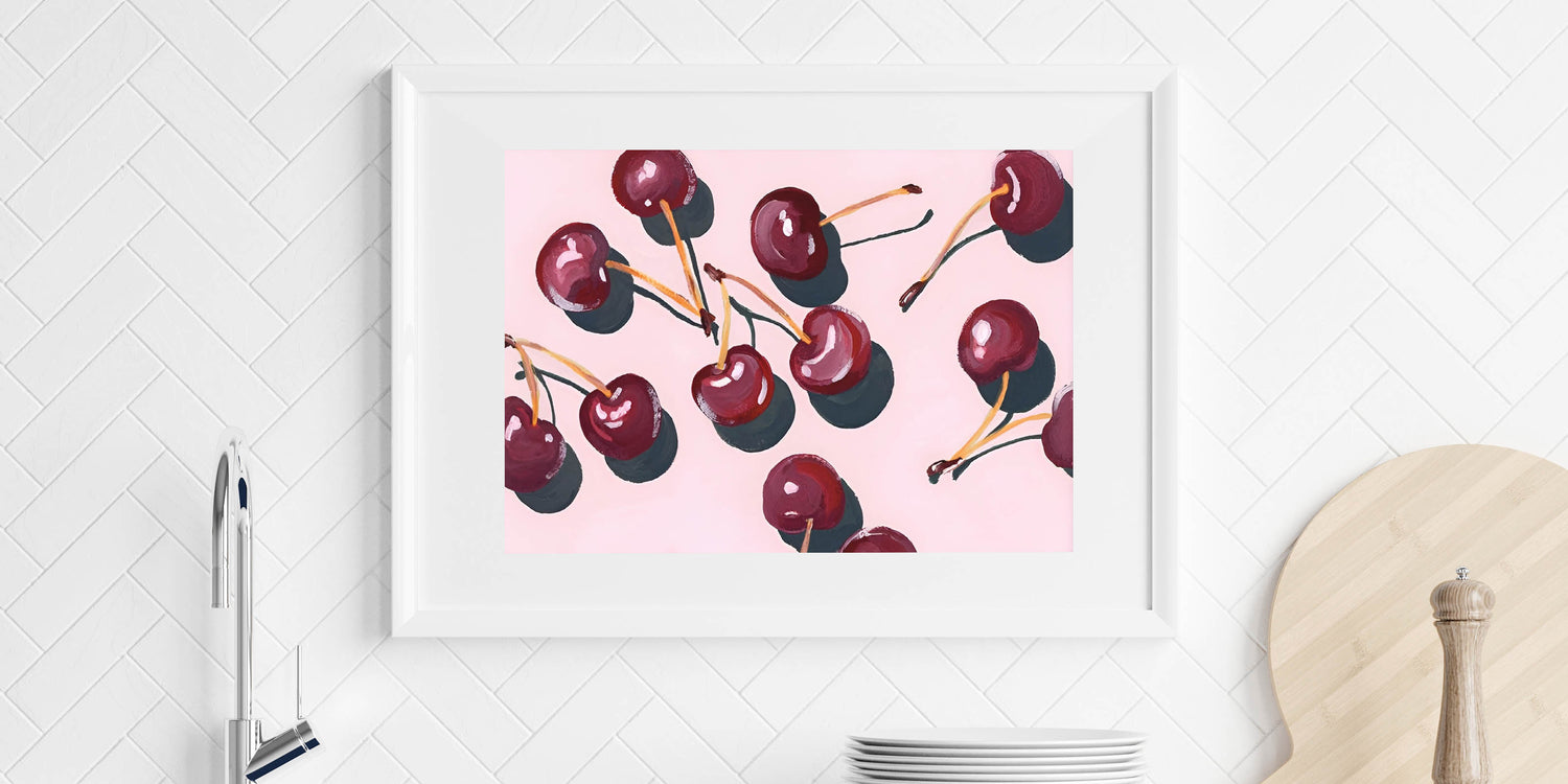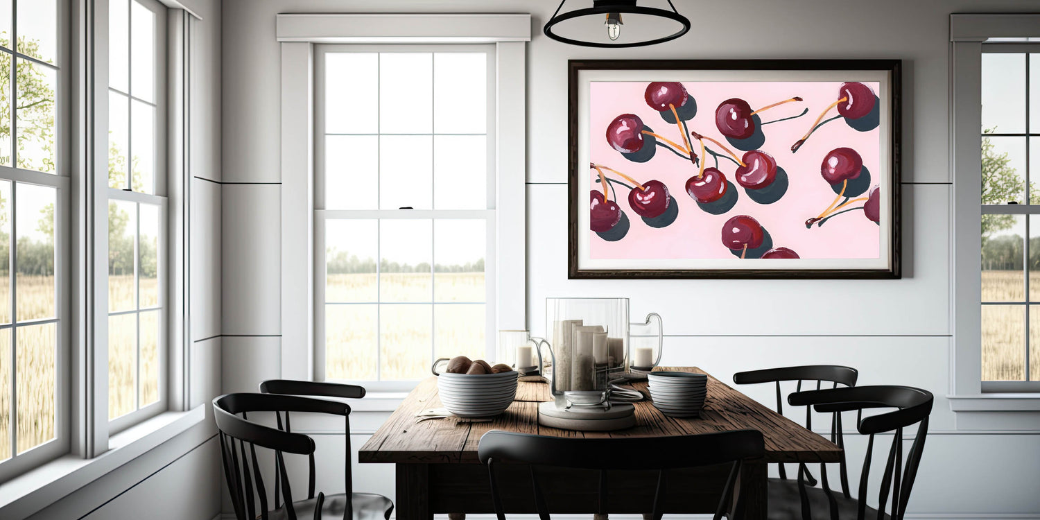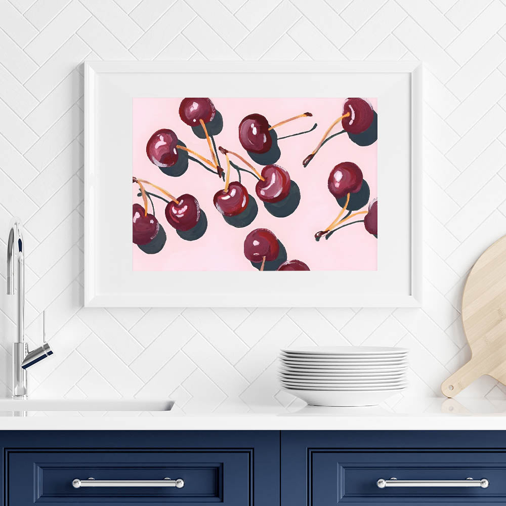 Bring a touch of elegance to your space with this fruit-themed wall art, showcasing beautifully painted cherries on a soft pink backdrop. The rich burgundy tones and delicate brushstrokes give this piece a refined yet playful charm, making it an ideal fruit illustration print for modern kitchens, dining areas, and cafés.